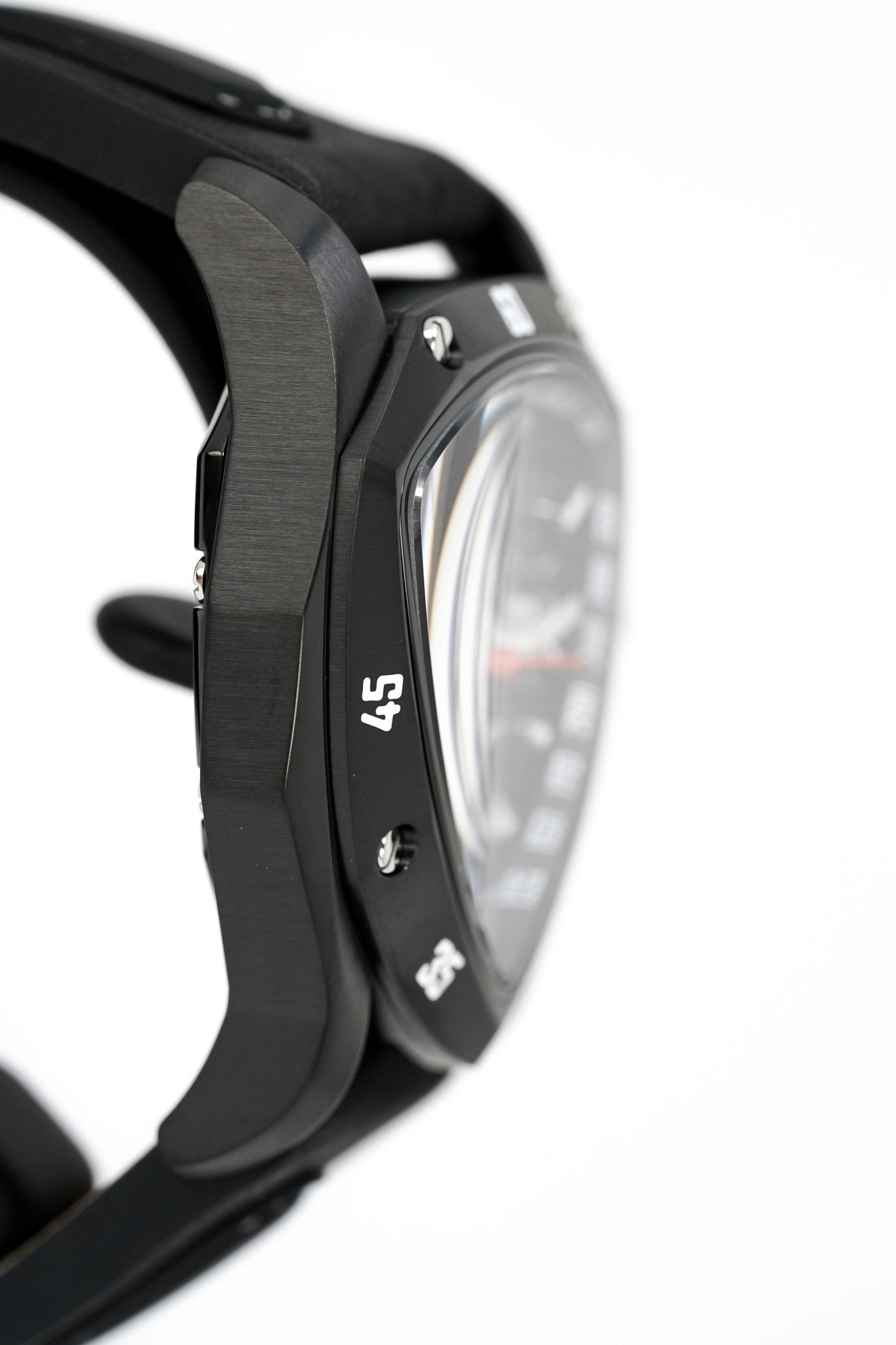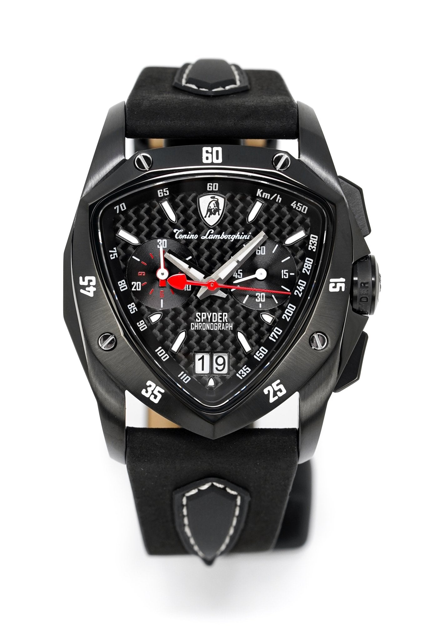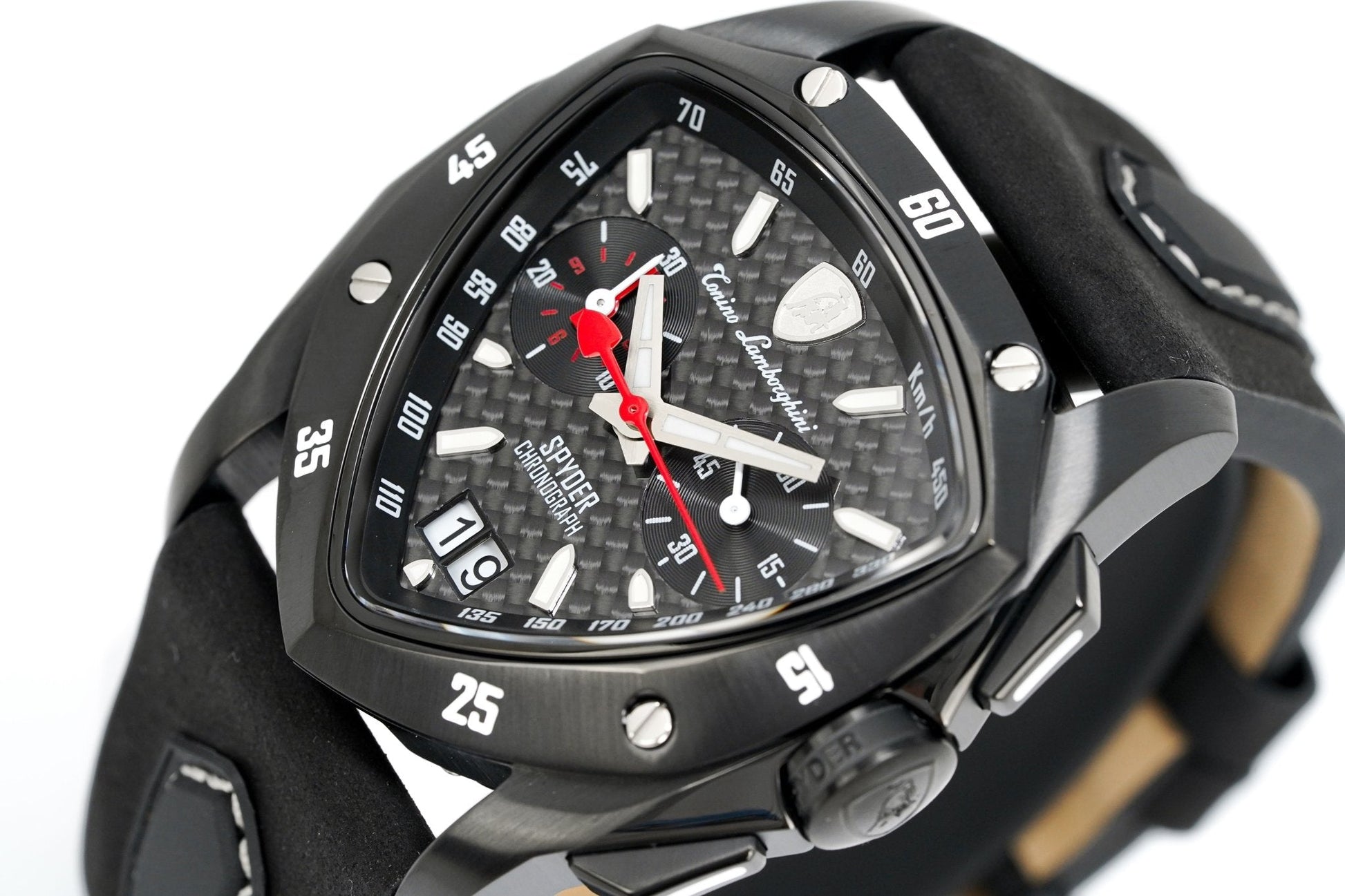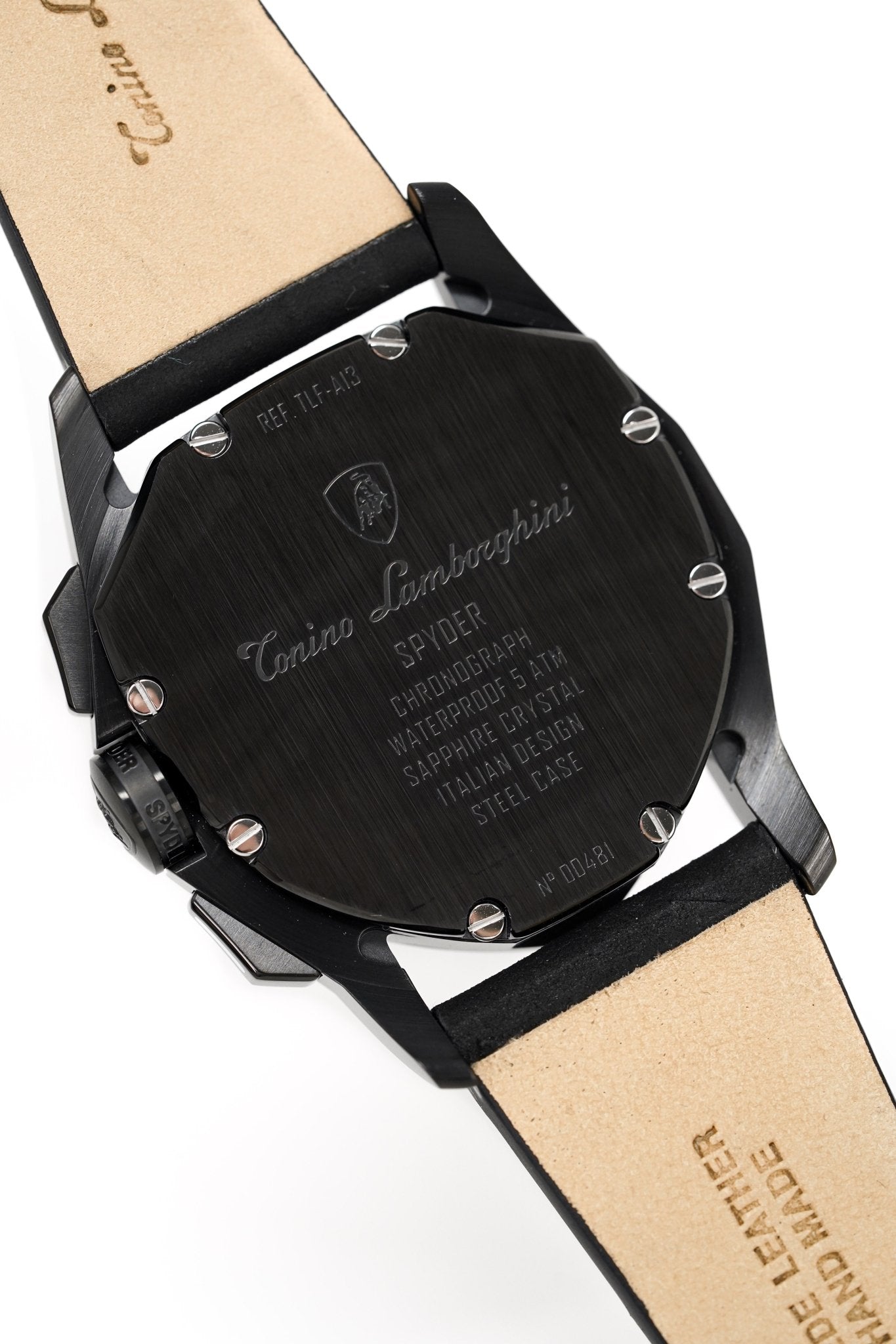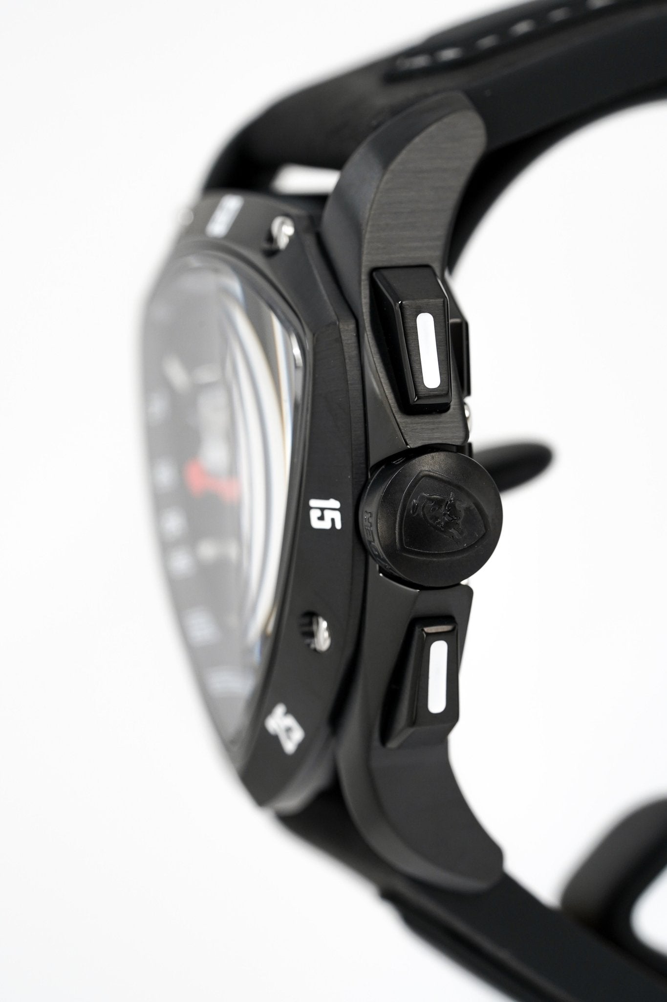 44mm x 40mm x 12mm Black PVD 316L Stainless Steel Case with a Polished and Satin Finish - Black PVD Stainless Steel Bezel with Polished Screws - Sapphire Crystal with Anti-Reflective Coating - Brushed Black PVD Stainless Steel Push/Pull Crown with Tonino Lamborghini Logo Engraved - Chronograph Pusher System - Solid Caseback.