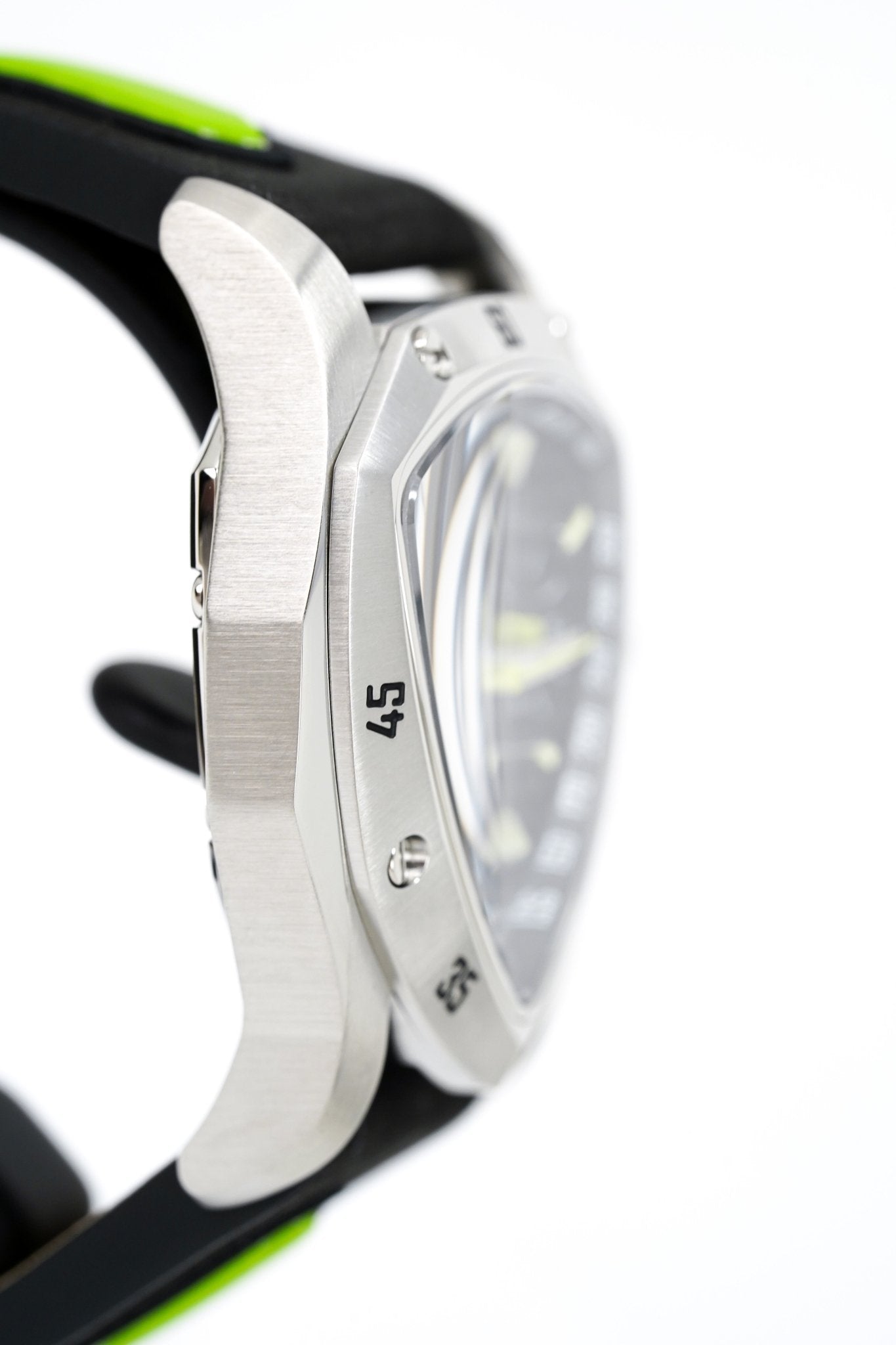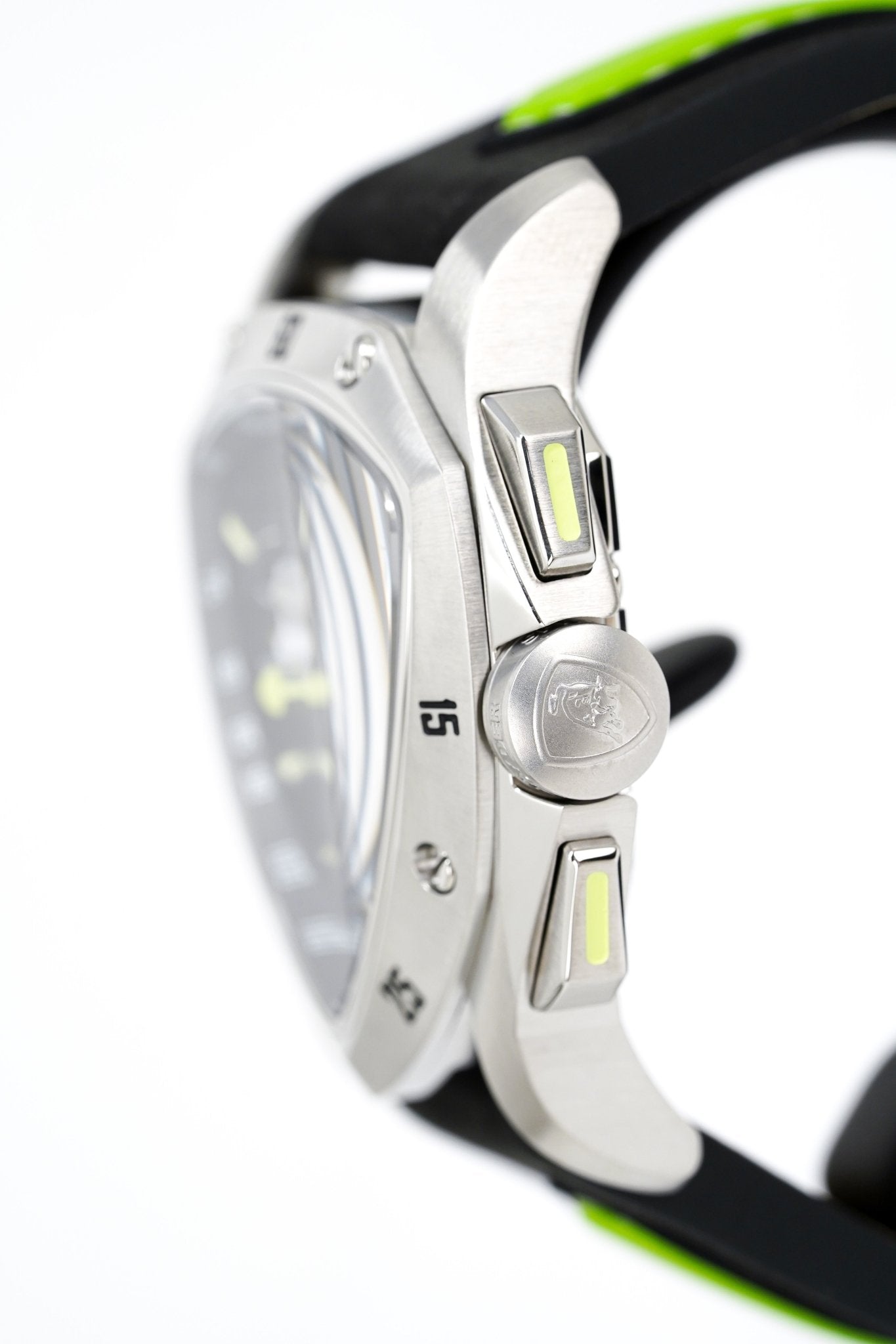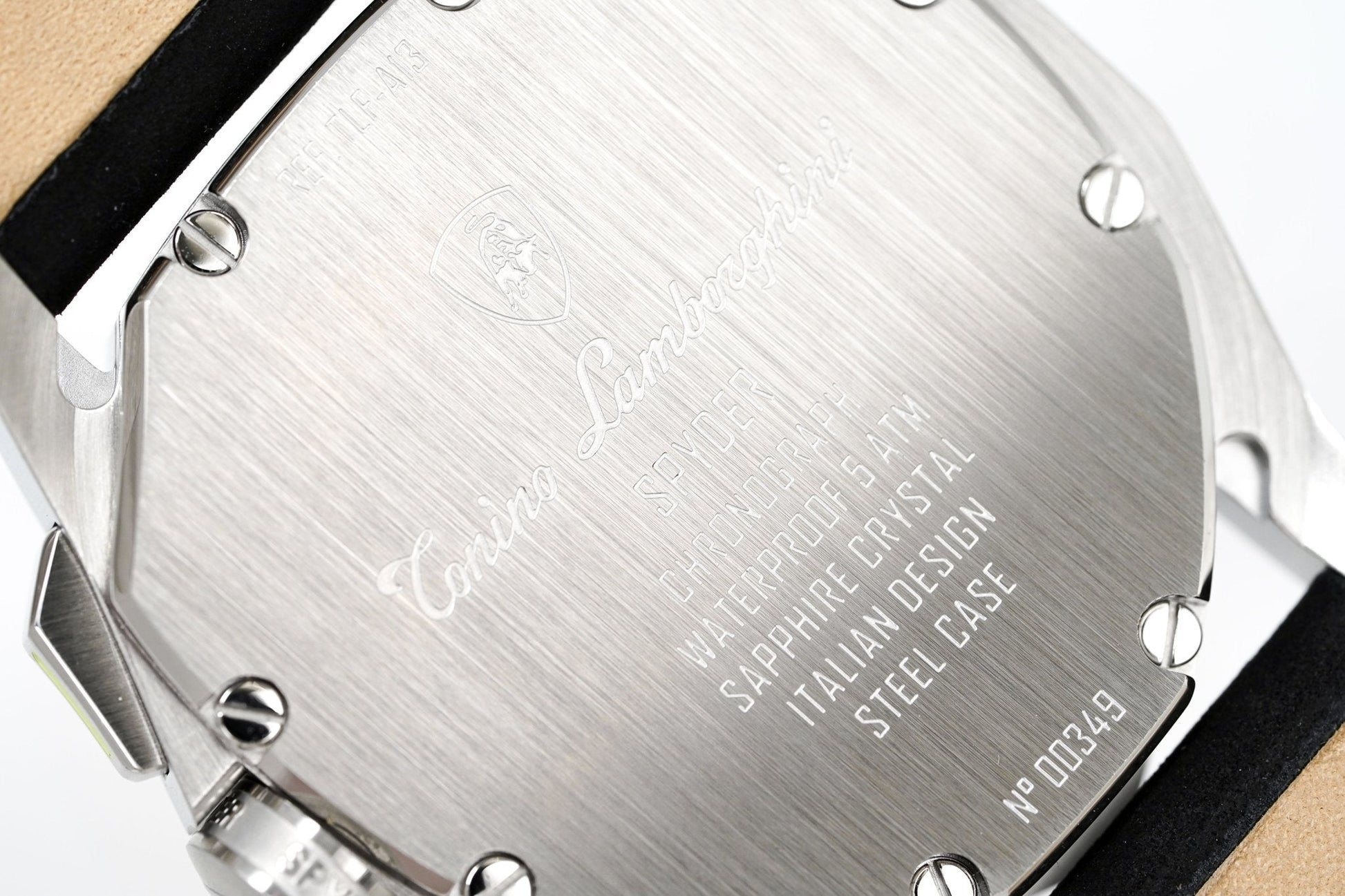 44mm x 40mm x 12mm 316L Stainless Steel Case with a Polished and Satin Finish - Stainless Steel Bezel with Polished Screws - Sapphire Crystal with Anti-Reflective Coating - Brushed Stainless Steel Push/Pull Crown with Tonino Lamborghini Logo Engraved - Chronograph Pusher System - Solid Caseback.