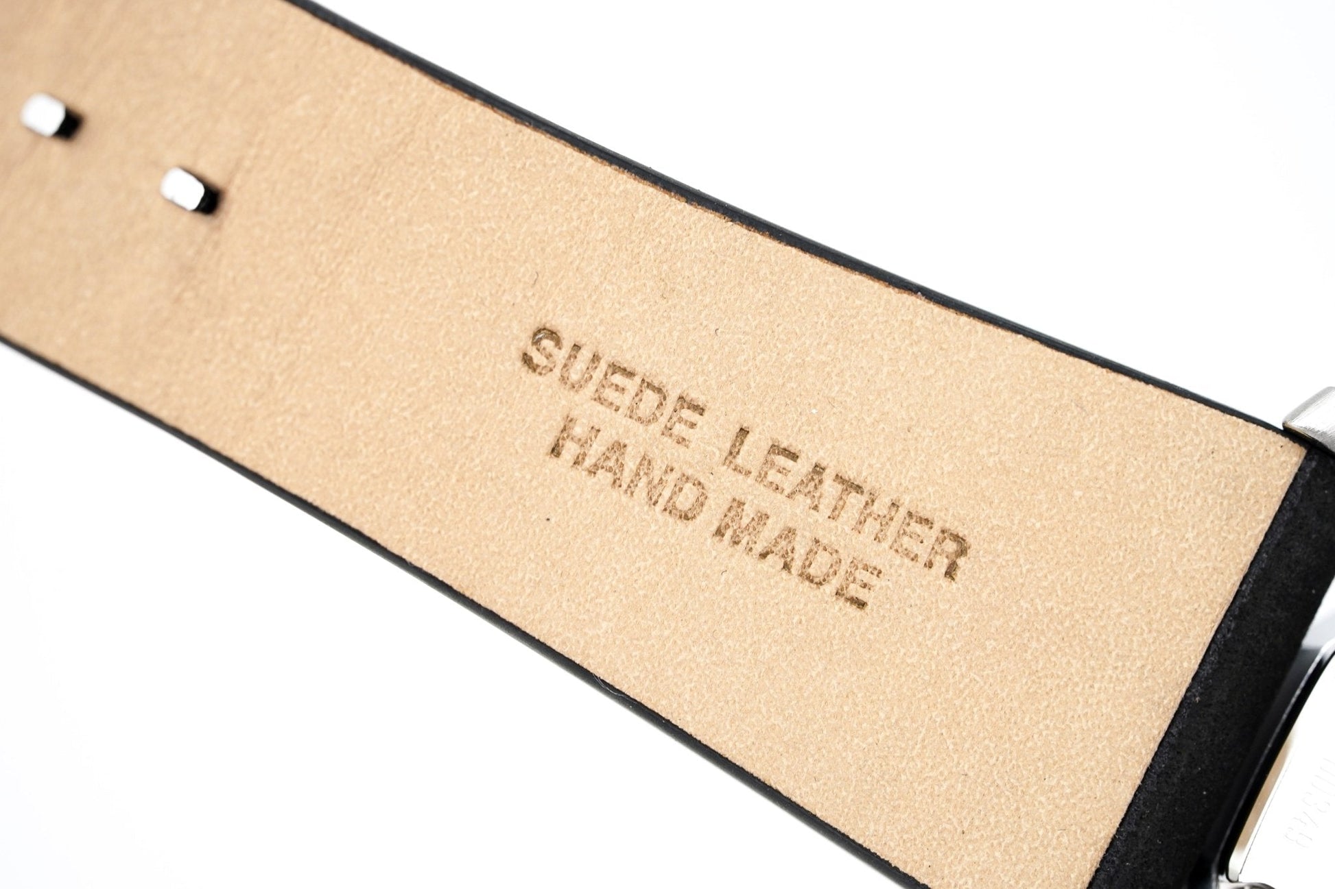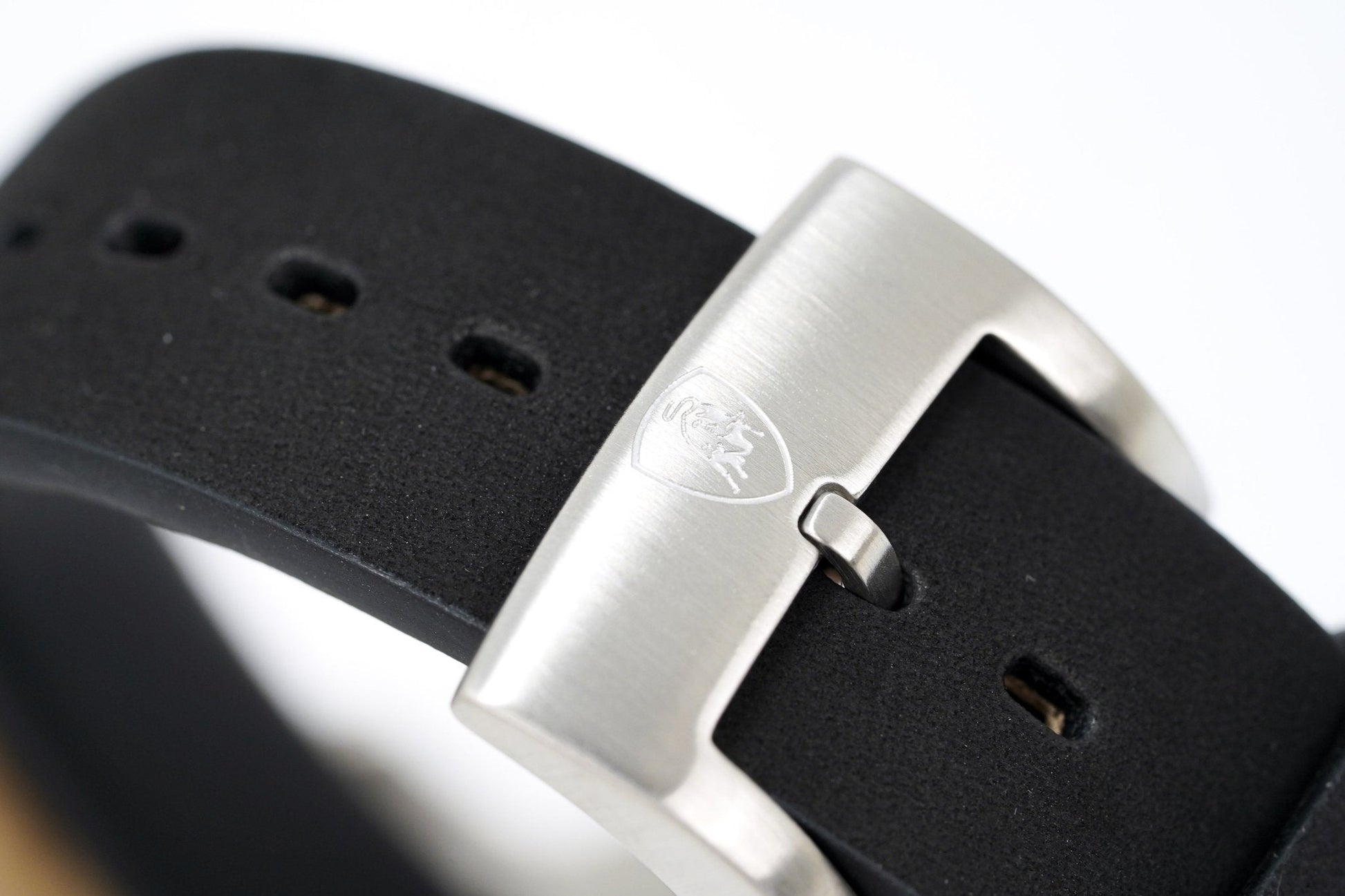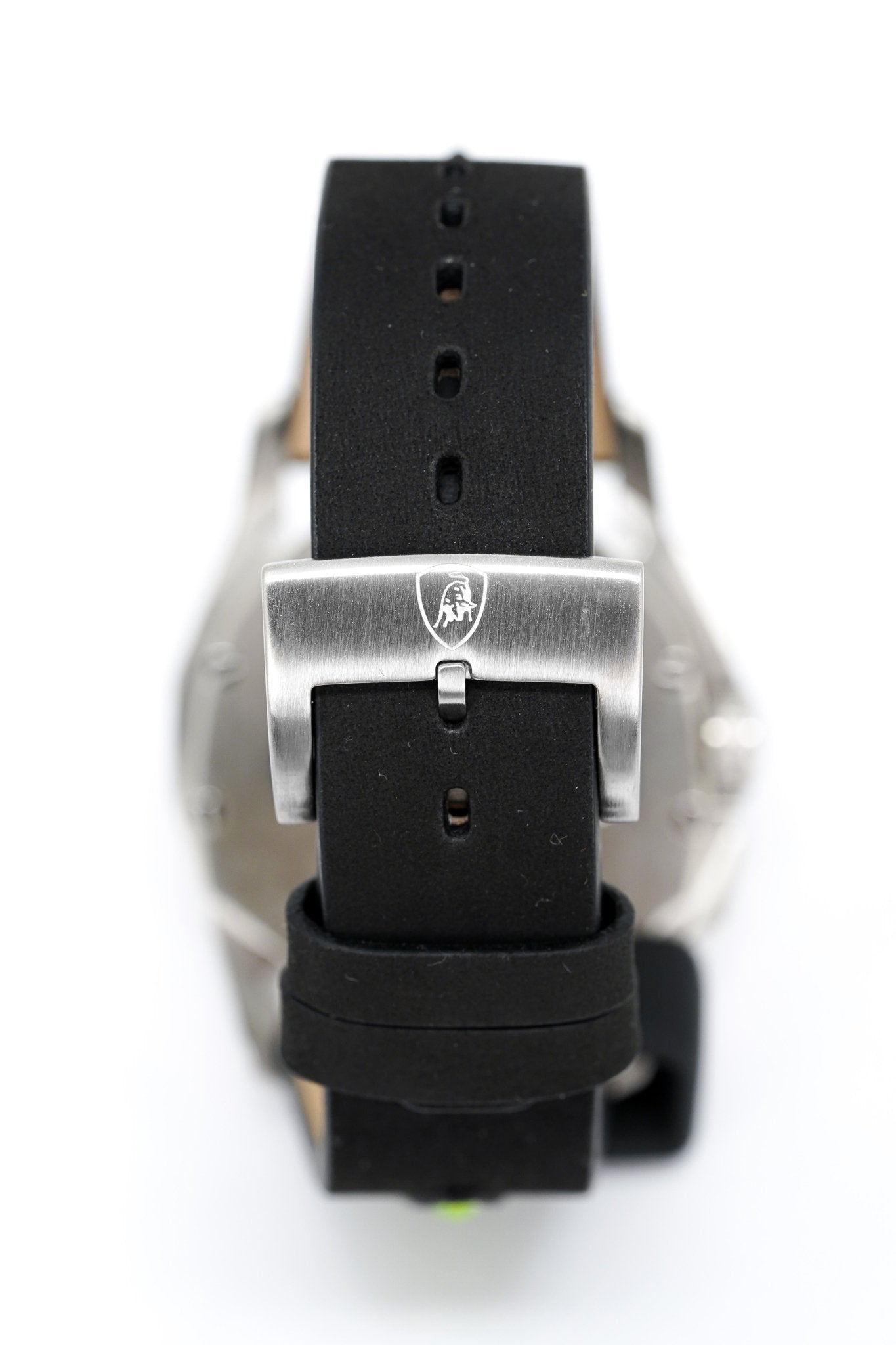 24/18mm x 18cm Black Suede Leather Strap with White Stitching and Green Rubber Inserts - 316L Stainless Steel Tang Buckle with Tonino Lamborghini Engraved on the Buckle.