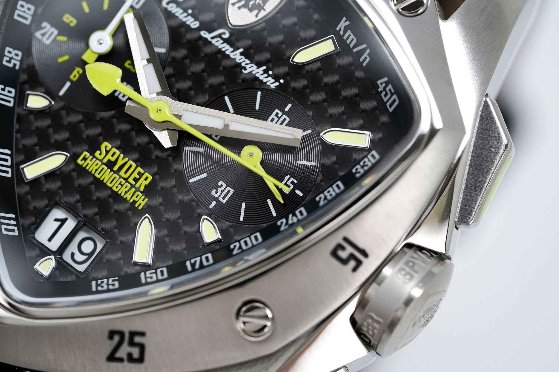 Black Carbon Fibre Textured Dial - Luminous Stainless Steel Hands and Green Hour Markers - Tonino Lamborghini Shield at 12 O'Clock - Date at 6 O'Clock - 2 Sub-Dials.