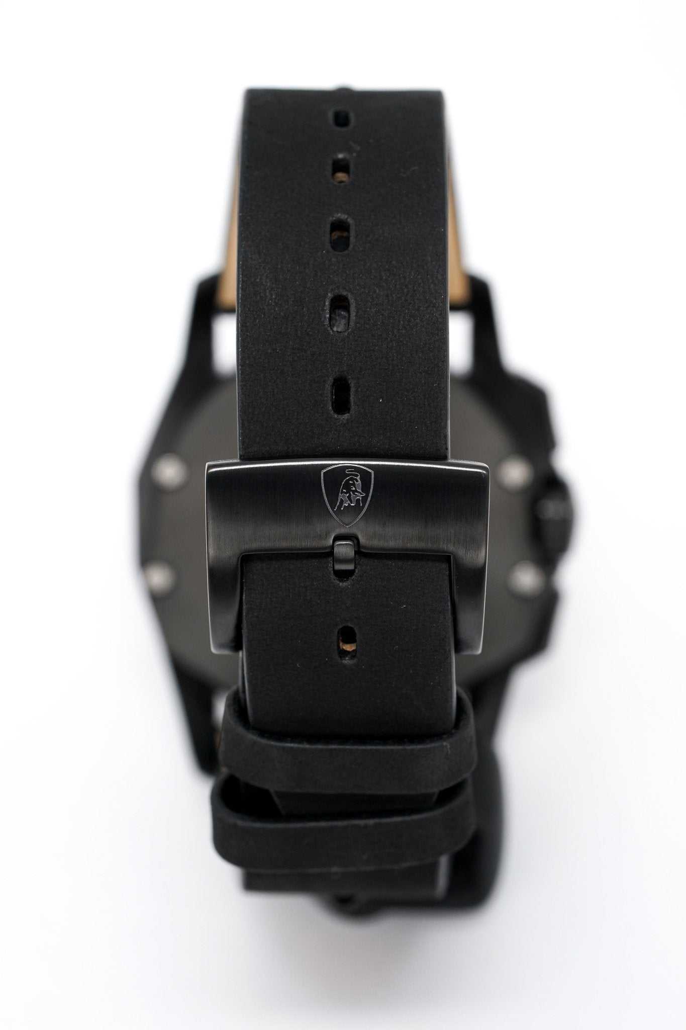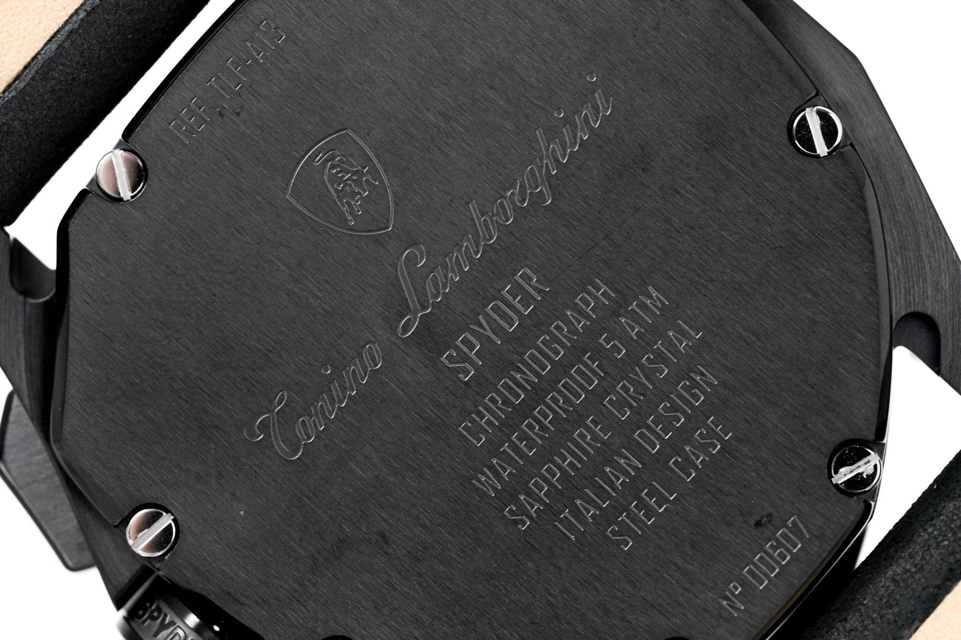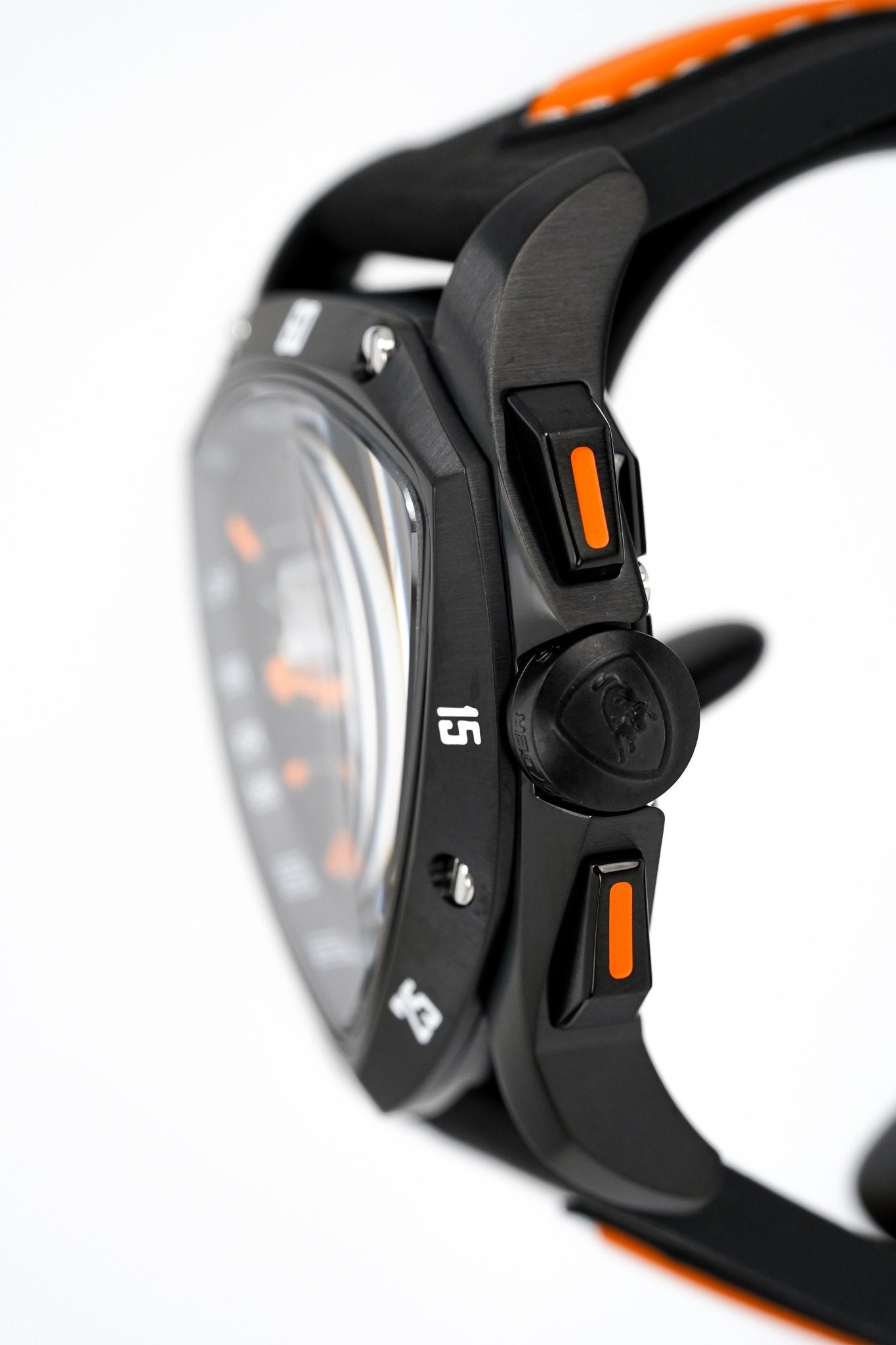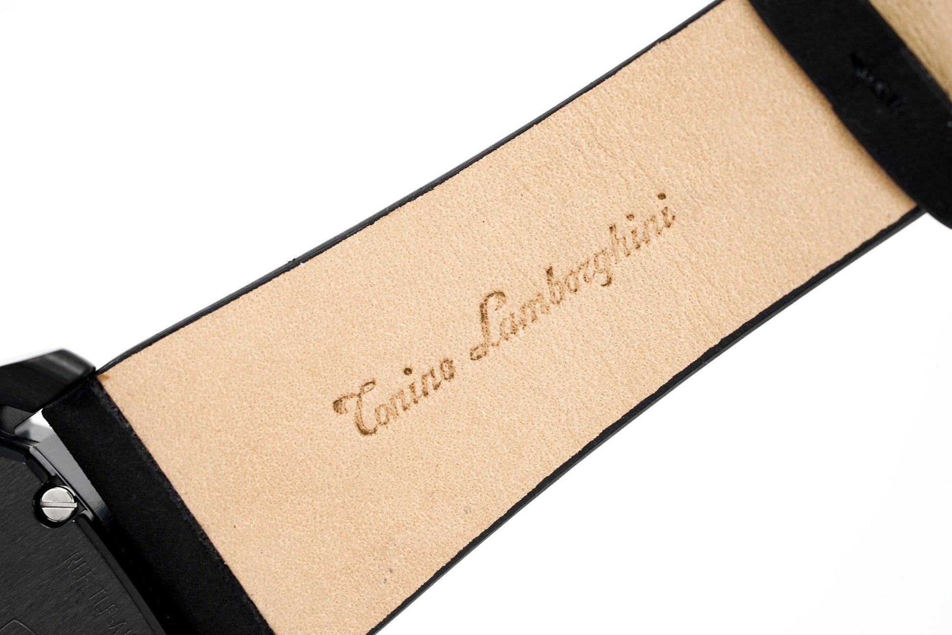 44mm x 40mm x 12mm Black PVD 316L Stainless Steel Case with a Polished and Satin Finish - Black PVD Stainless Steel Bezel with Polished Screws - Sapphire Crystal with Anti-Reflective Coating - Brushed Black PVD Stainless Steel Push/Pull Crown with Tonino Lamborghini Logo Engraved - Chronograph Pusher System - Solid Caseback.