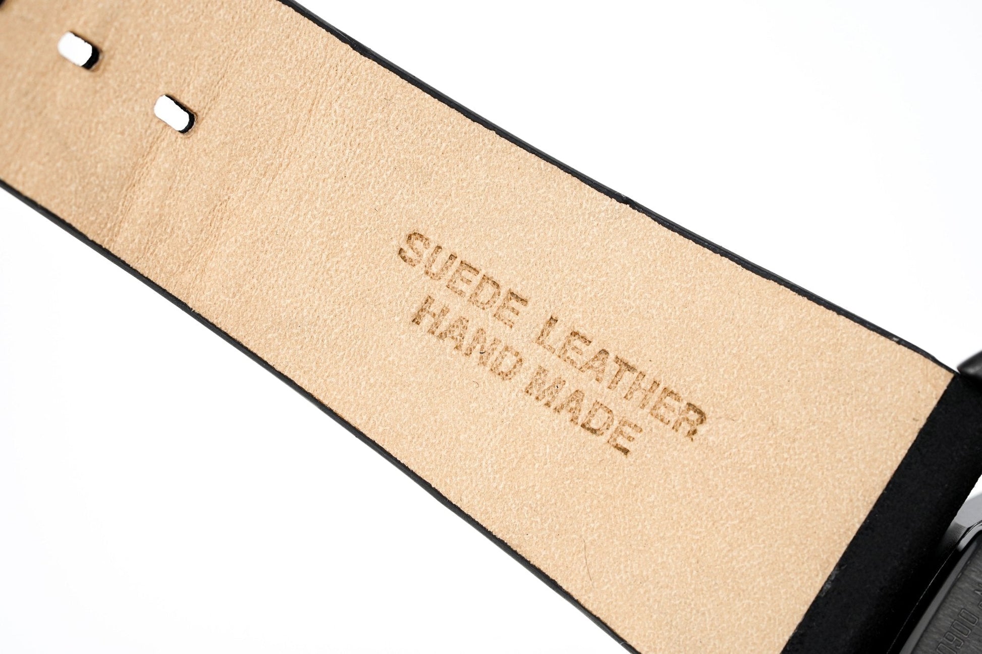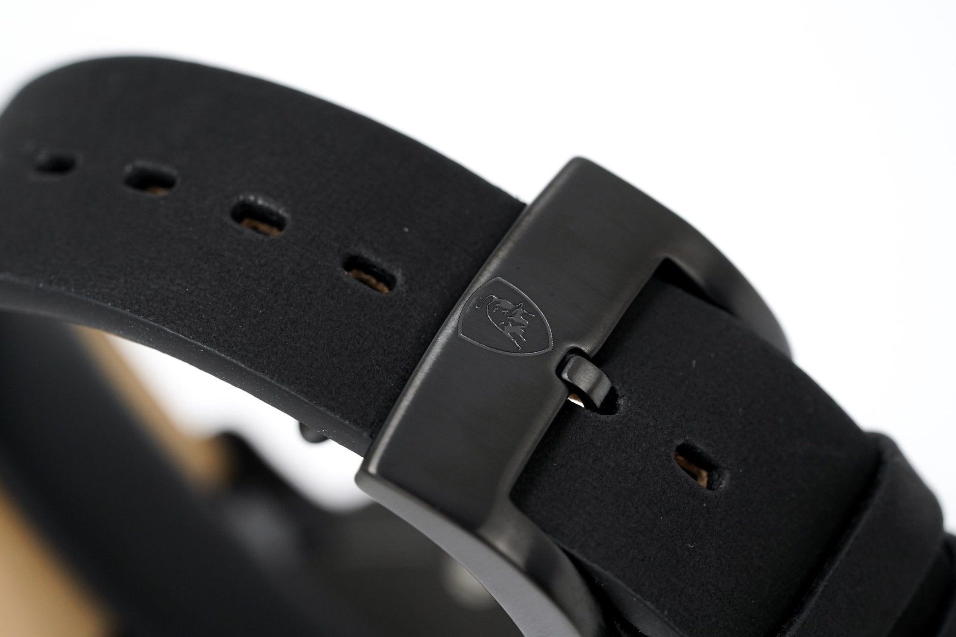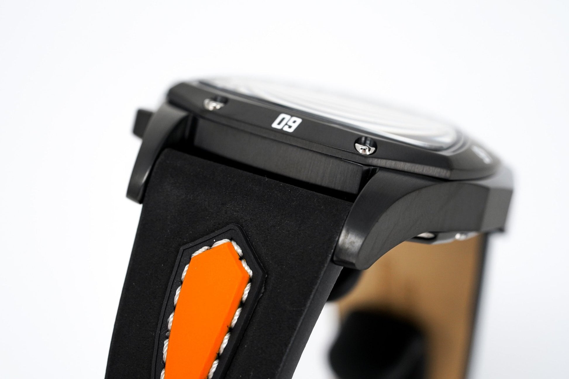 24/18mm x 18cm Black Suede Leather Strap with White Stitching and Orange Rubber Inserts - 316L Stainless Steel Tang Buckle with Tonino Lamborghini Engraved on the Buckle.