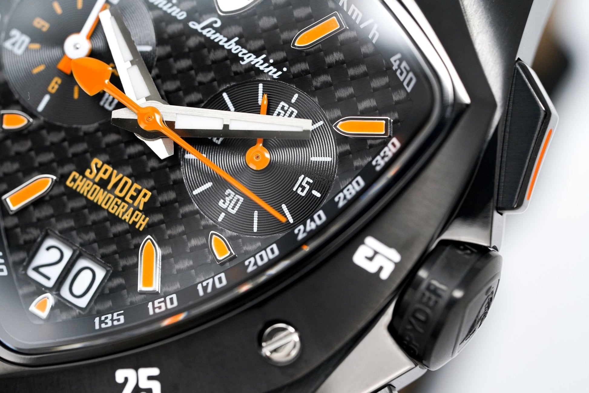 Black Carbon Fibre Textured Dial - Luminous Stainless Steel Hands and Orange Hour Markers - Tonino Lamborghini Shield at 12 O'Clock - Date at 6 O'Clock - 2 Sub-Dials.