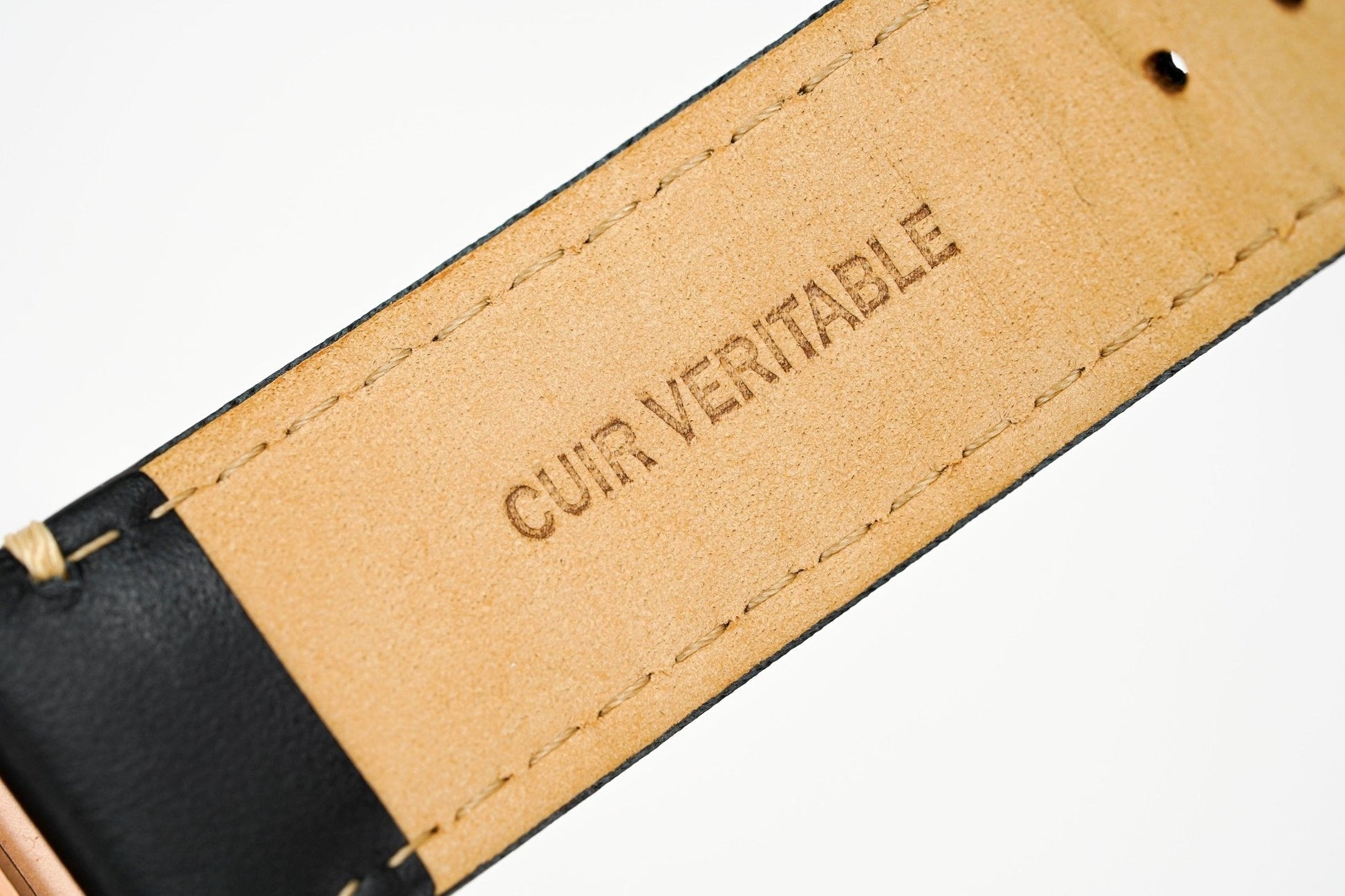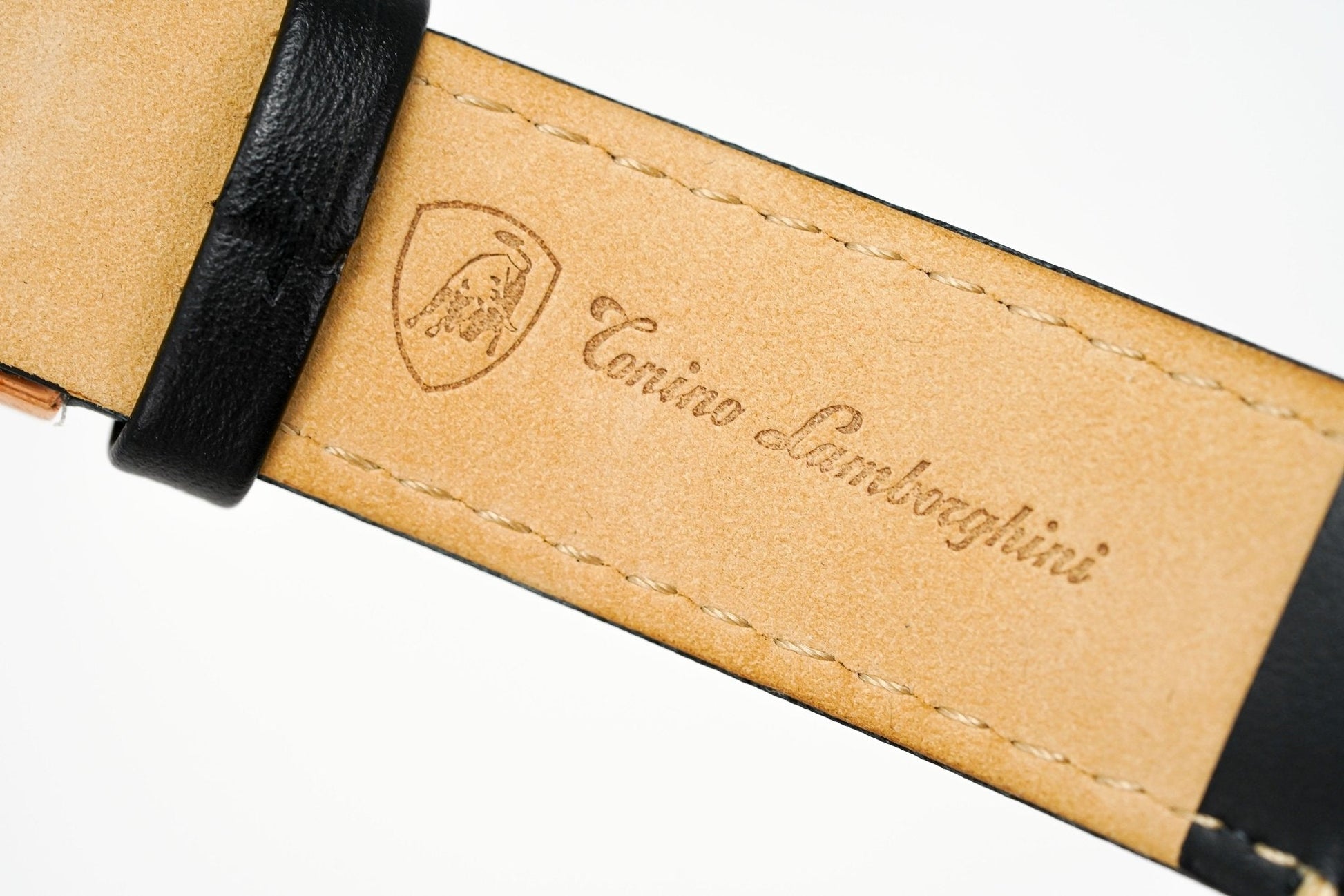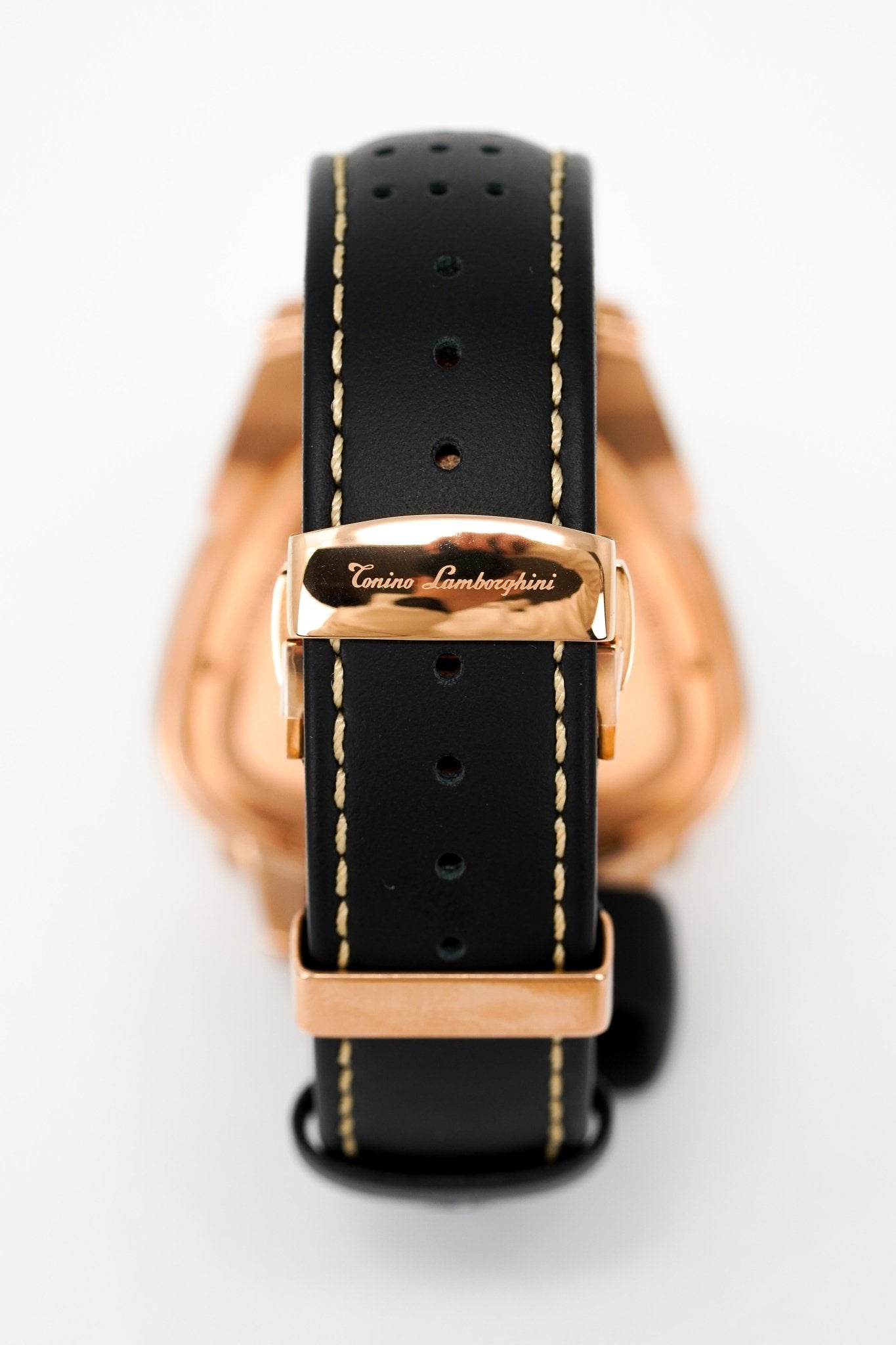 22mm Black Leather Strap with Rose Stitching and Holes - IP Rose Gold 316L Stainless Steel Deployment Buckle with Tonino Lamborghini Engraved on the Buckle.