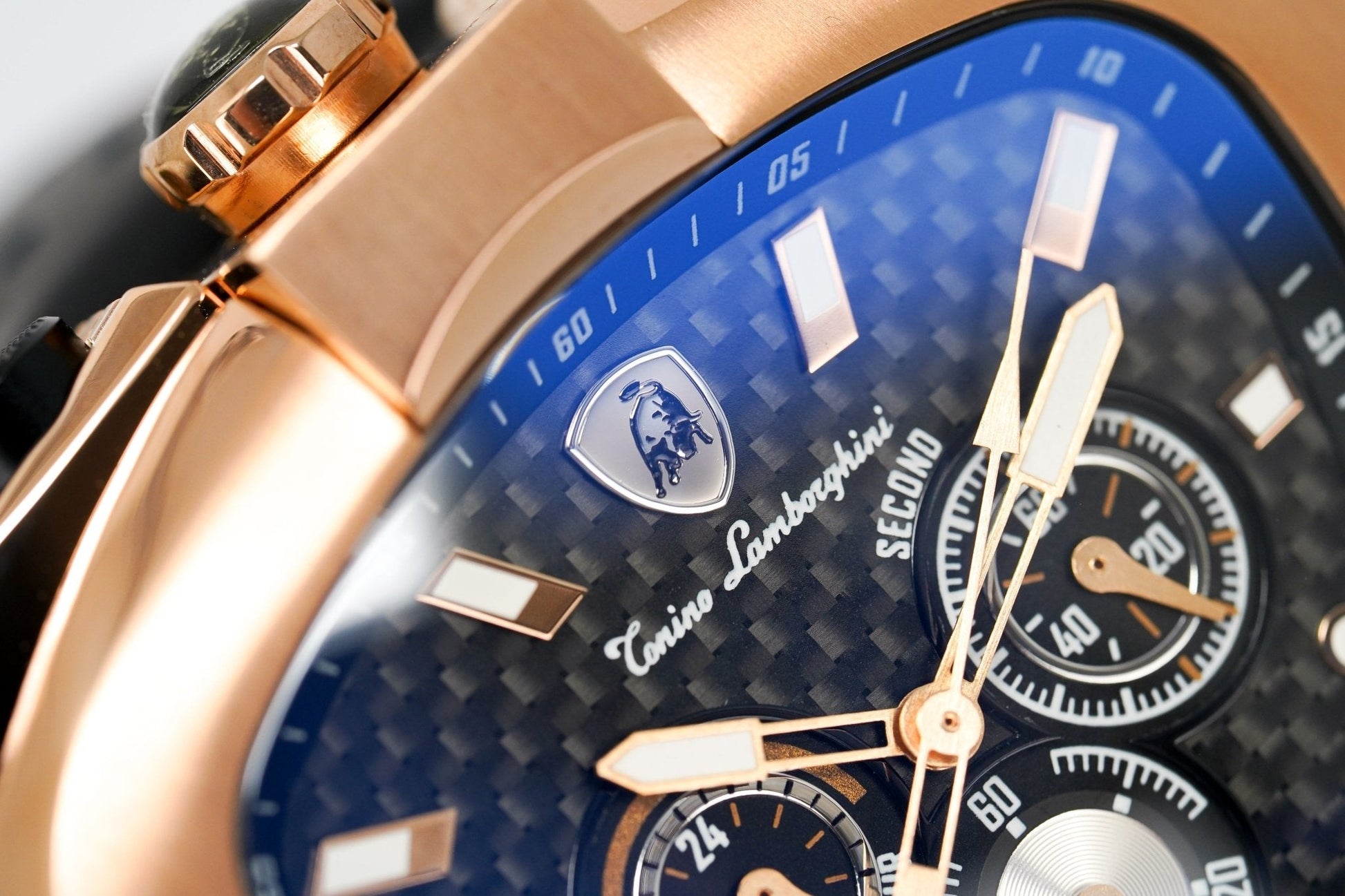 47mm x 53mm x 16mm IP Rose Gold 316L Stainless Steel Case with a Polished and Satin Finish - Sapphire Crystal with Anti-Reflective Coating - IP Rose Gold Stainless Steel Crown with Tonino Lamborghini Logo Engraved - Chronograph Start/Stop Buttons - Solid Caseback.