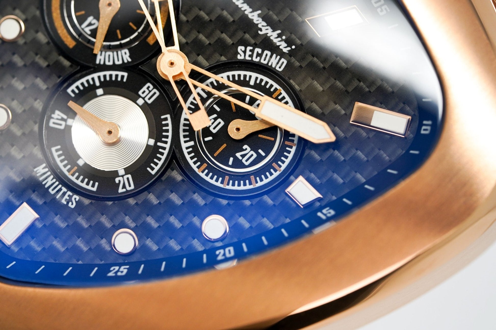 Black Carbon Fibre Textured Dial - Luminous IP Rose Gold Stainless Steel Hands and White/Rose Gold Hour Markers - Tonino Lamborghini Shield at 12 O'Clock - 3 Sub-Dials.