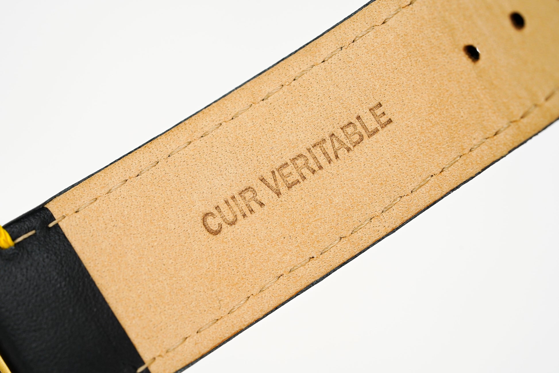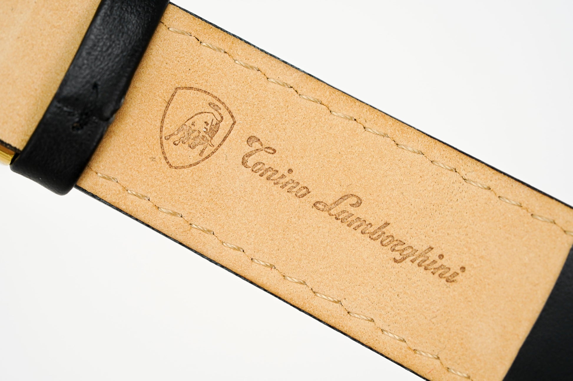 22mm Black Leather Strap with Yellow Stitching and Holes - IP Yellow Gold 316L Stainless Steel Deployment Buckle with Tonino Lamborghini Engraved on the Buckle.