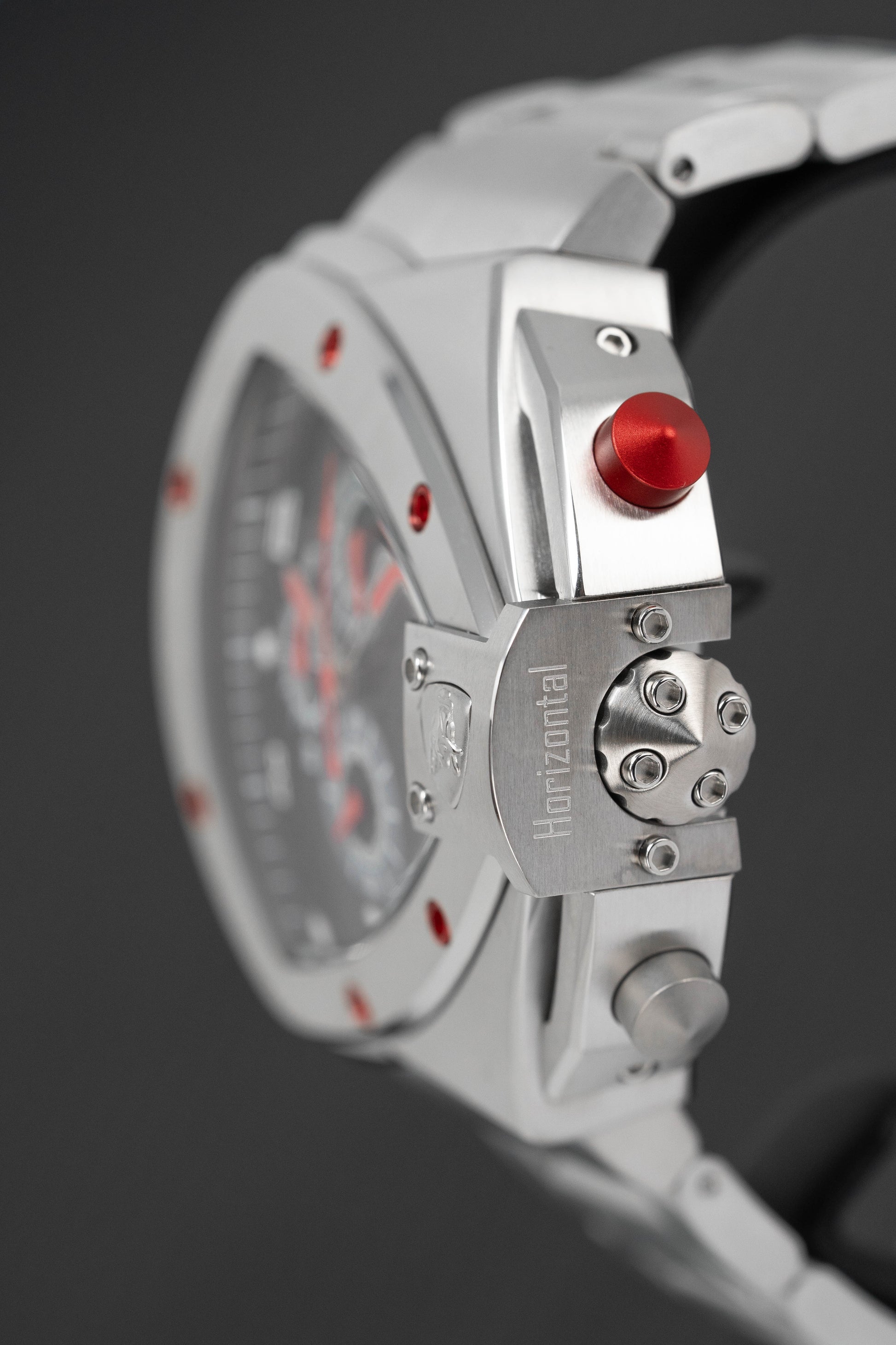 46.5mm x 45mm x 15mm 316L Stainless Steel Case with a Polished and Satin Finish - Stainless Steel Bezel with Polished Red Screws - Sapphire Crystal with Anti-Reflective Coating - Stainless Steel Crown Embellished with 8 Torx® screws - Chronograph Start/Stop Buttons - Solid Caseback.