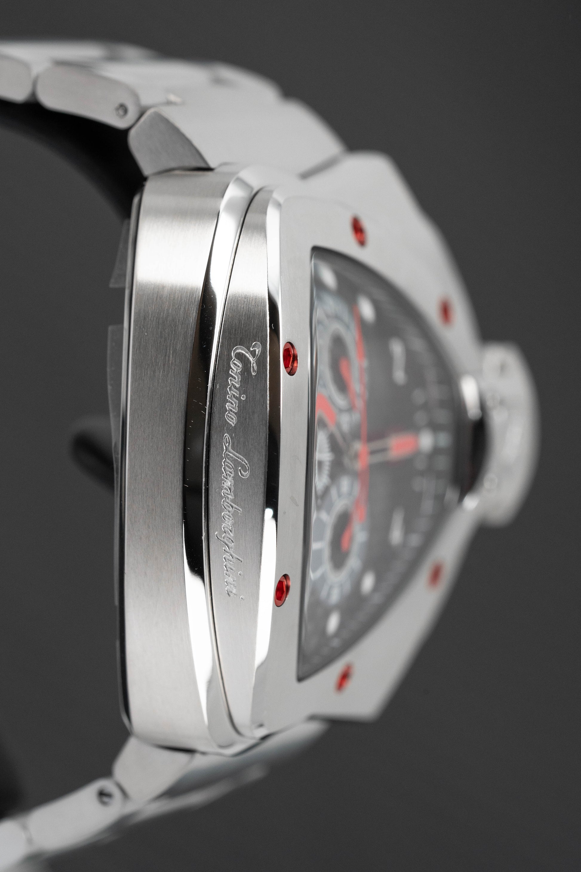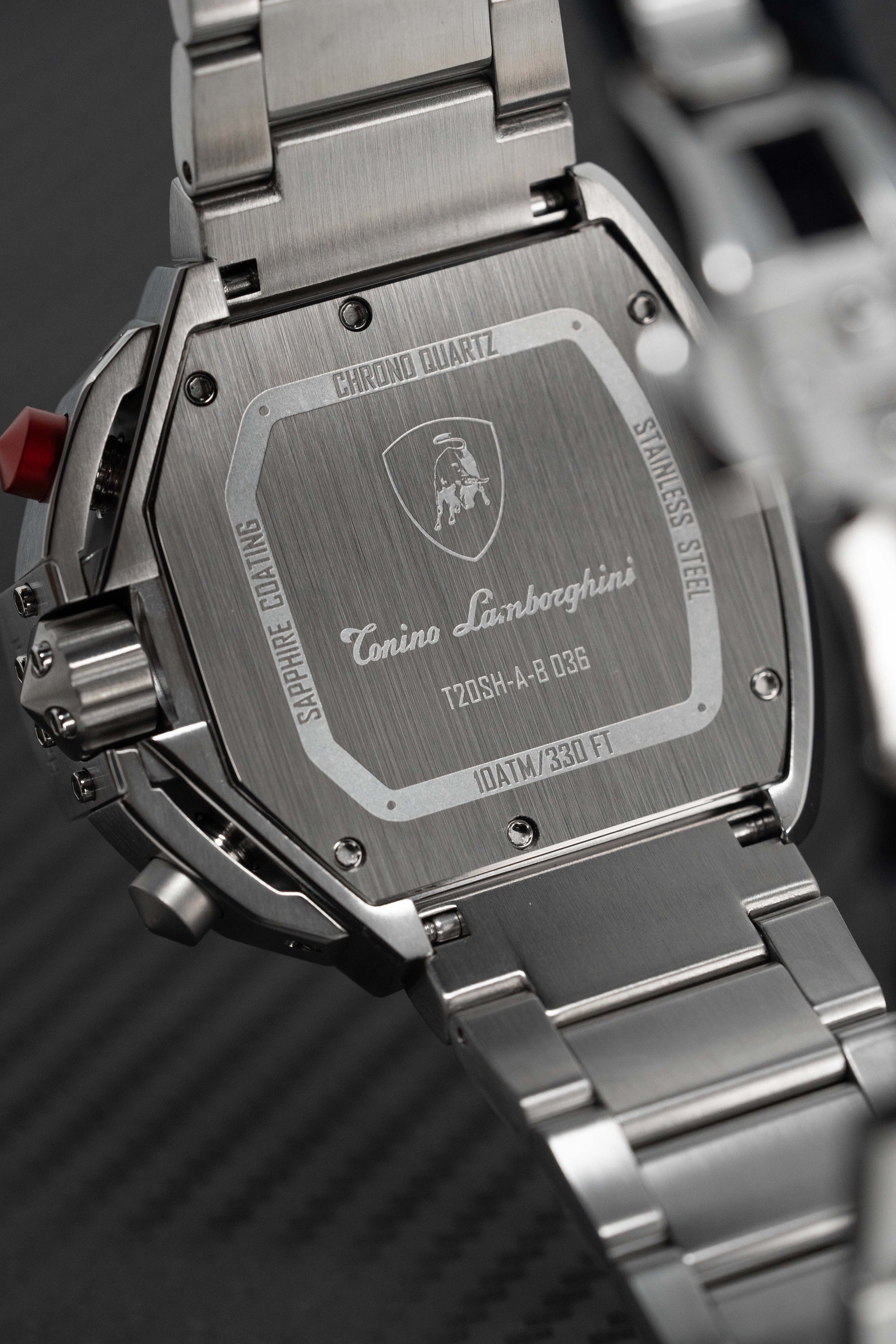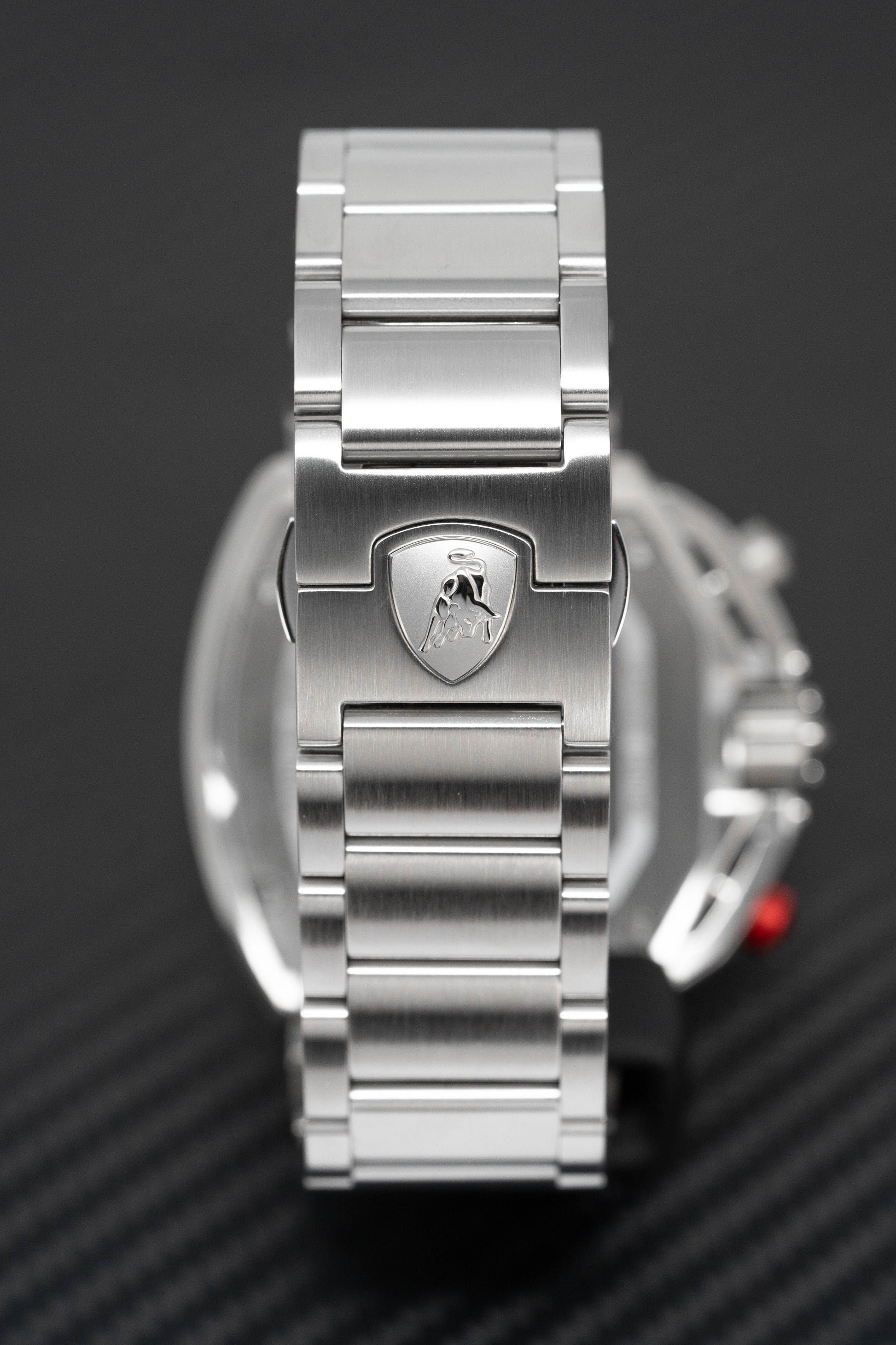 Stainless Steel Polished Bracelet with Stainless Steel Push Button Deployment Clasp. Tonino Lamborghini Engraved on the Buckle.Water Resistant to 100 Meters 10ATM.