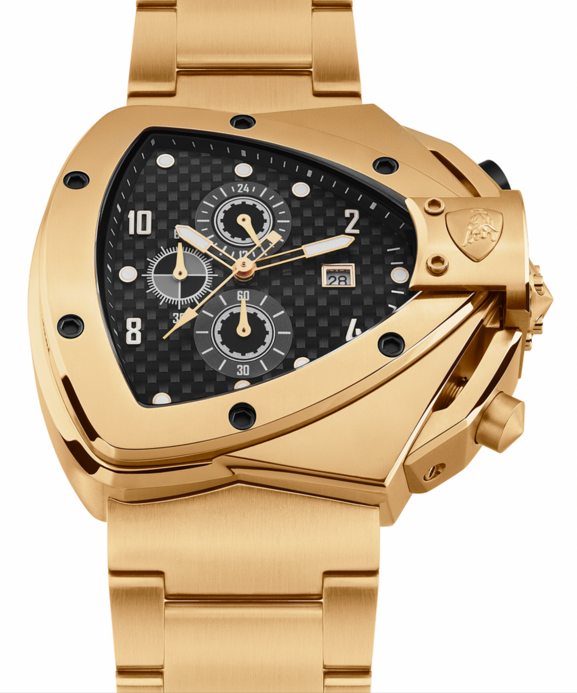 Black Carbon Fibre Textured Dial - Luminous IP Yellow Gold Stainless Steel Hands and White Hour Markers - Tonino Lamborghini Shield on Bezel - 3 Sub-Dials - Date at 3 O'Clock.