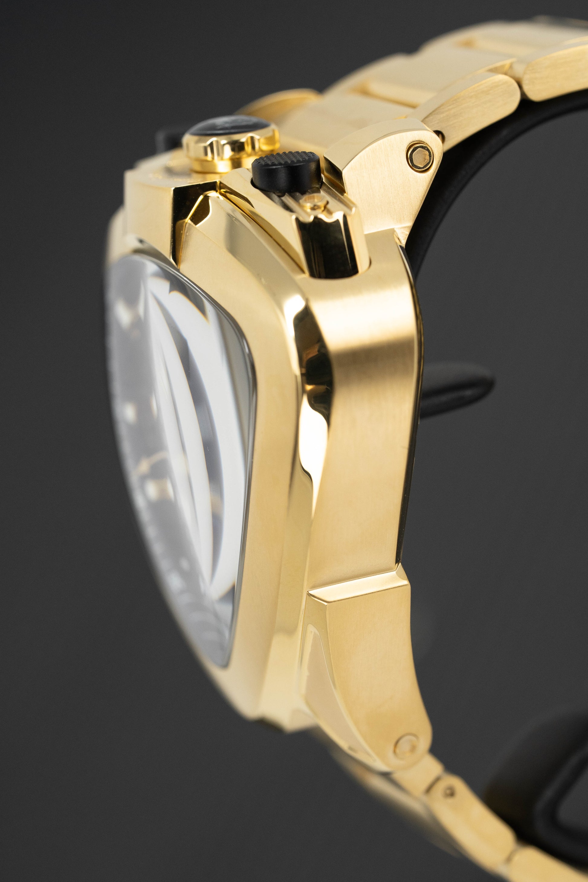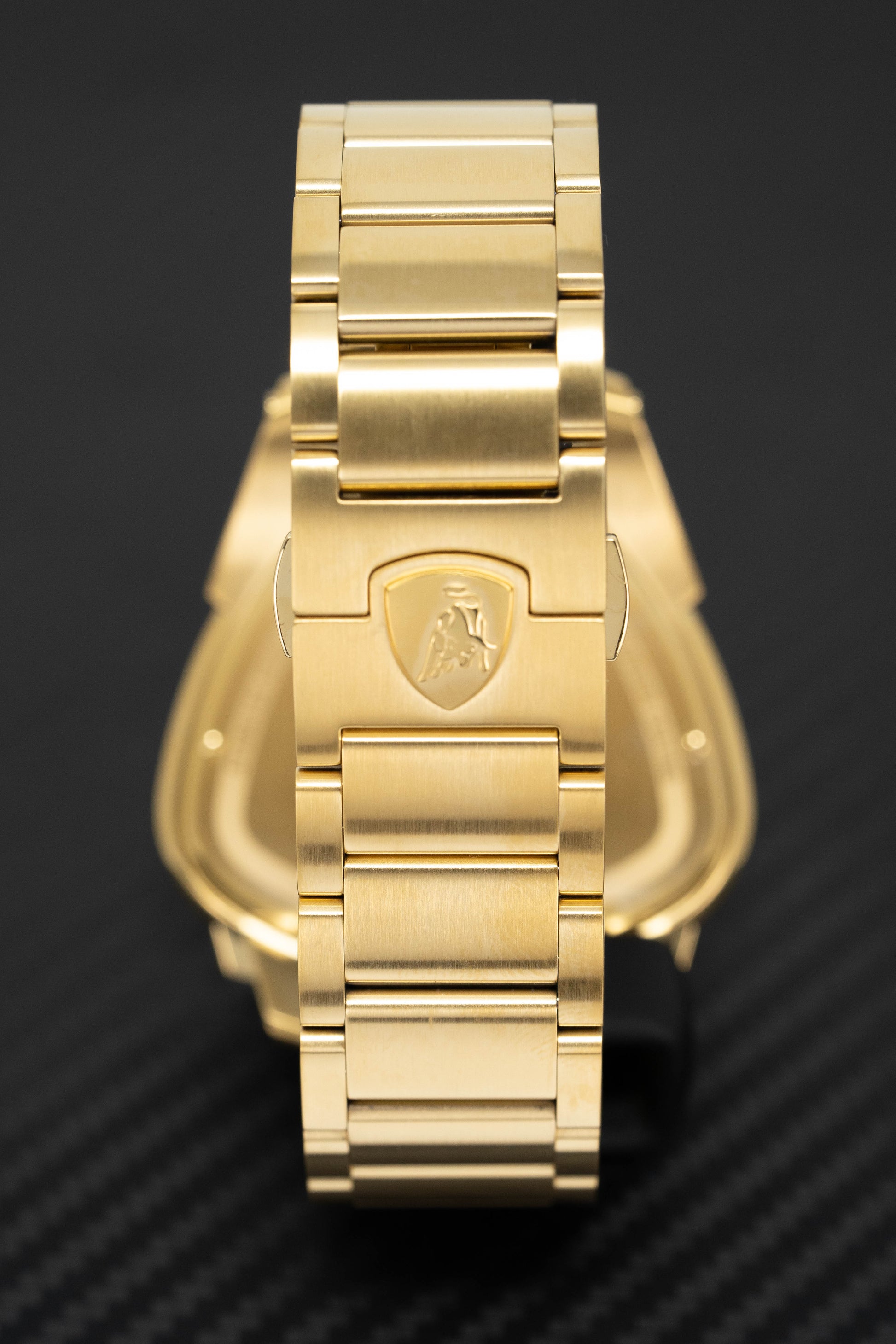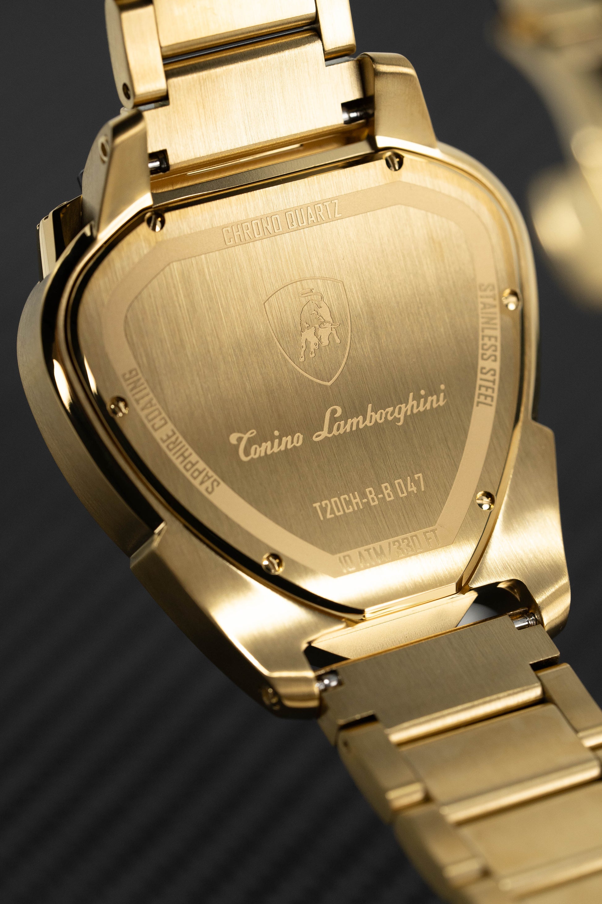 47mm x 53mm x 16mm 316L Gold Stainless Steel Case with a Polished and Satin Finish - Sapphire Crystal with Anti-Reflective Coating - Gold Stainless Steel Crown with Tonino Lamborghini Logo Engraved - Chronograph Start/Stop Buttons - Solid Caseback.