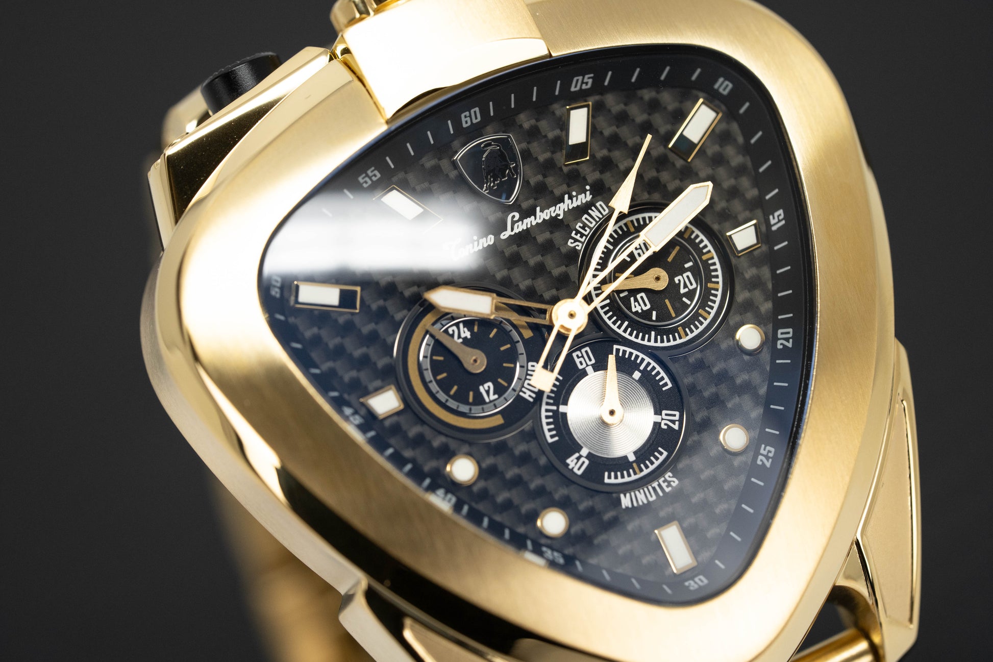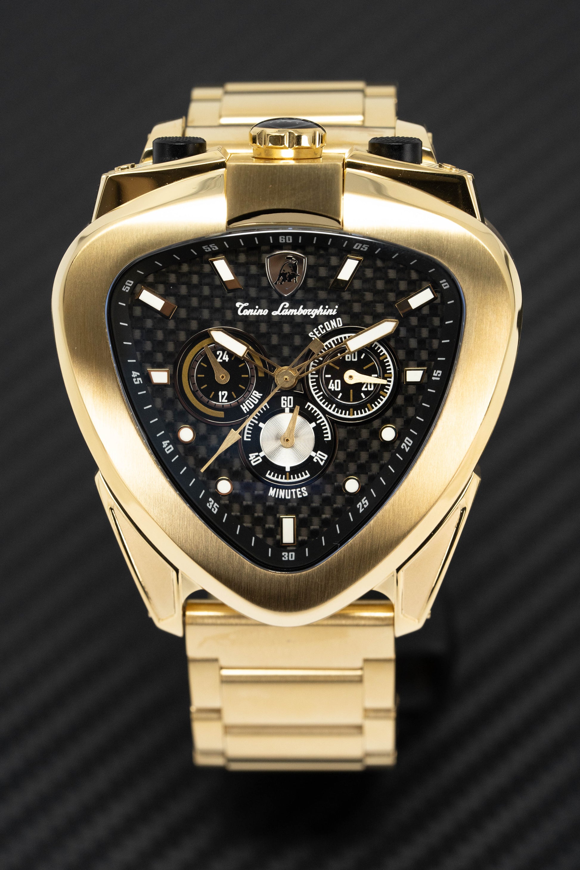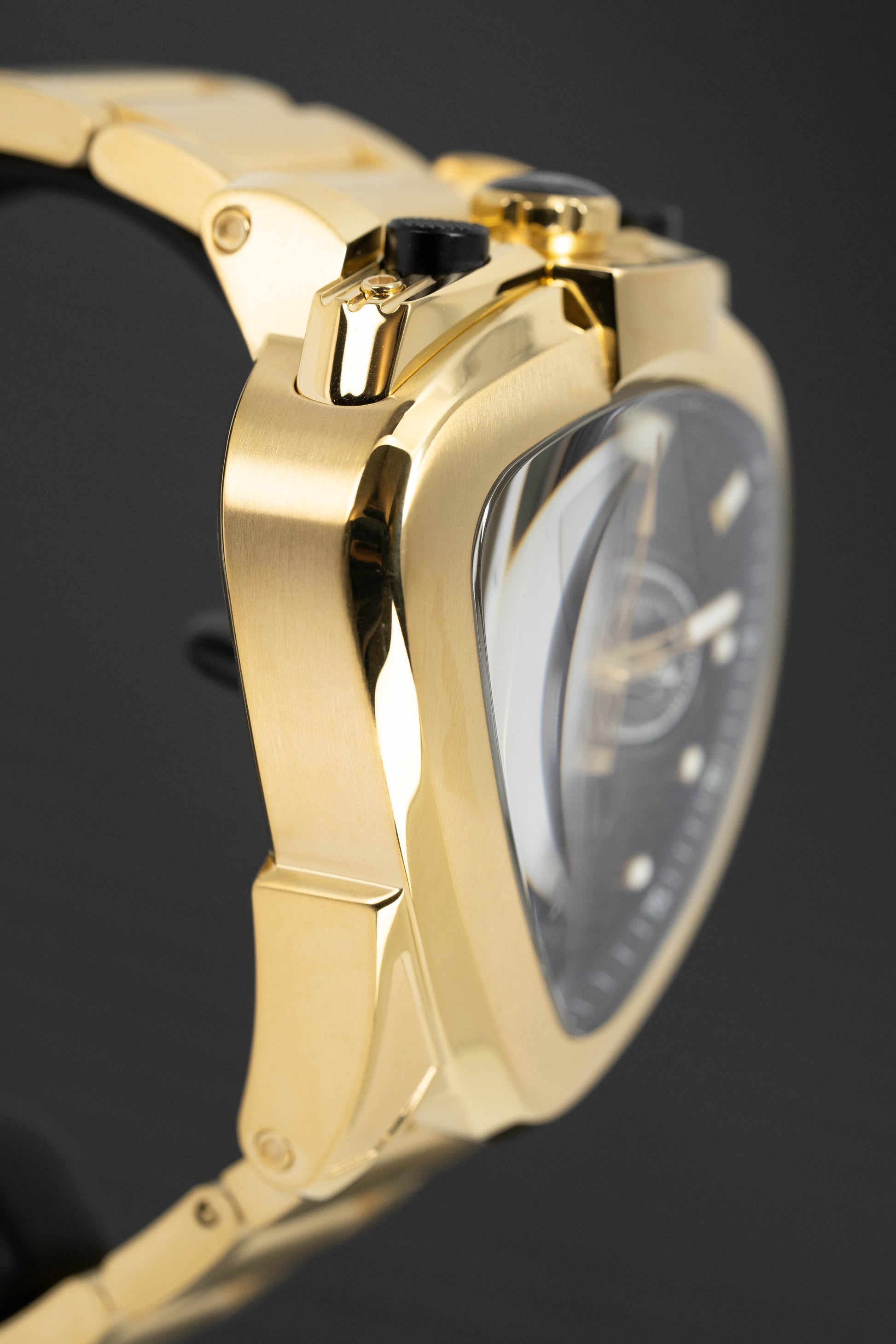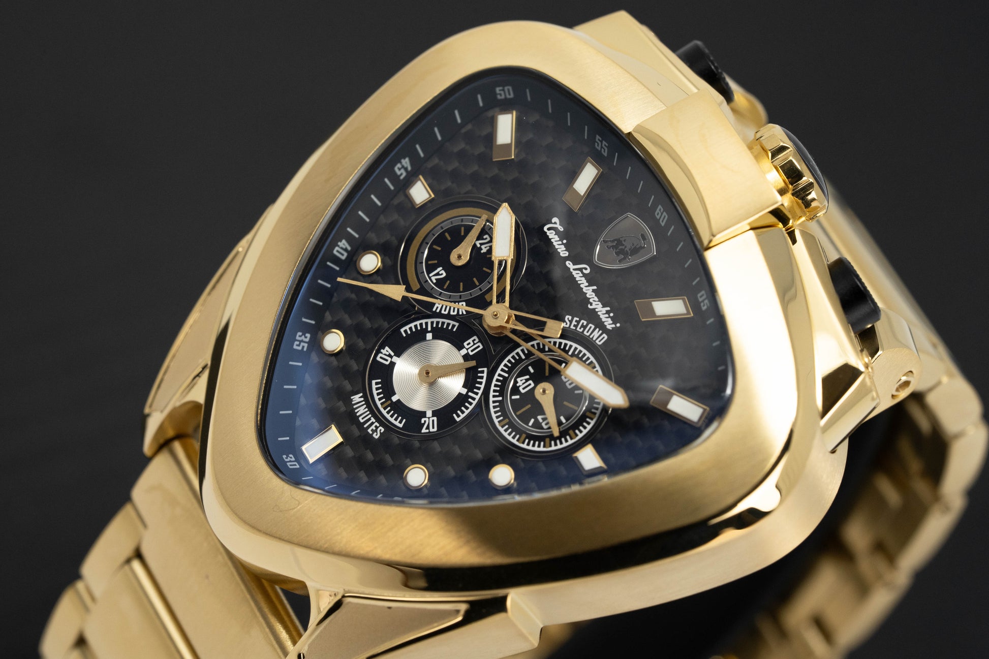 47mm x 53mm x 16mm 316L Gold Stainless Steel Case with a Polished and Satin Finish - Sapphire Crystal with Anti-Reflective Coating - Gold Stainless Steel Crown with Tonino Lamborghini Logo Engraved - Chronograph Start/Stop Buttons - Solid Caseback.