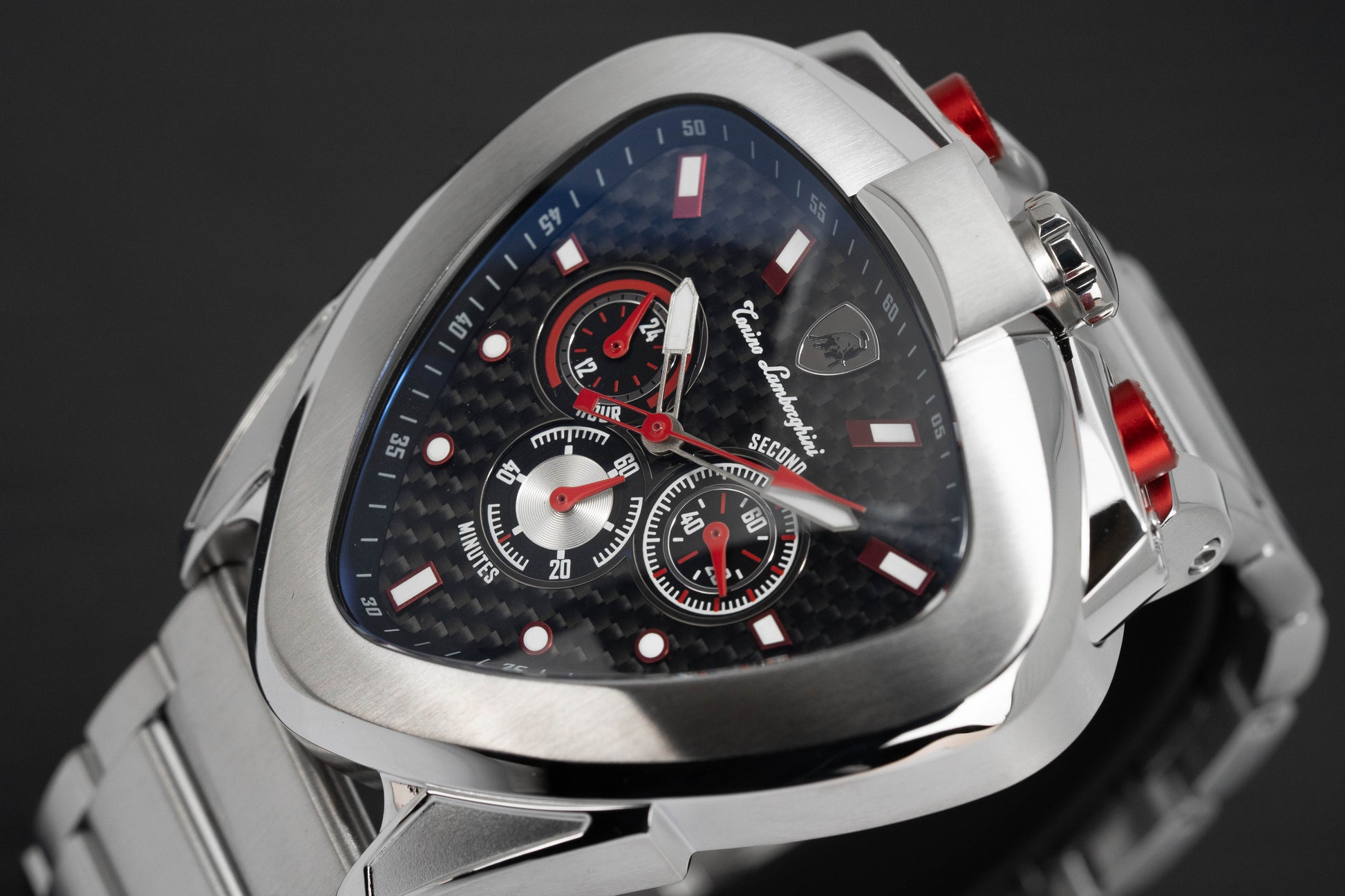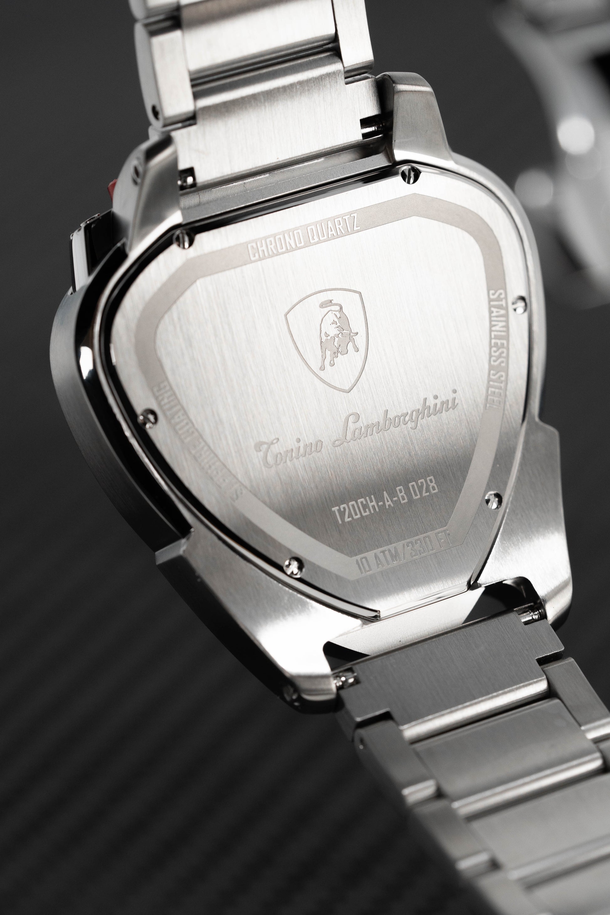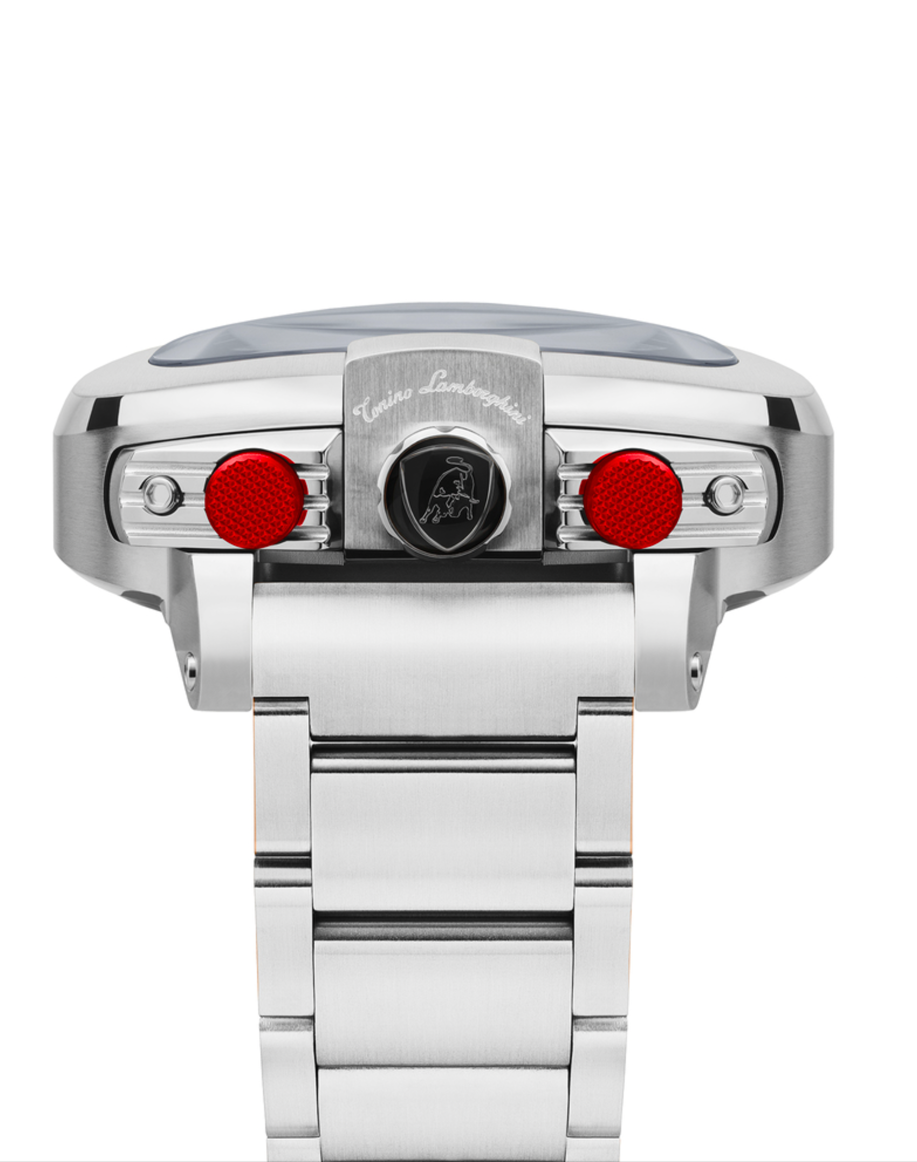 47mm x 53mm x 16mm 316L Stainless Steel Case with a Polished and Satin Finish - Sapphire Crystal with Anti-Reflective Coating - Stainless Steel Crown with Tonino Lamborghini Logo Engraved - Chronograph Start/Stop Buttons - Solid Caseback.