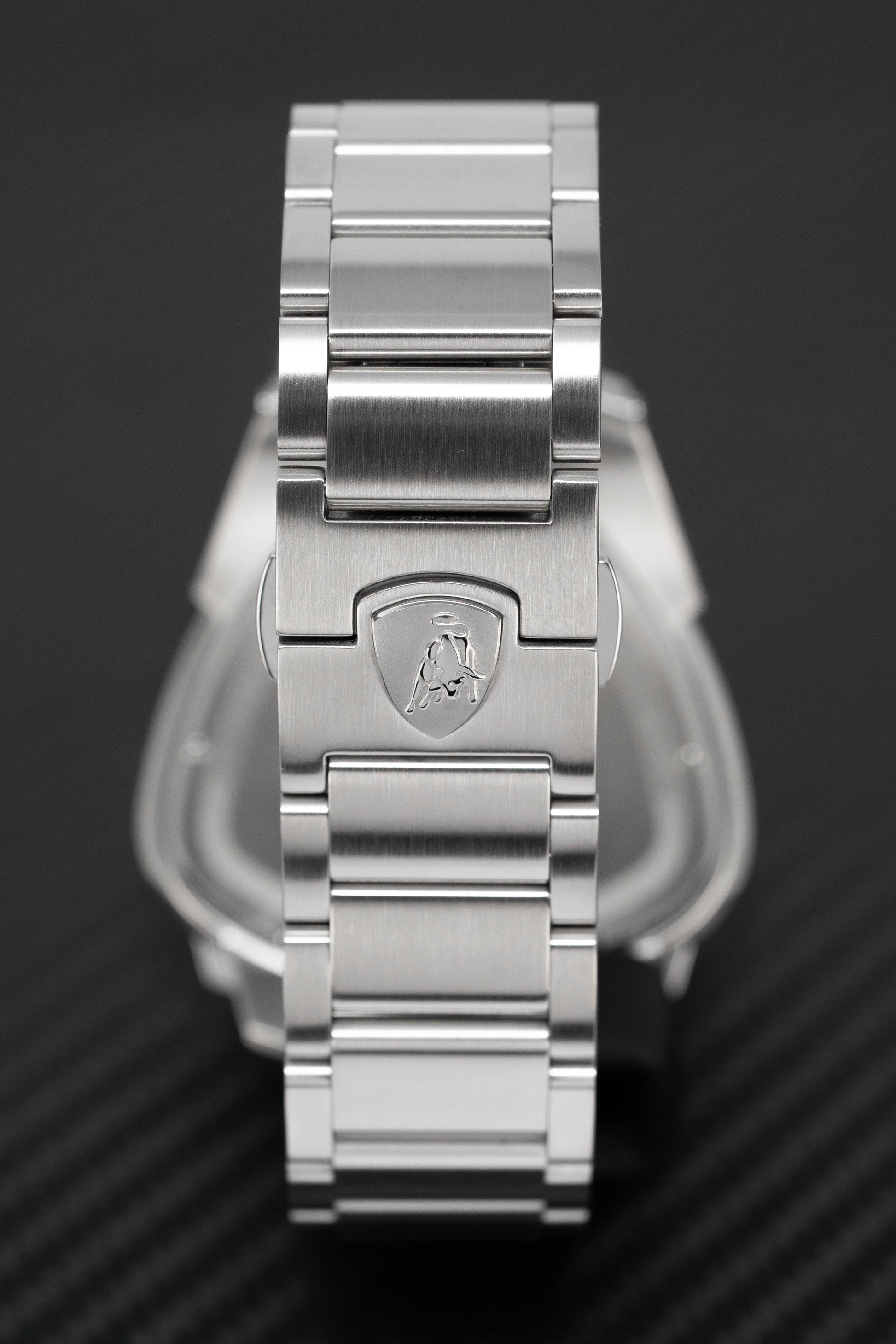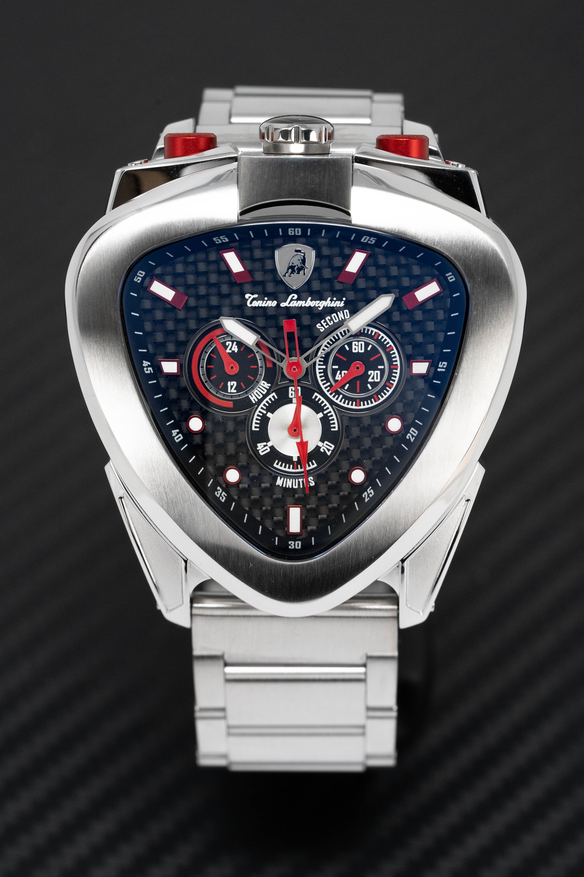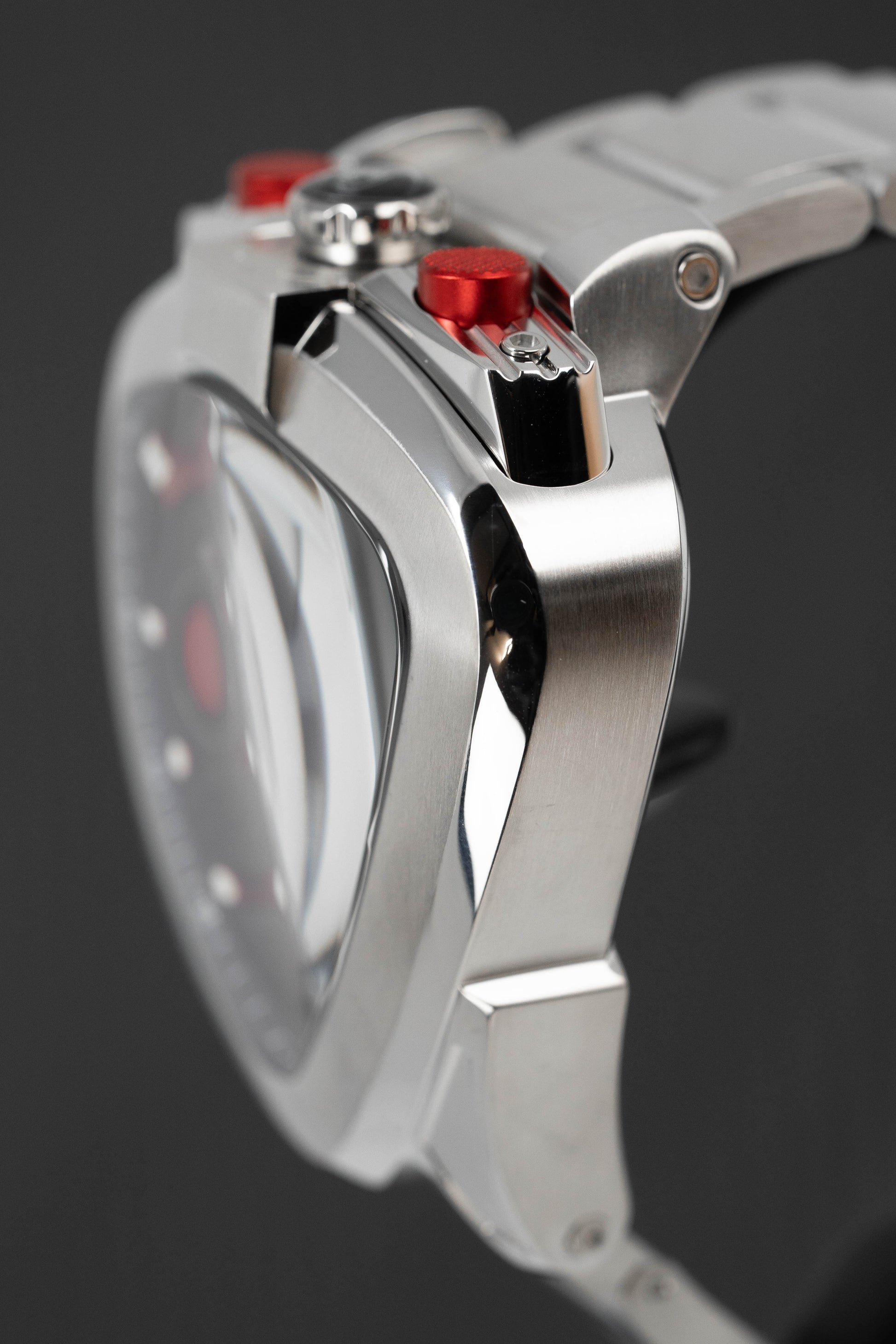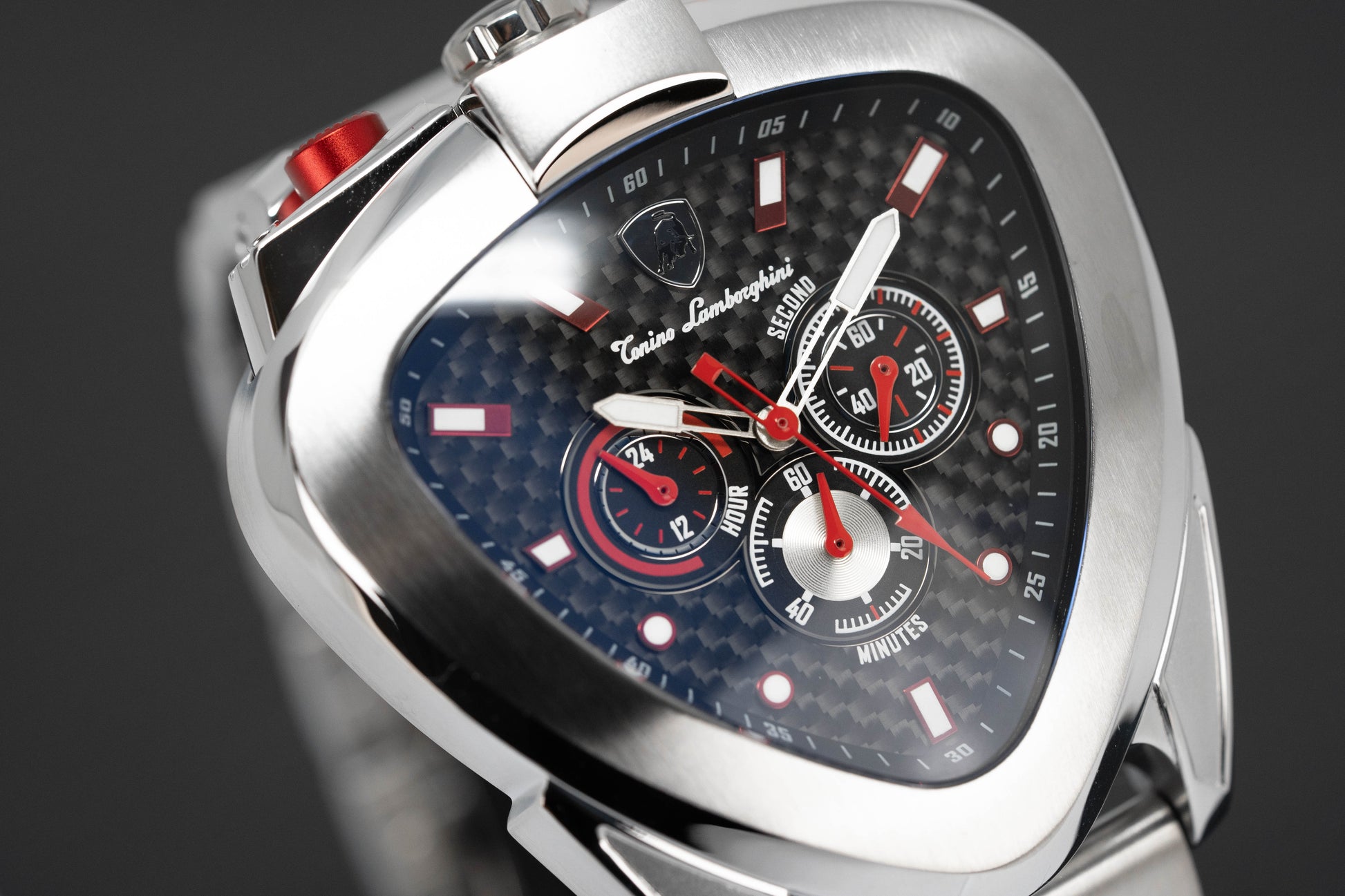 47mm x 53mm x 16mm 316L Stainless Steel Case with a Polished and Satin Finish - Sapphire Crystal with Anti-Reflective Coating - Stainless Steel Crown with Tonino Lamborghini Logo Engraved - Chronograph Start/Stop Buttons - Solid Caseback.