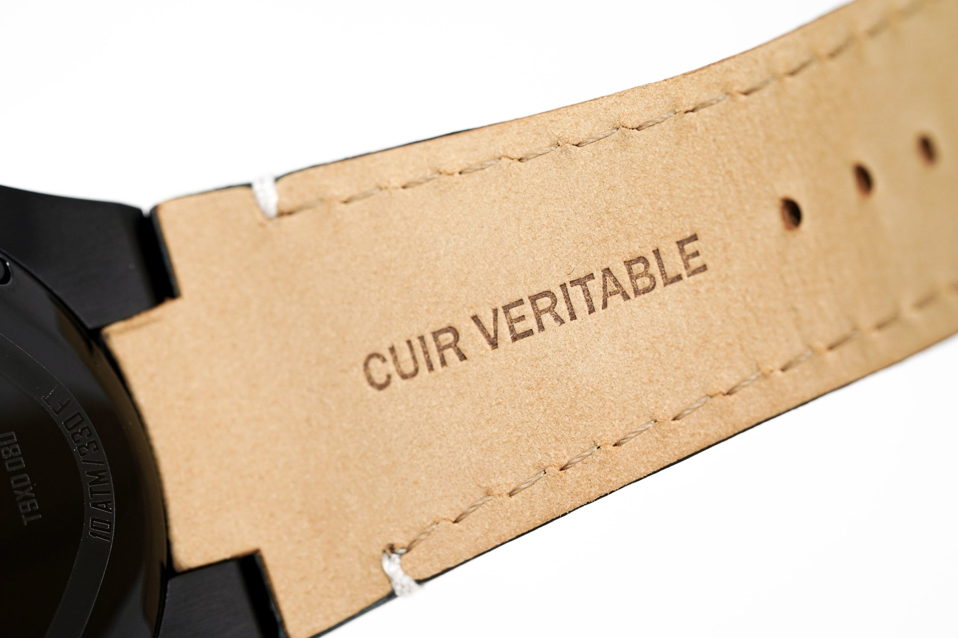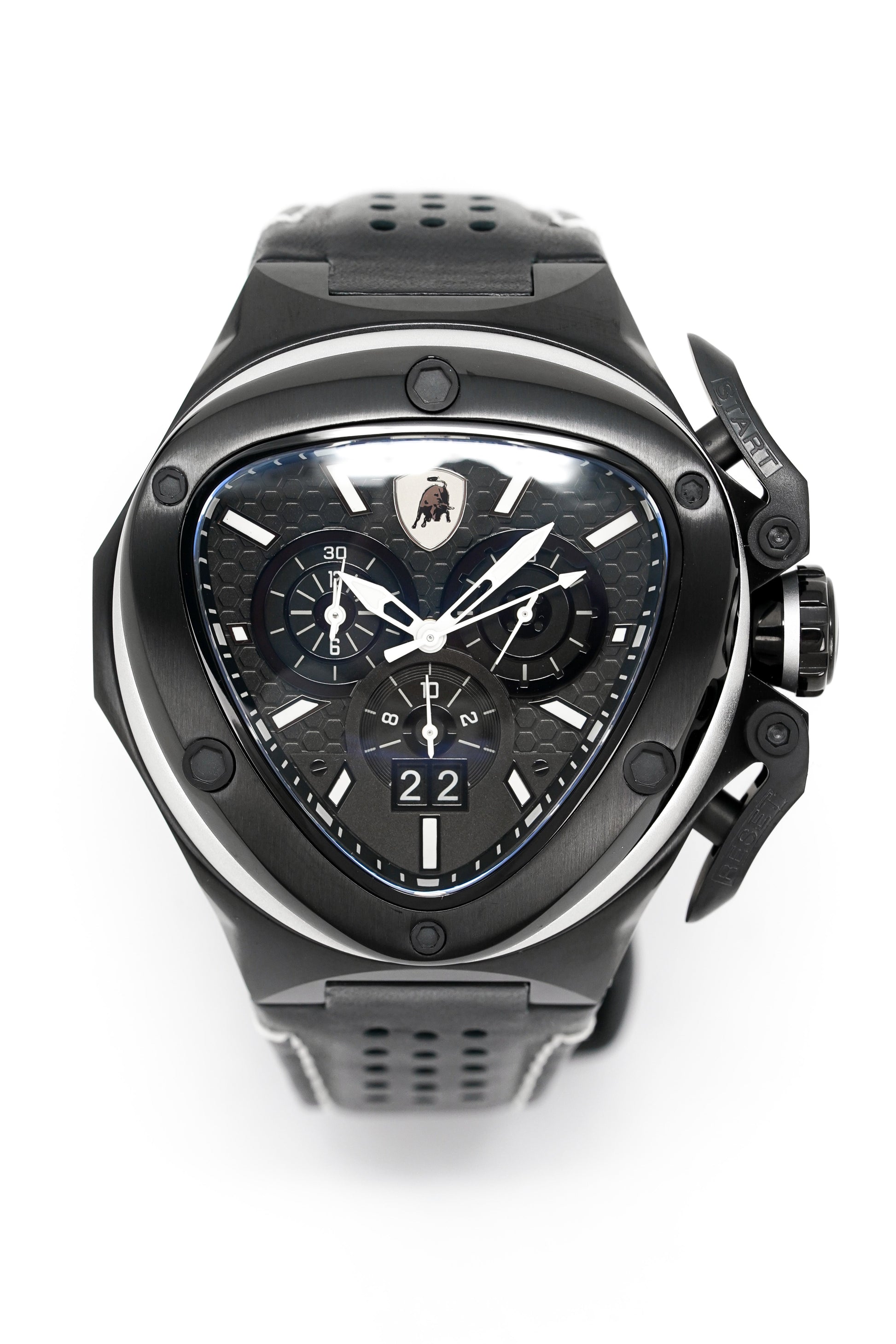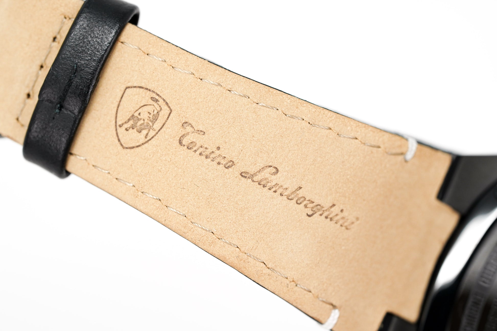 22mm x 20cm Black Perforated Leather Strap with White Stitching. Black PVD Stainless Steel Deployment Buckle with Tonino Lamborghini Engraved on the Clasp