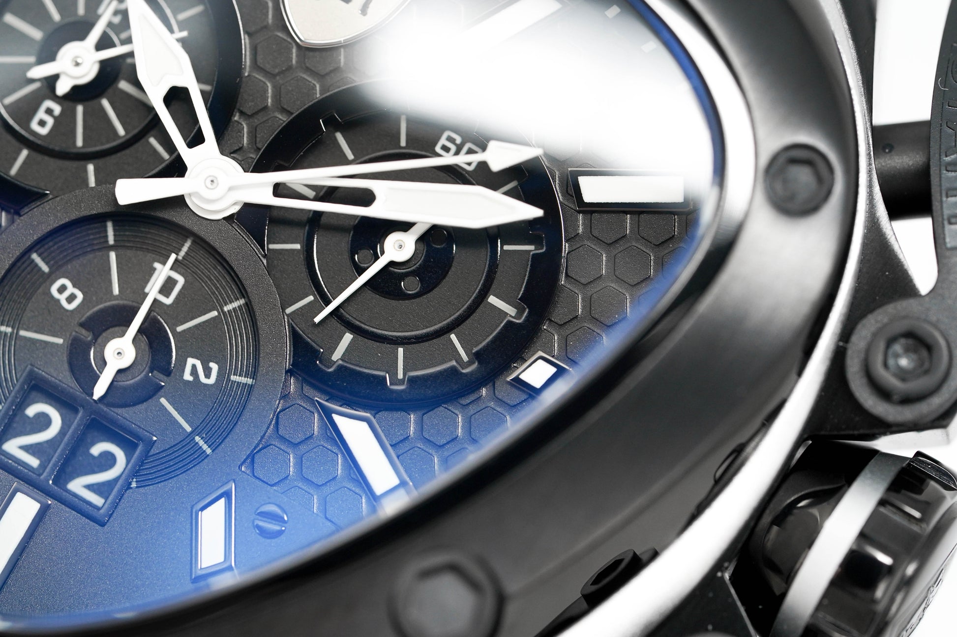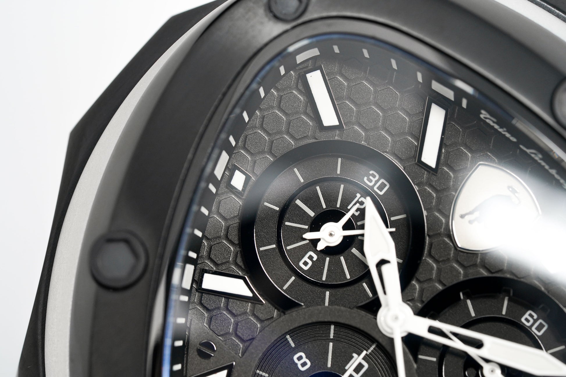 Black Honeycomb Dial with White Details around the Sub-Dials. Luminous Stainless Steel Hands and Markers. Date window at 6 O'clock. Tonino Lamborghini Shield at 12 O'Clock.