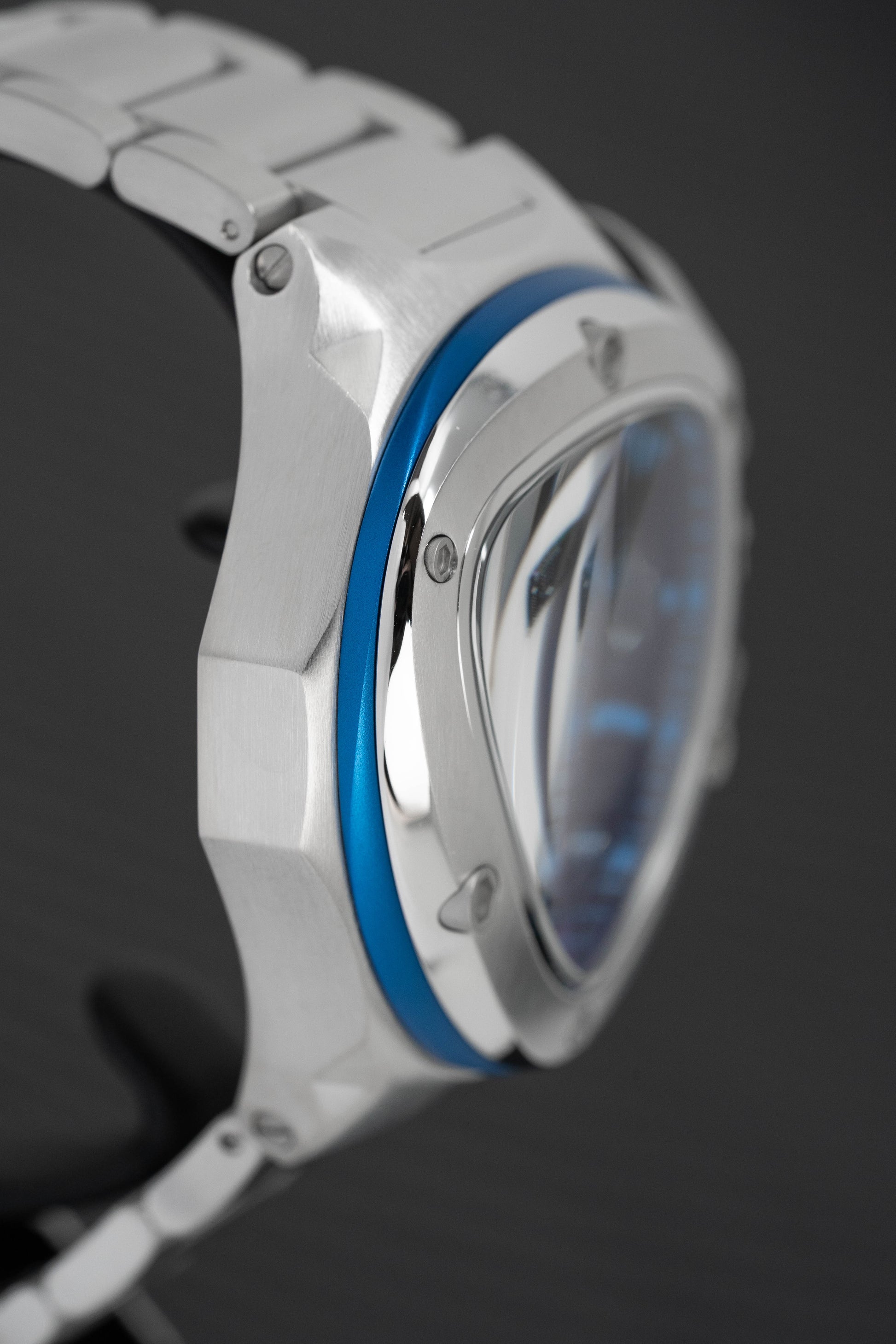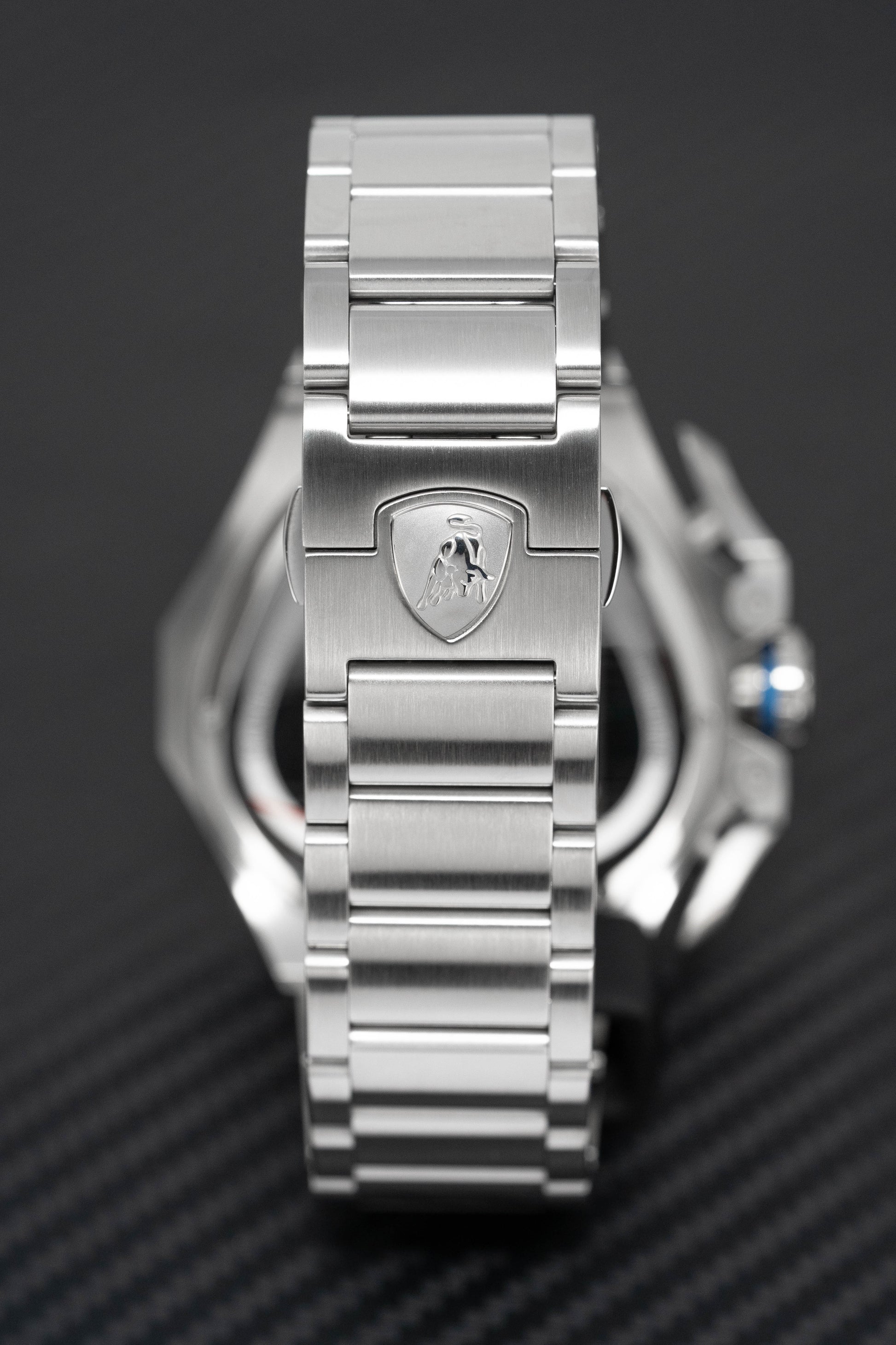 53mm x 56mm x 16mm Stainless Steel Case with Satin Finish. Stainless steel Bezel. Anti-Reflective Sapphire Crystal. Screw Down Titanium Crown. Black Honeycomb Dial with Blue Details around the Sub-Dials. Luminous Stainless Steel Hands and Markers. Tonino Lamborghini Shield at 12 O'Clock.