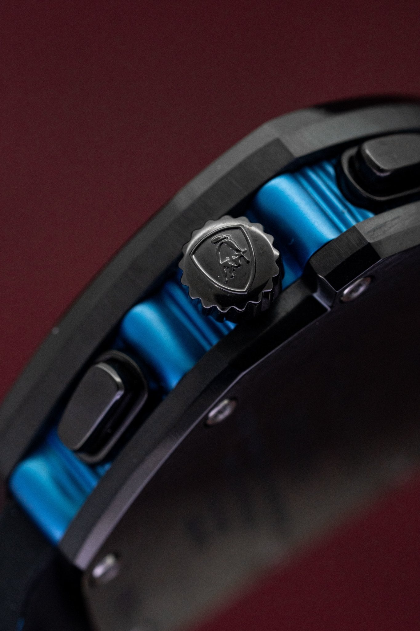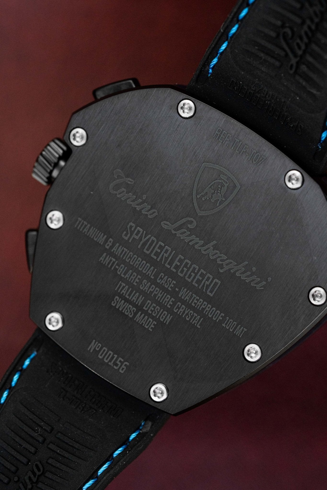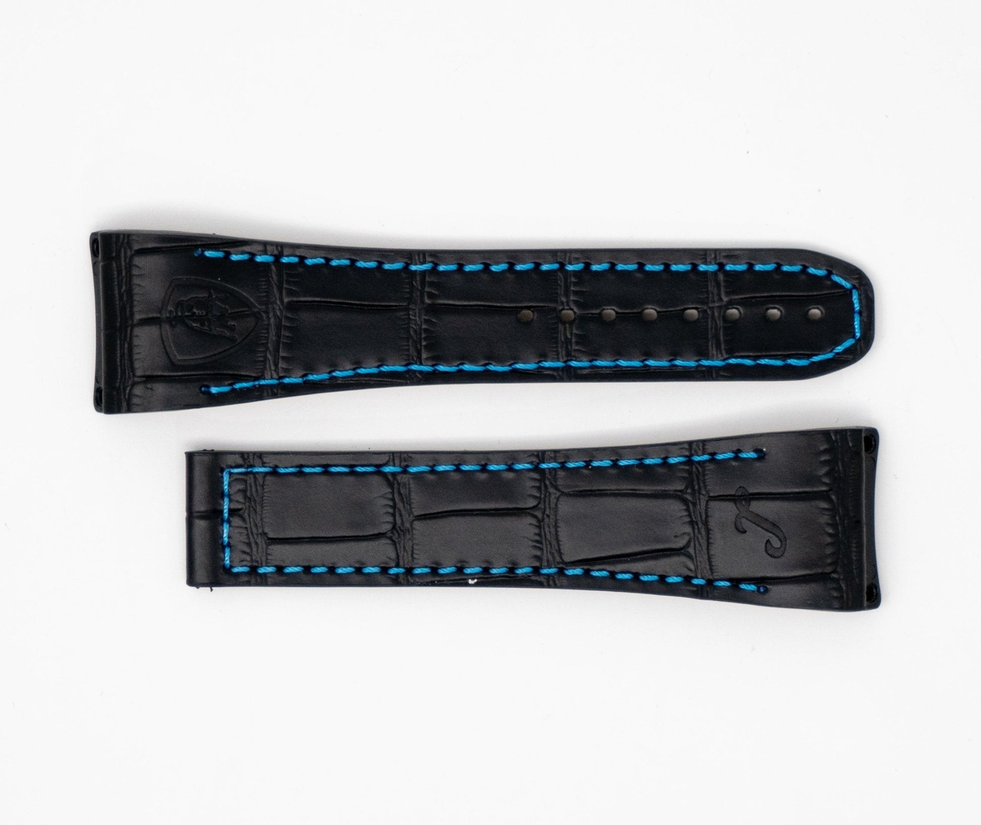 22mm x 20cm Black Rubber Basis Leather Strap with Blue Stitching. Black DLC Titanium Deployment Buckle. Tonino Lamborghini Engraved on the Buckle