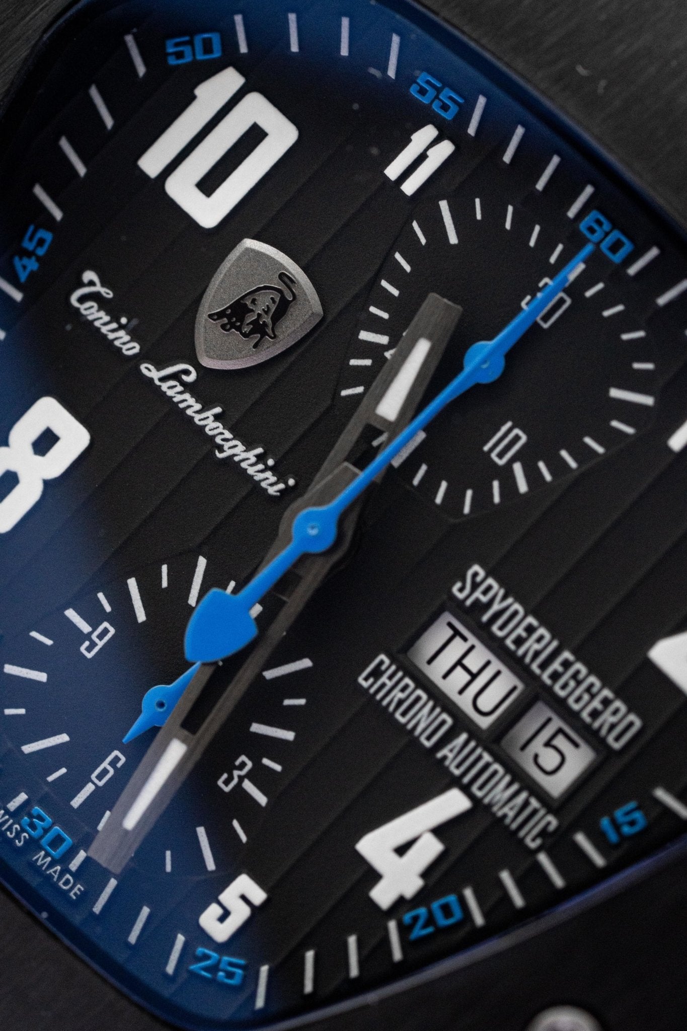 Black Dial with Côte de Genève detailing. Luminescent Stainless Steel Hands and Markers. Tonino Lamborghini Shield at 9 O'Clock. 30 Minute Counter at 12 O'Clock, 12 Hour Counter at 6 O'Clock, Day and Date Window at 3 O'Clock.