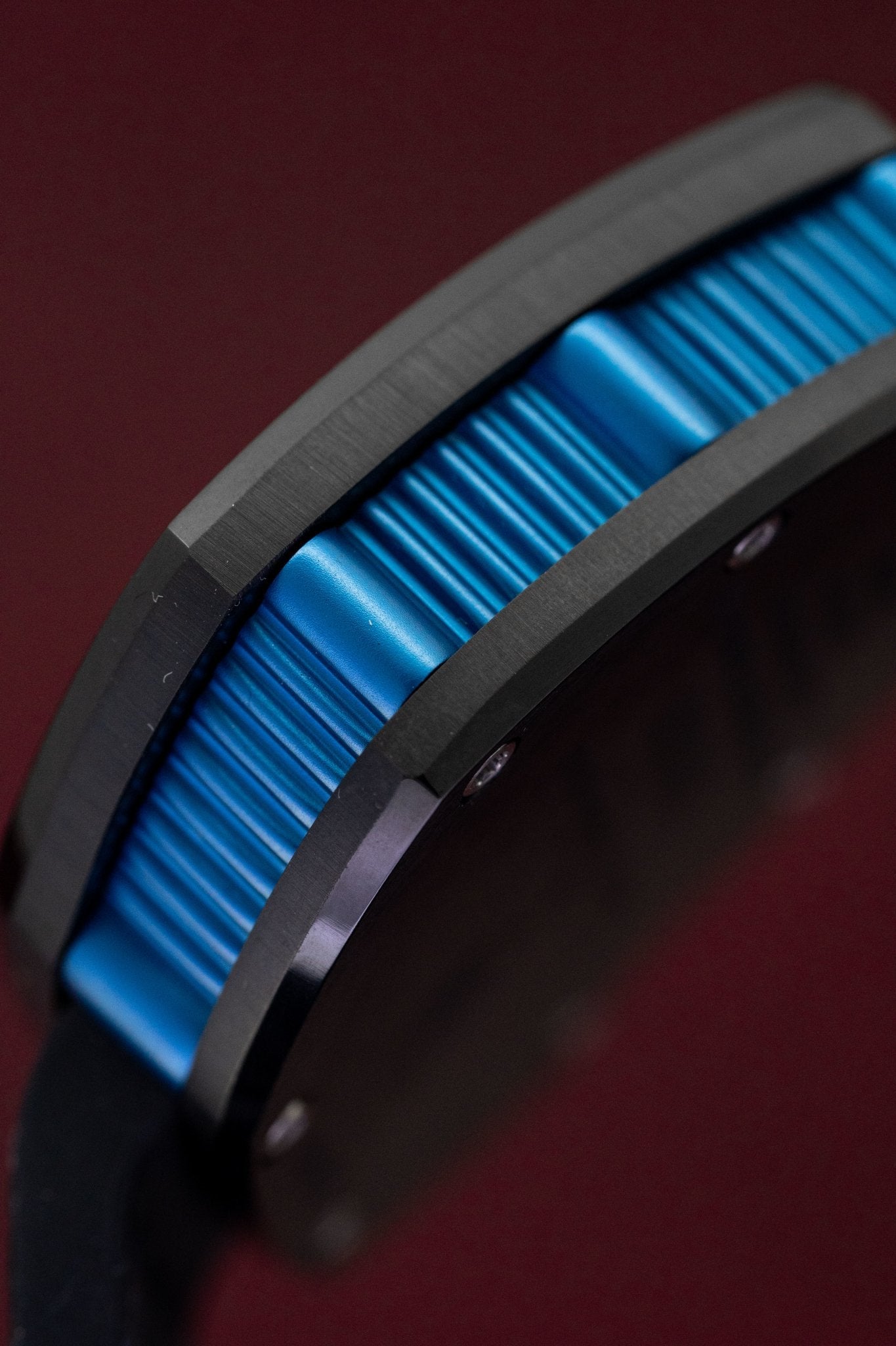 51.5mm x 46mm x 17mm Black DLC Titanium Base and Bezel with a Blue Anti-Corodal Aluminium Centre held together with 8 Torx Screws. Anti-Reflective Sapphire Crystal. Titanium Crown.