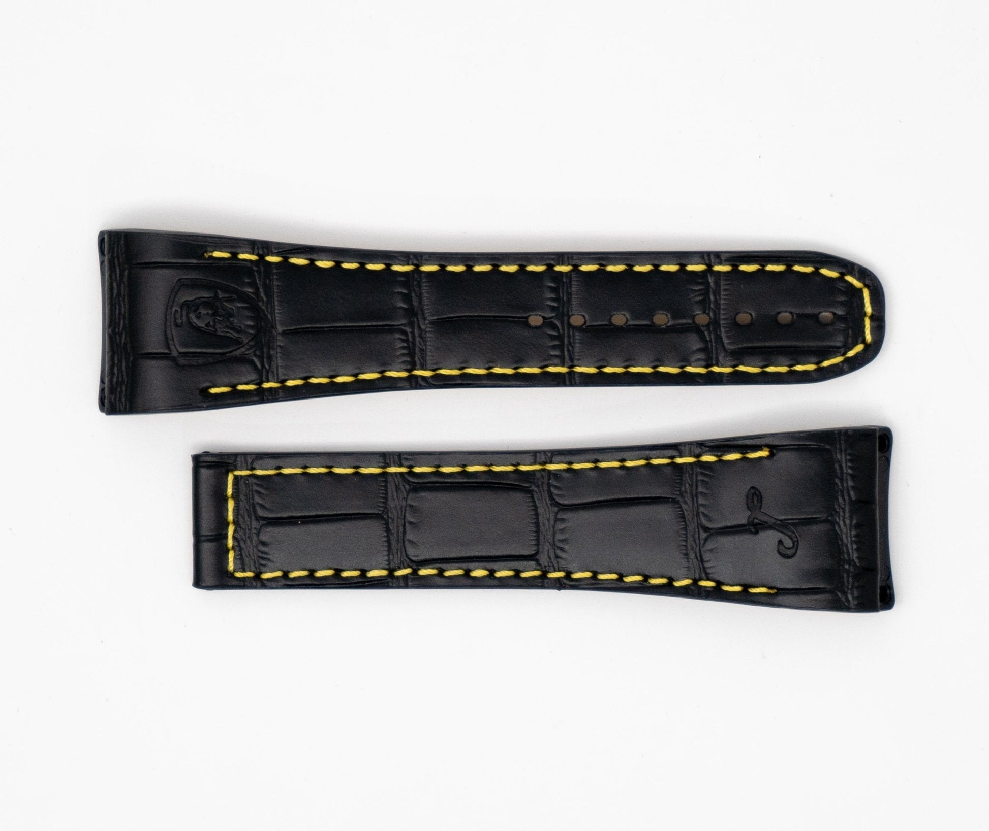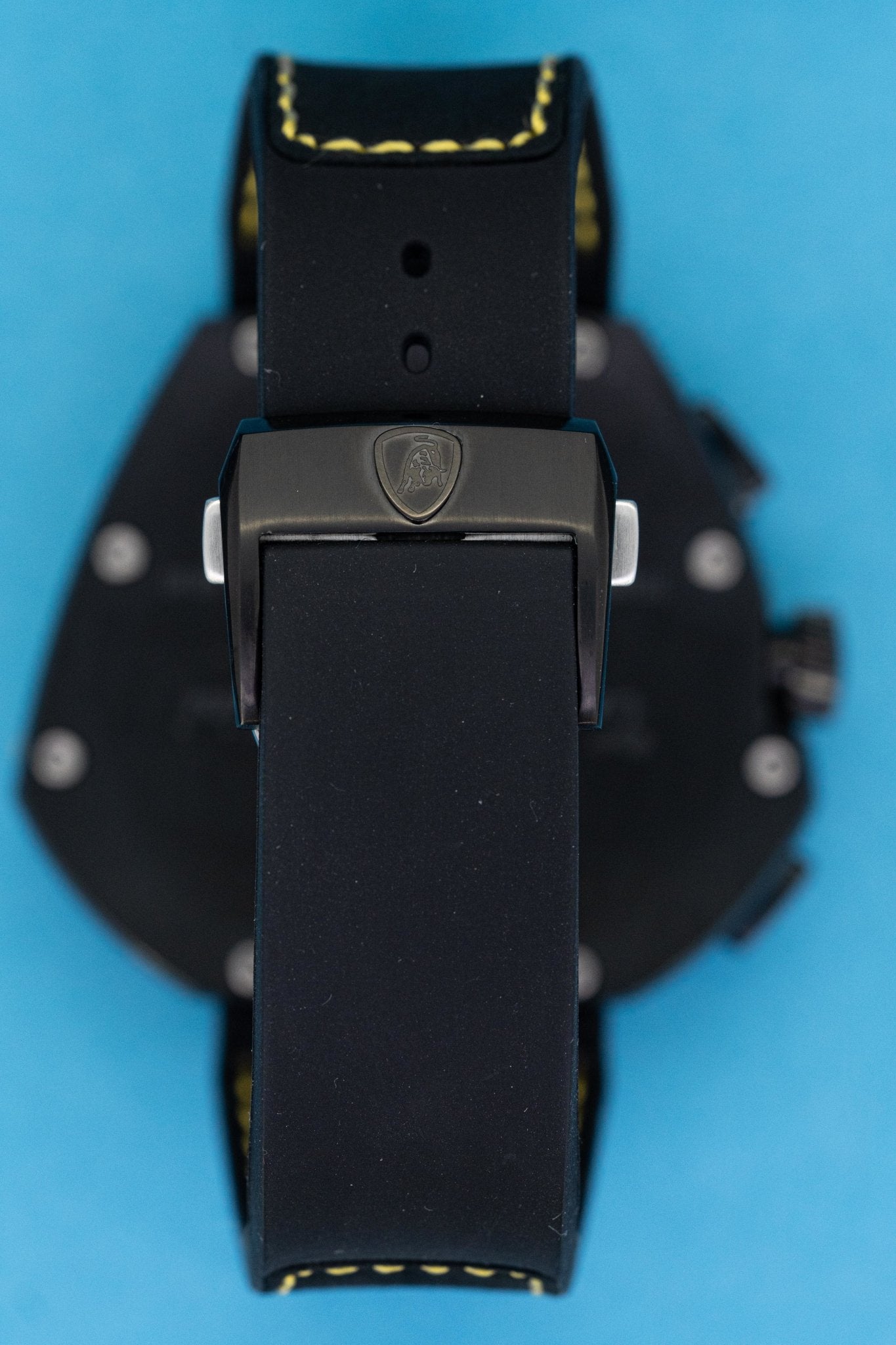 22mm x 20cm Black Rubber Basis Leather Strap with Yellow Stitching. Black DLC Titanium Deployment Buckle. Tonino Lamborghini Engraved on the Buckle