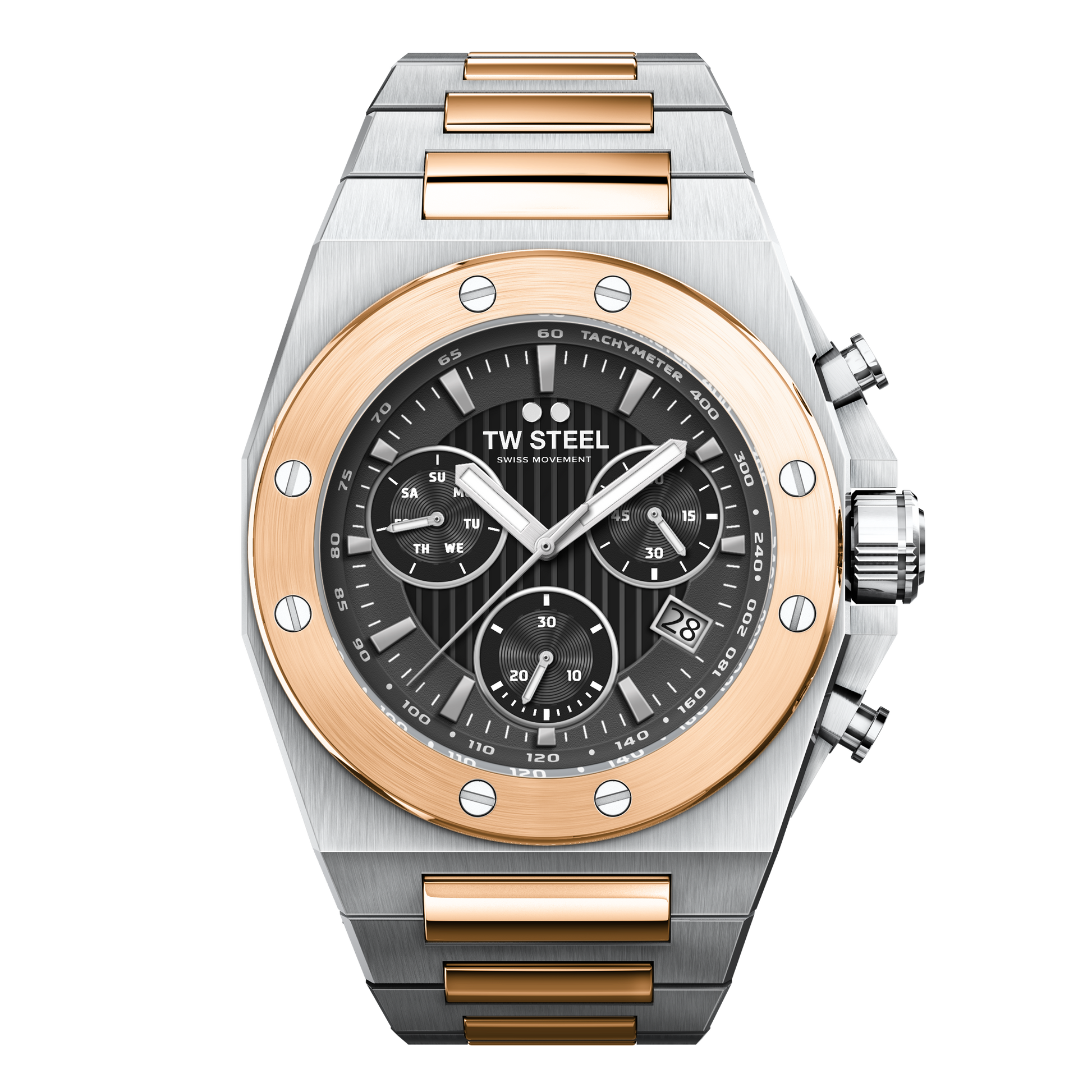 45mm 316L Brushed Stainless Steel Case with Rose Gold PVD Bezel, Polished Steel Accent Screws and Screw-Down Crown. Anti-Reflective Sapphire Crystal.