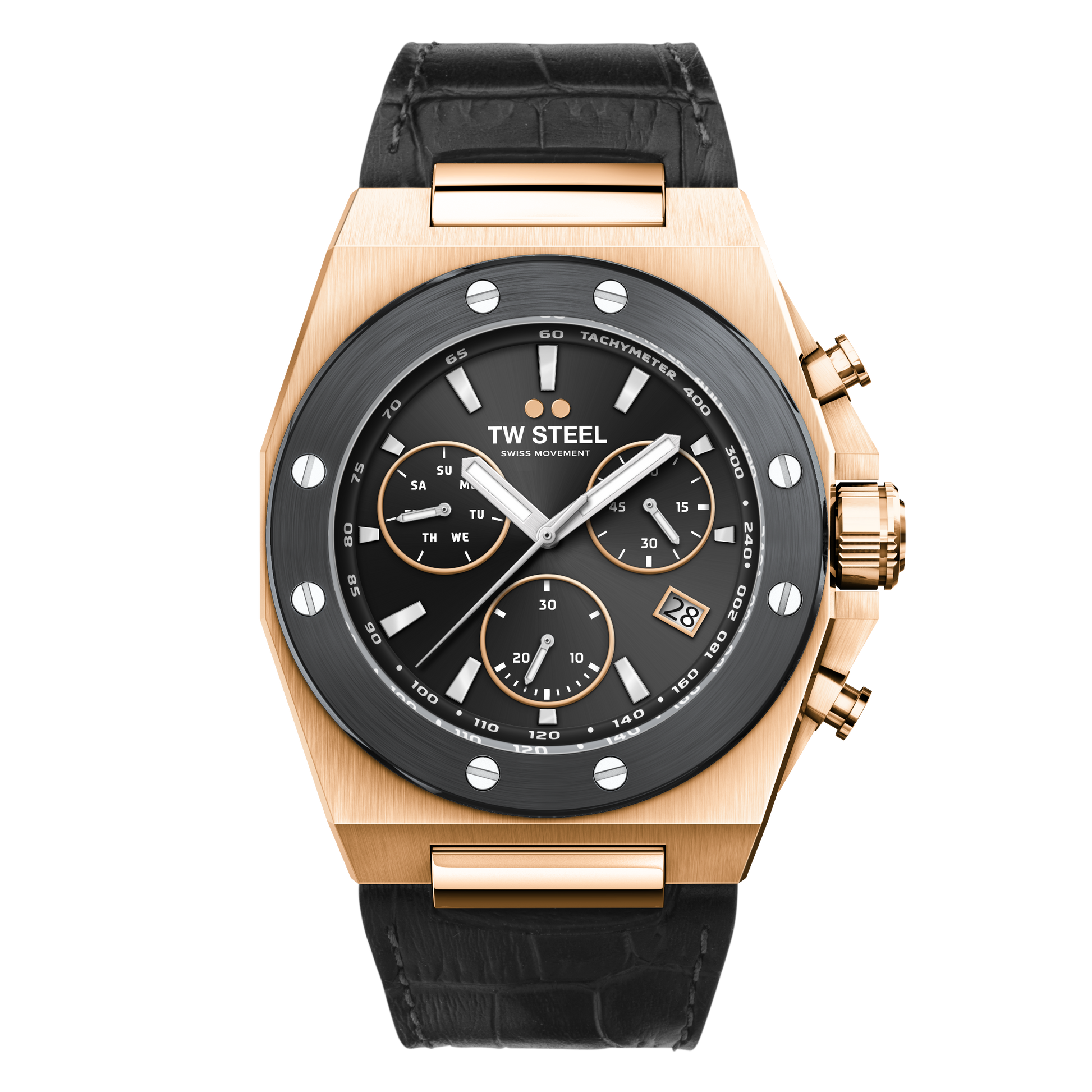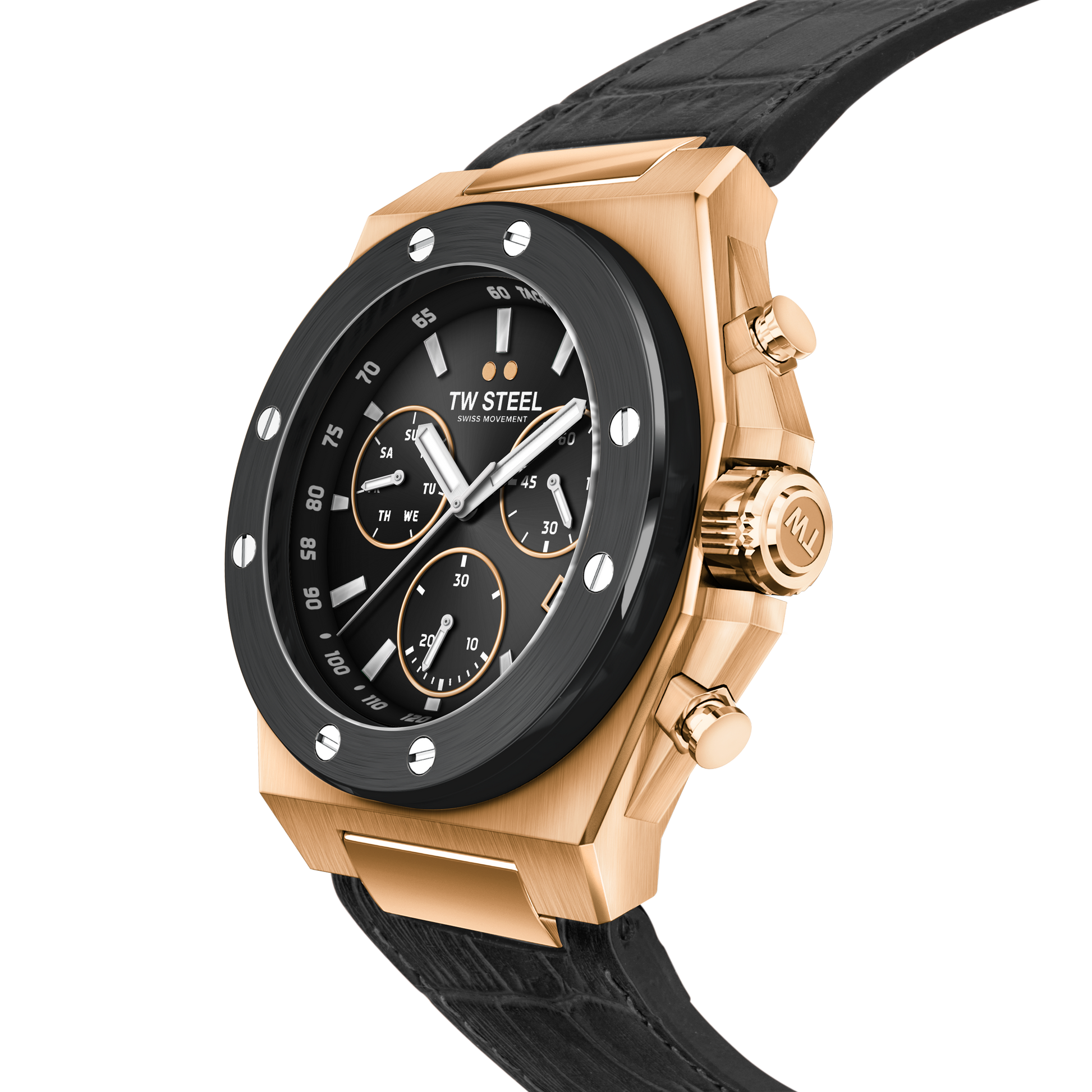 45mm 316L Brushed Rose Gold PVD Stainless Steel Case with Black PVD Bezel, Polished Steel Accent Screws and Screw-Down Crown. Anti-Reflective Sapphire Crystal.