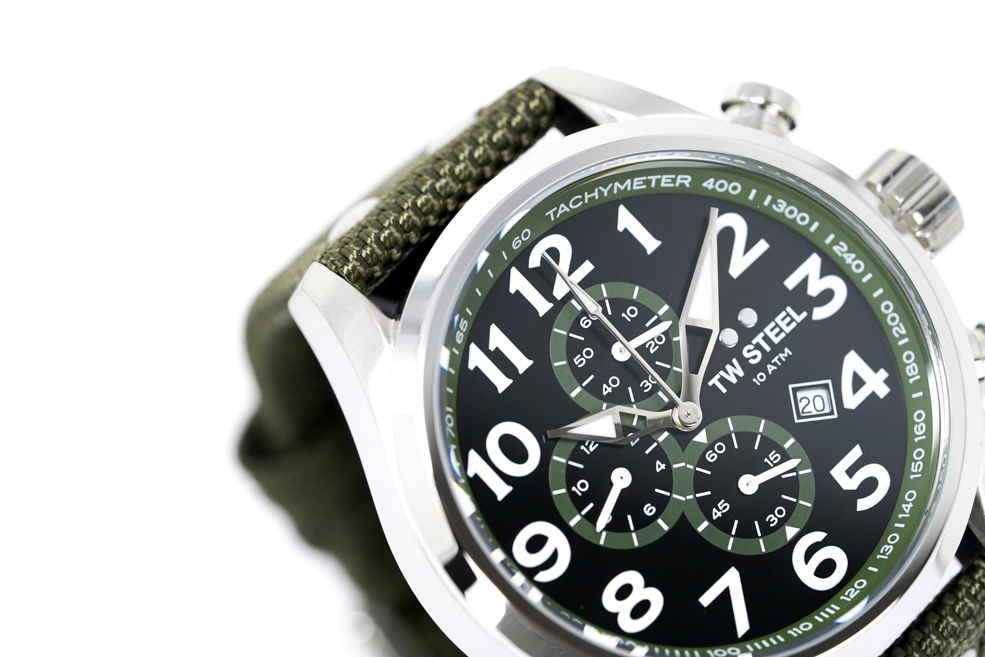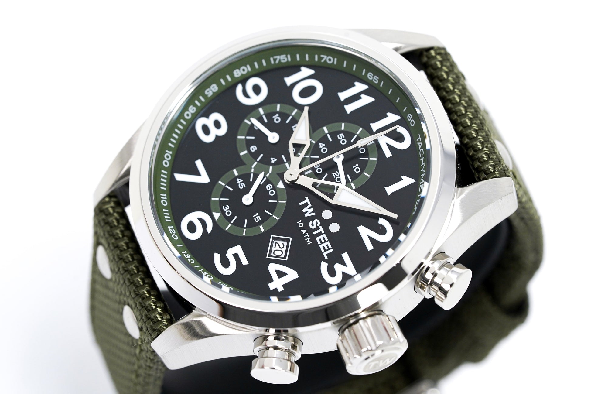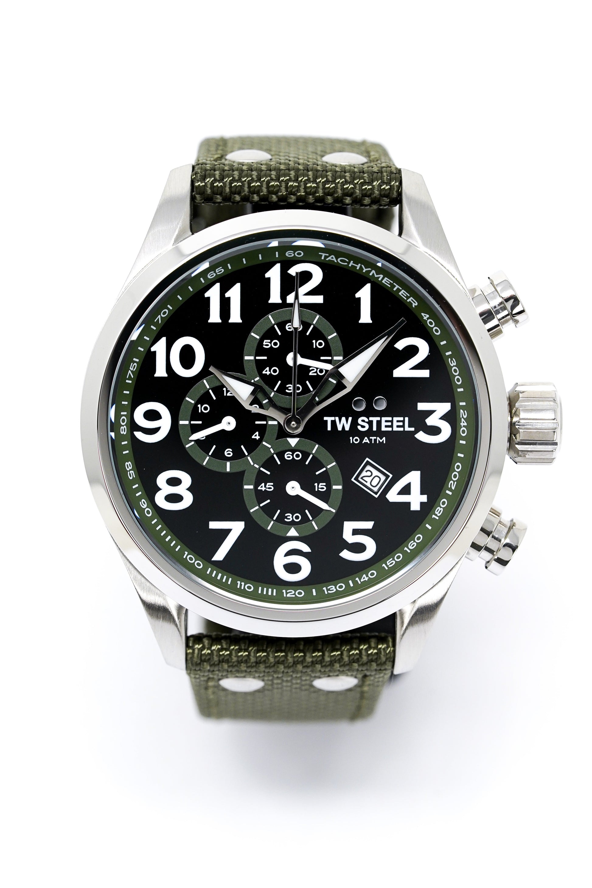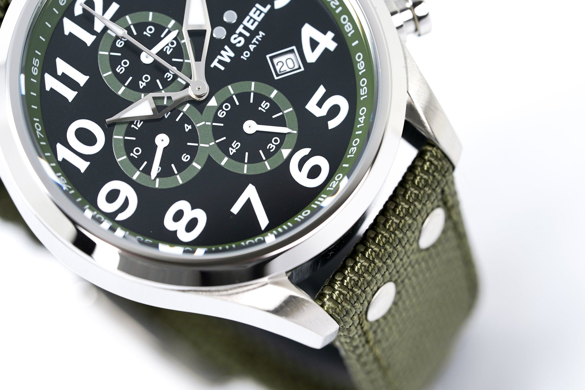Black Dial with Army Green Details. White and Steel Sword-Shaped Hands and Arabic Numeral Markers.Sub-Dials at 12, 9 and 6 O'Clock. Chronograph Seconds. Small Seconds. 60-Minute Counter. Date Window at 4:00.