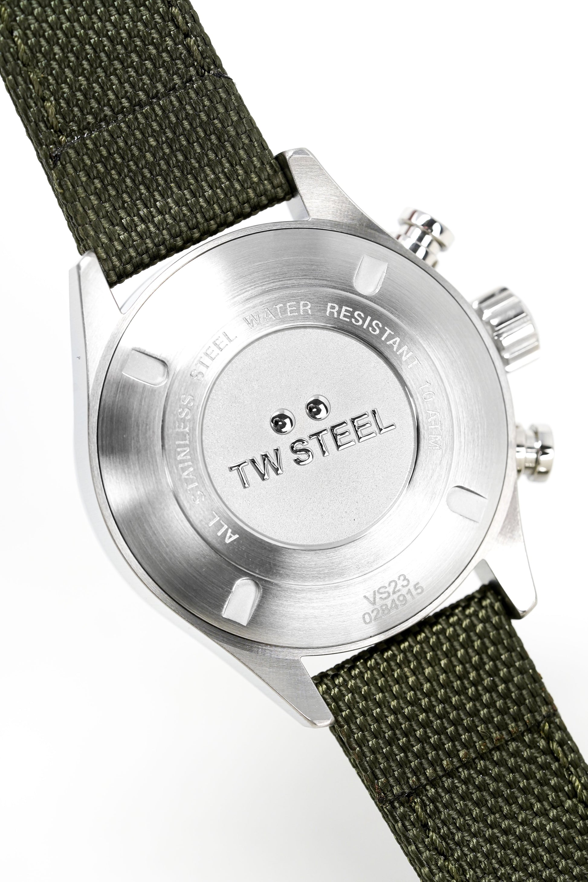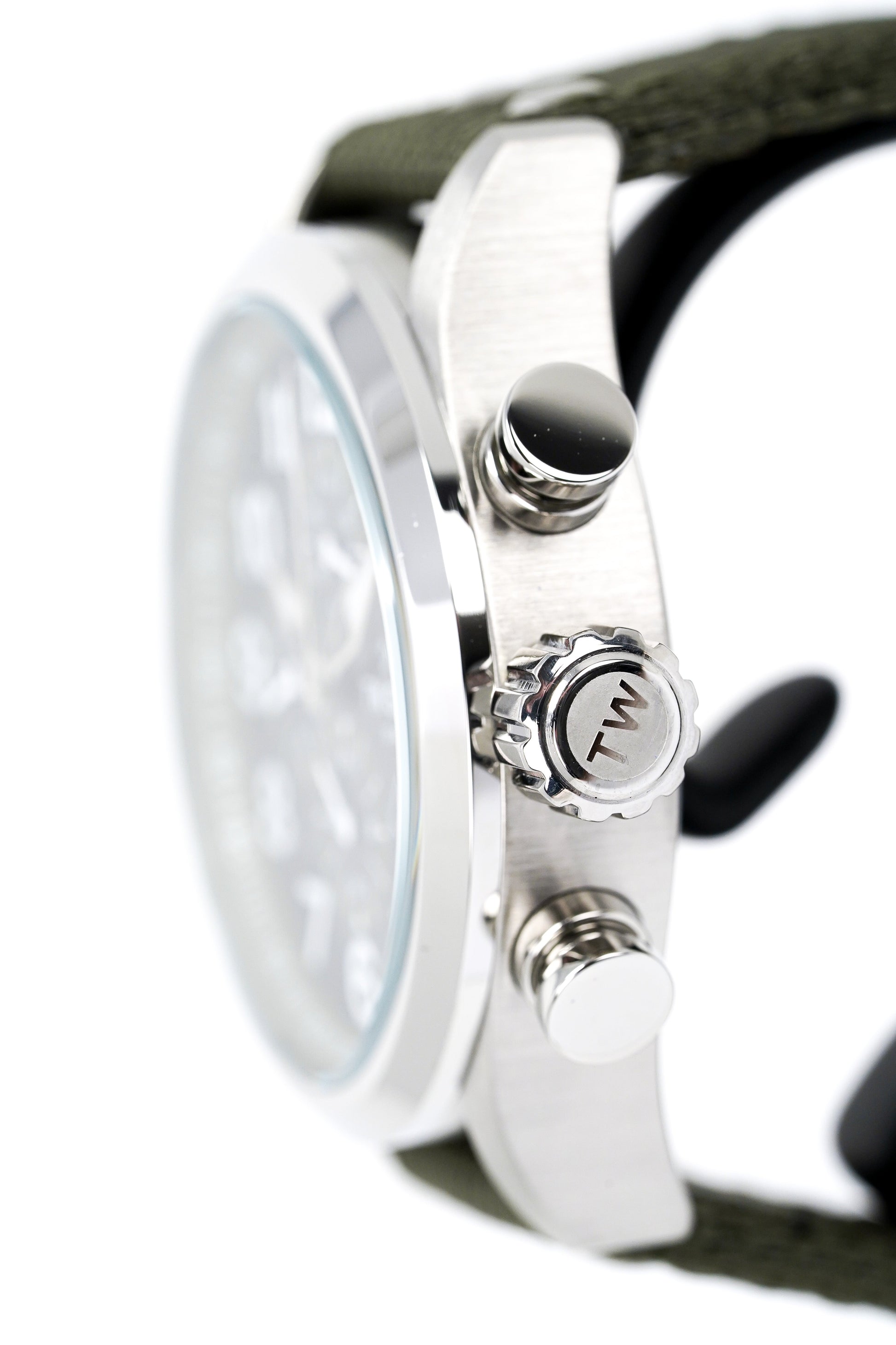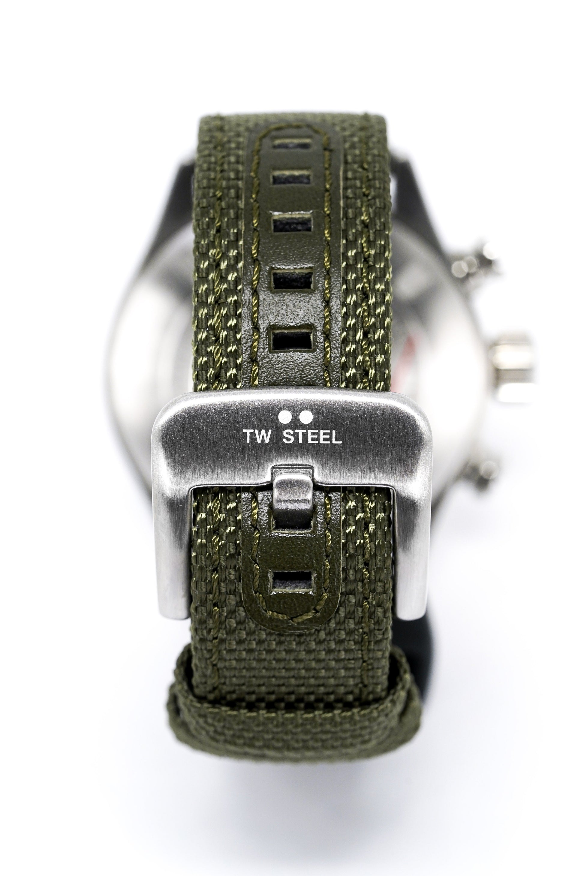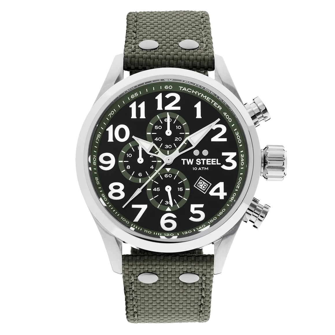 Black Dial with Army Green Details. White and Steel Sword-Shaped Hands and Arabic Numeral Markers.Sub-Dials at 12, 9 and 6 O'Clock. Chronograph Seconds. Small Seconds. 60-Minute Counter. Date Window at 4:00.
