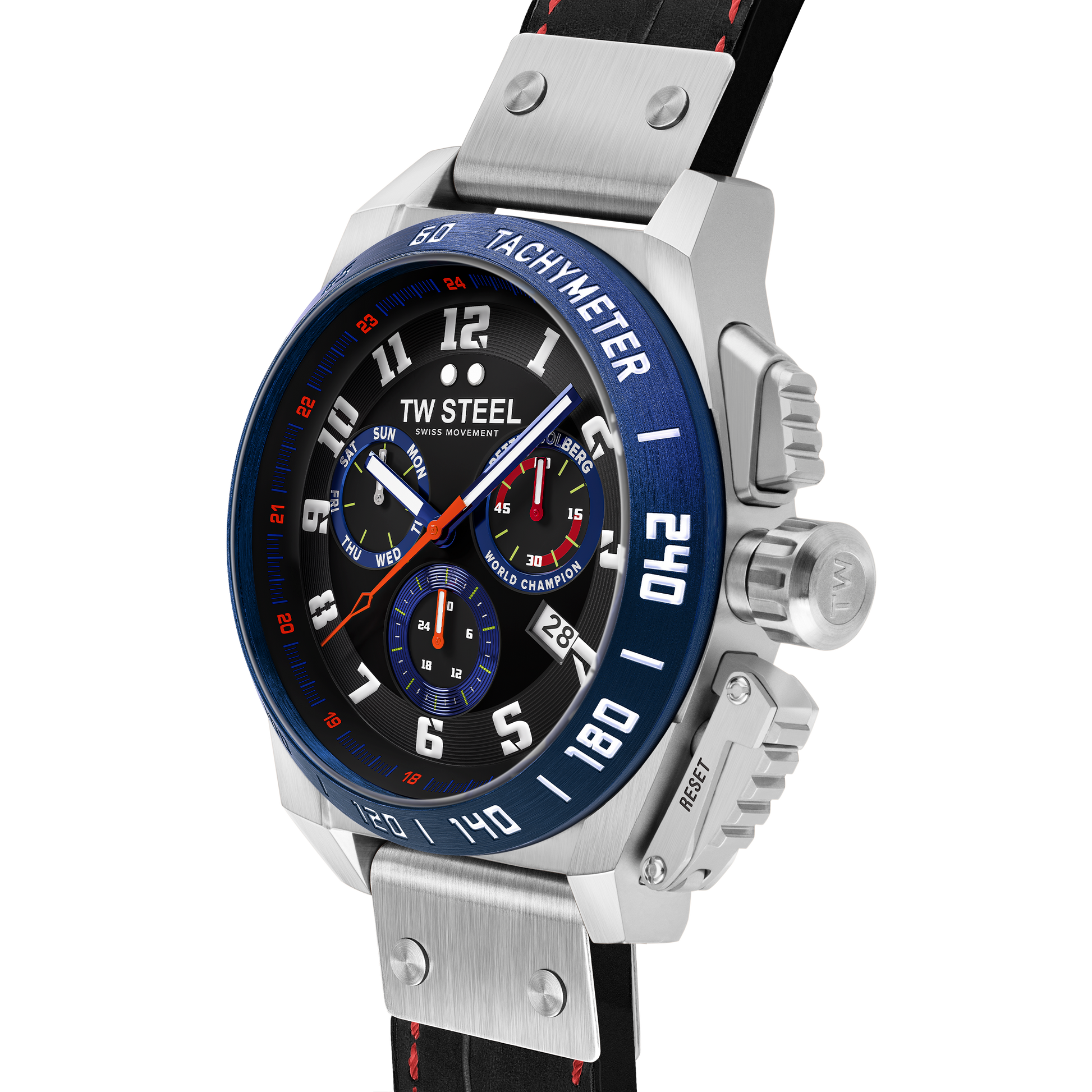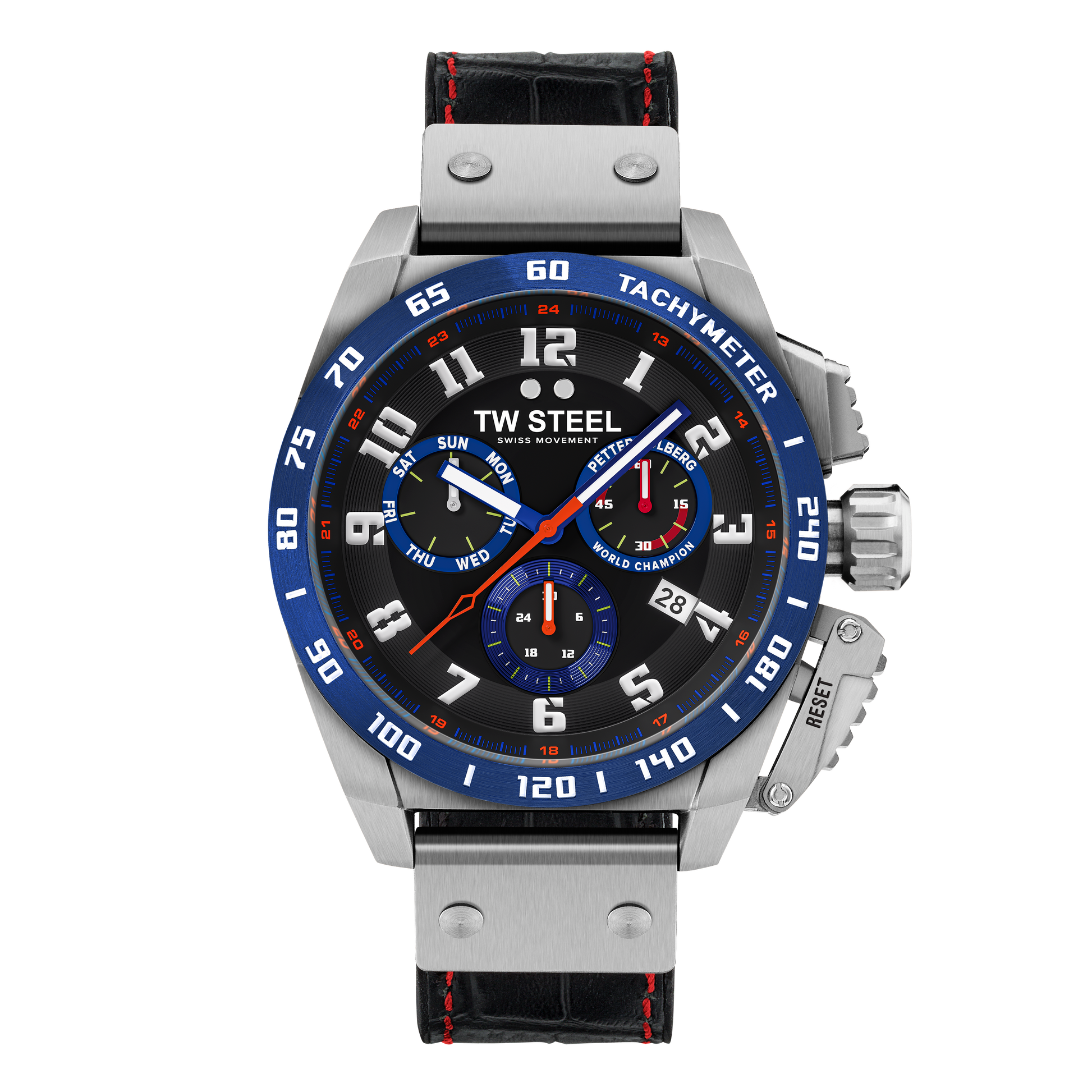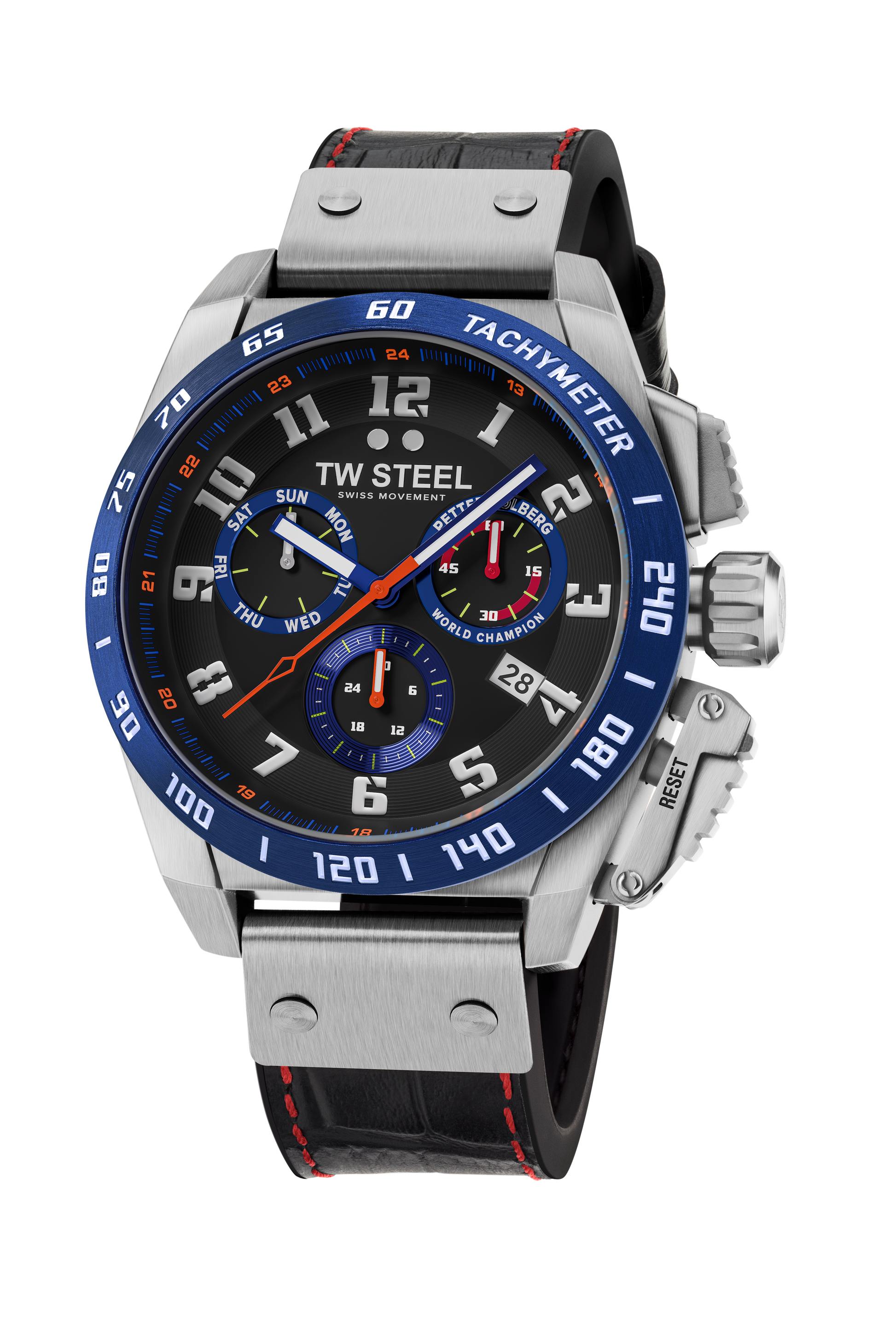 46mm 316L Stainless Steel Case with Blue PVD Tachymeter Bezel with Red Detail, Anti-Reflective Sapphire Crystal, Screw-Down Crown and Limited Edition Petter Solberg Engraved Caseback.