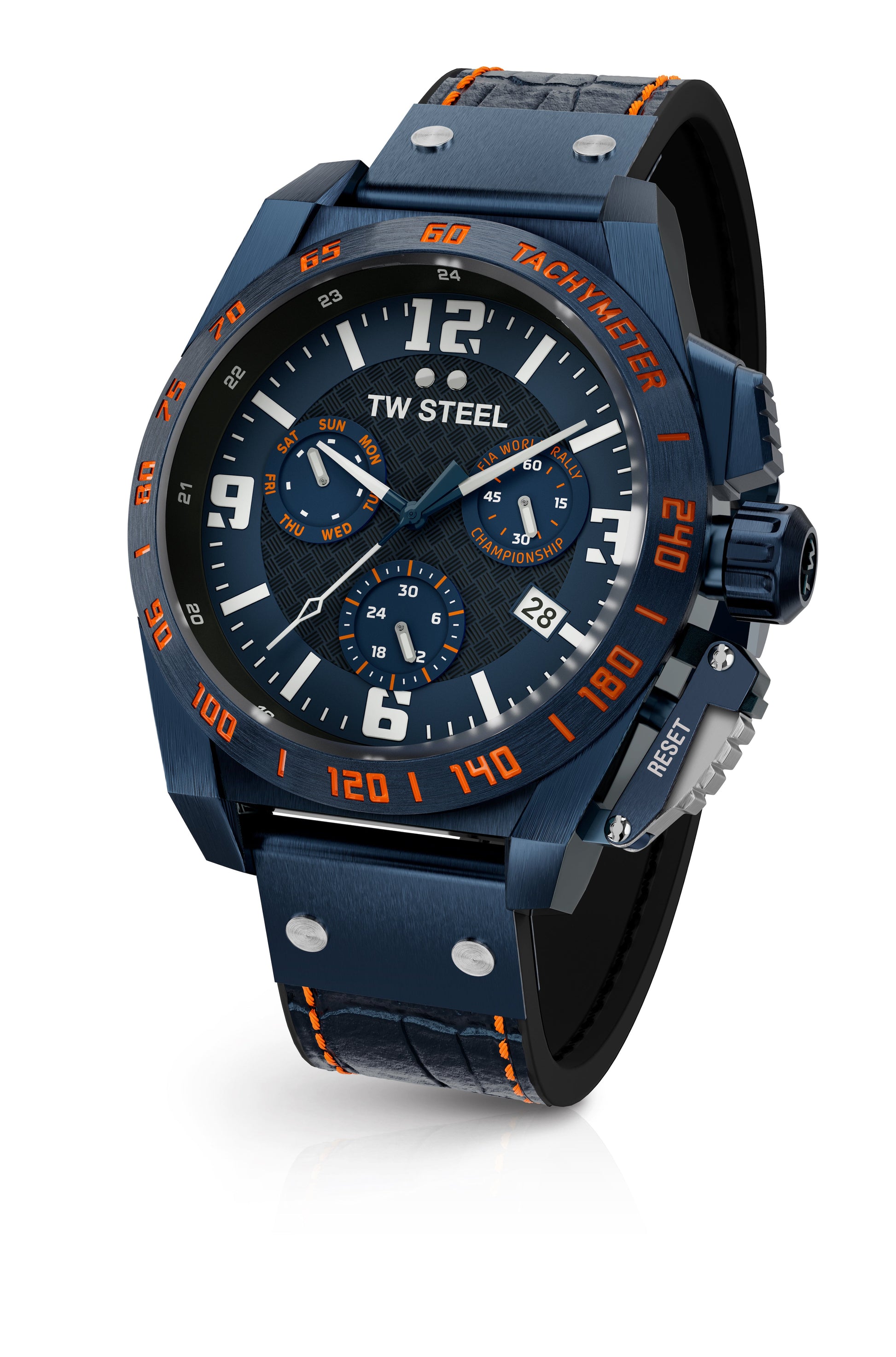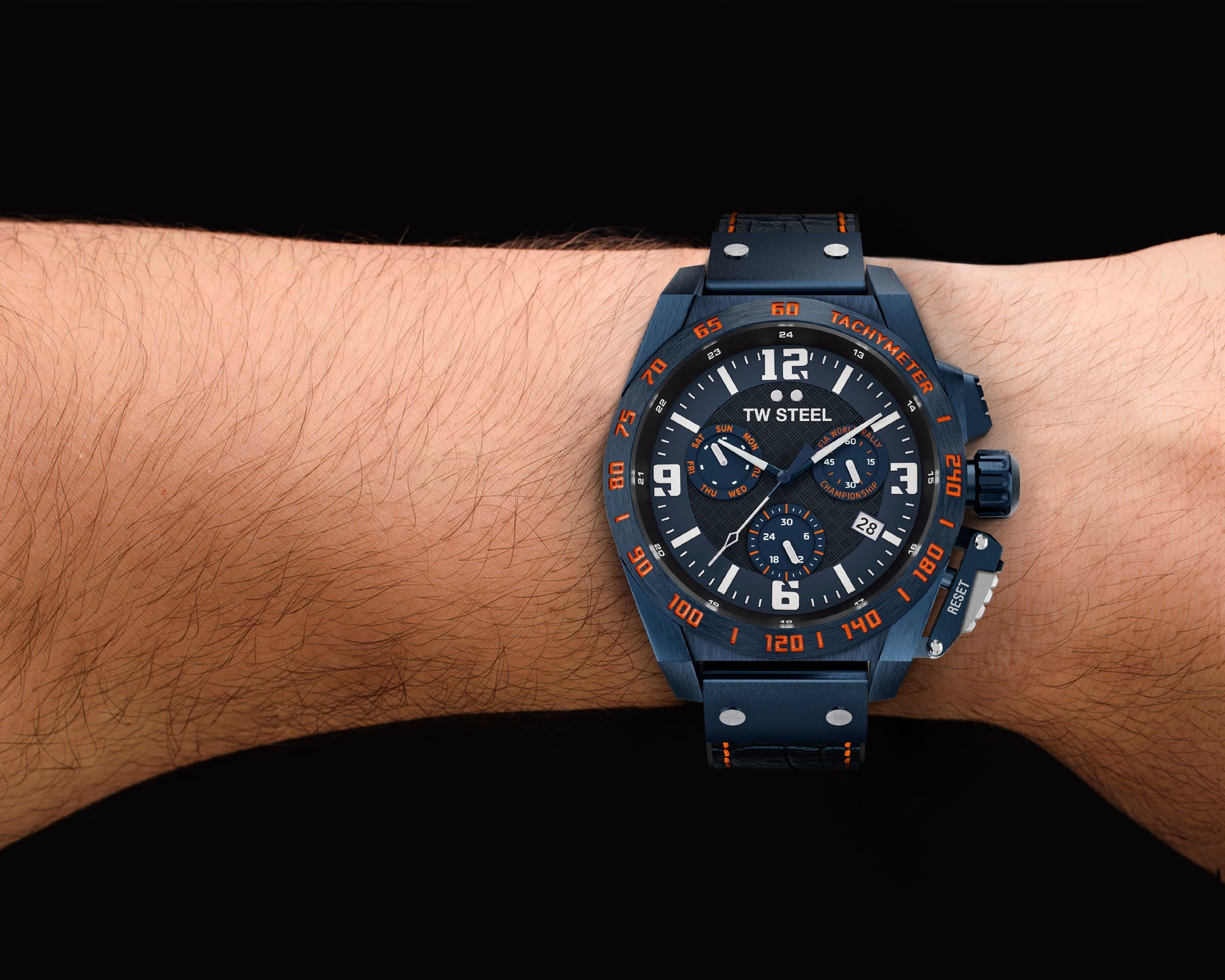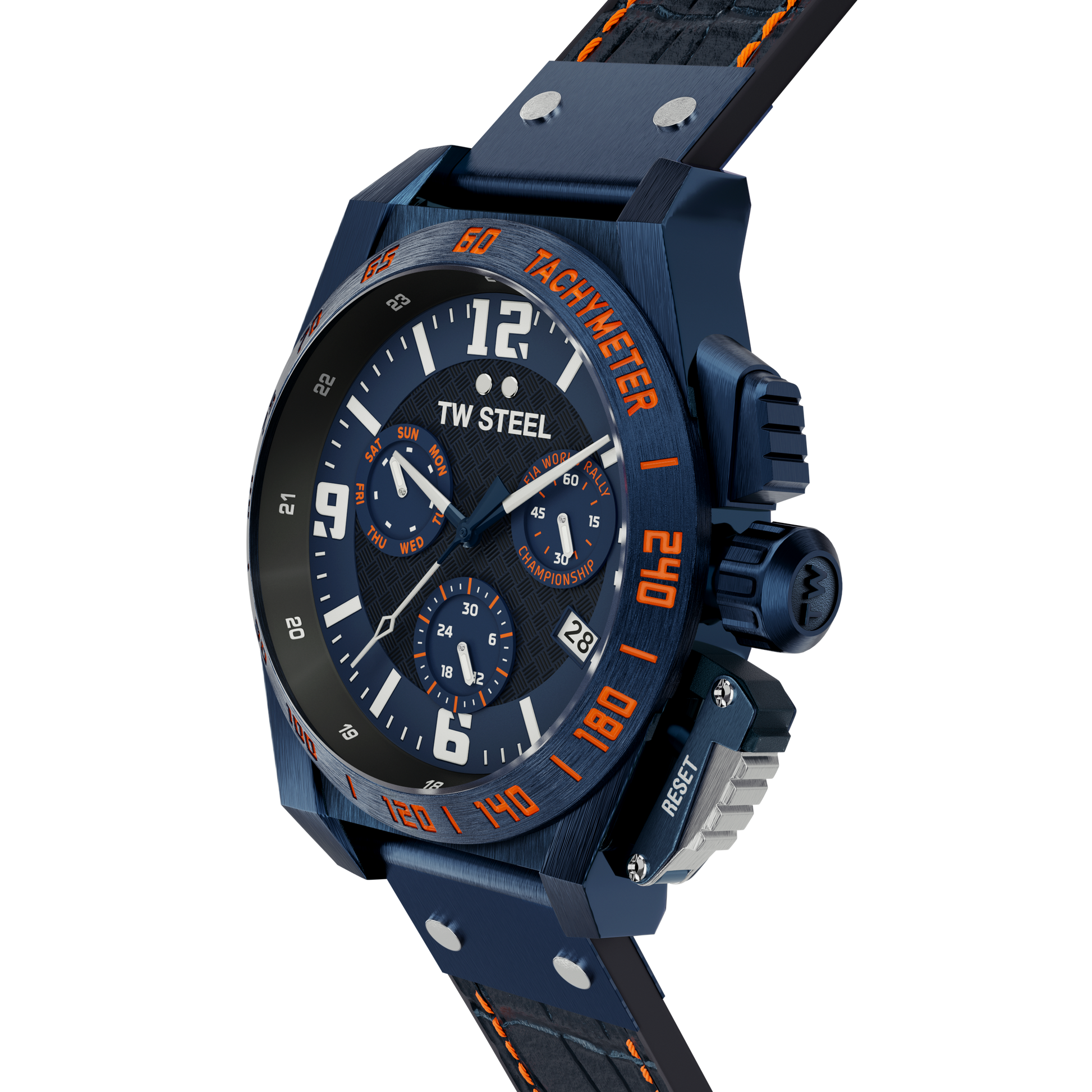 46mm Brushed Blue PVD Stainless Steel Case, Tachymeter Bezel with Orange Detail, Anti-Reflective Sapphire Crystal, Screw-Down Crown and Limited Edition WRC Engraved Caseback.