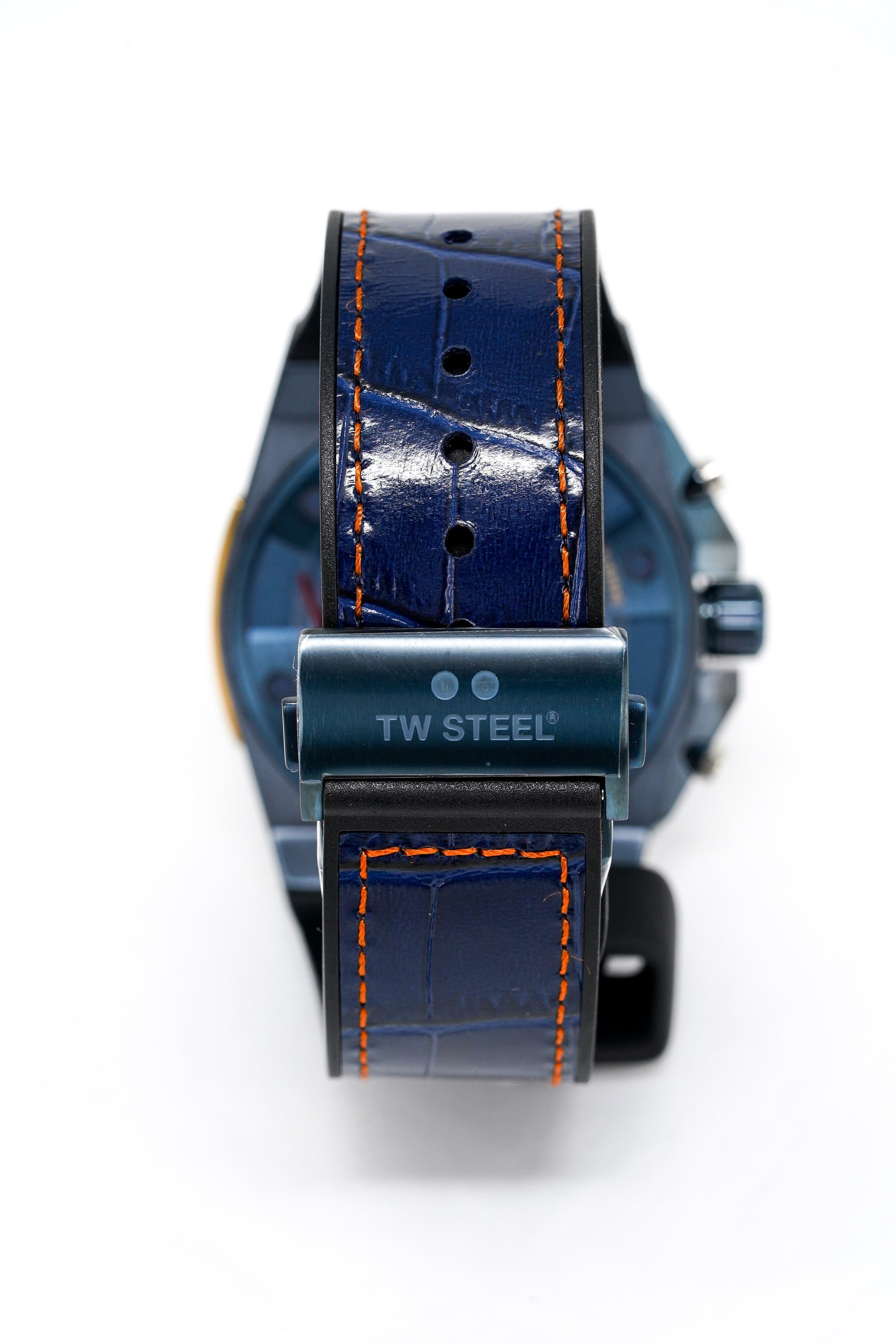 Dark Blue Crocs-Style Leather on Rubber Strap with Orange Contrast Stitching and Blue PVD Deployment Buckle.