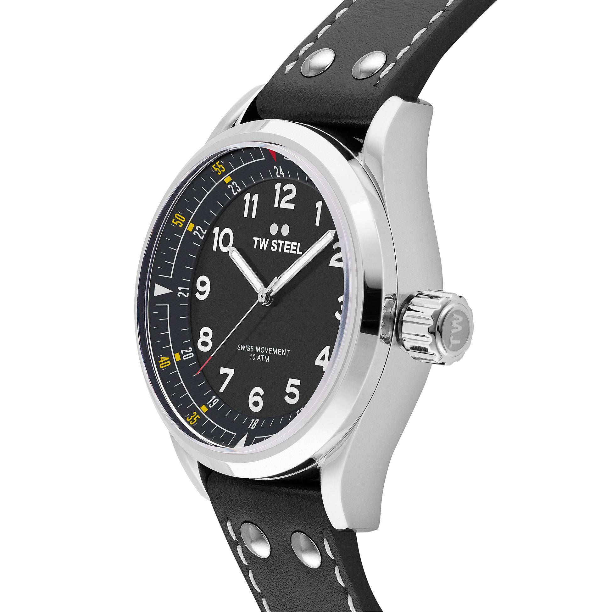 Black Italian Calf Leather Strap With White Contrast Stitching and Stainless Steel Pin Buckle.