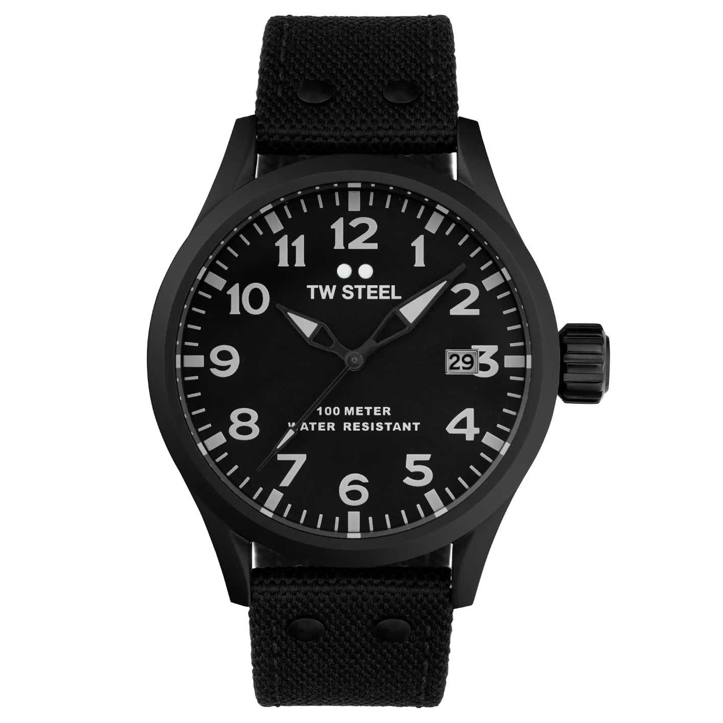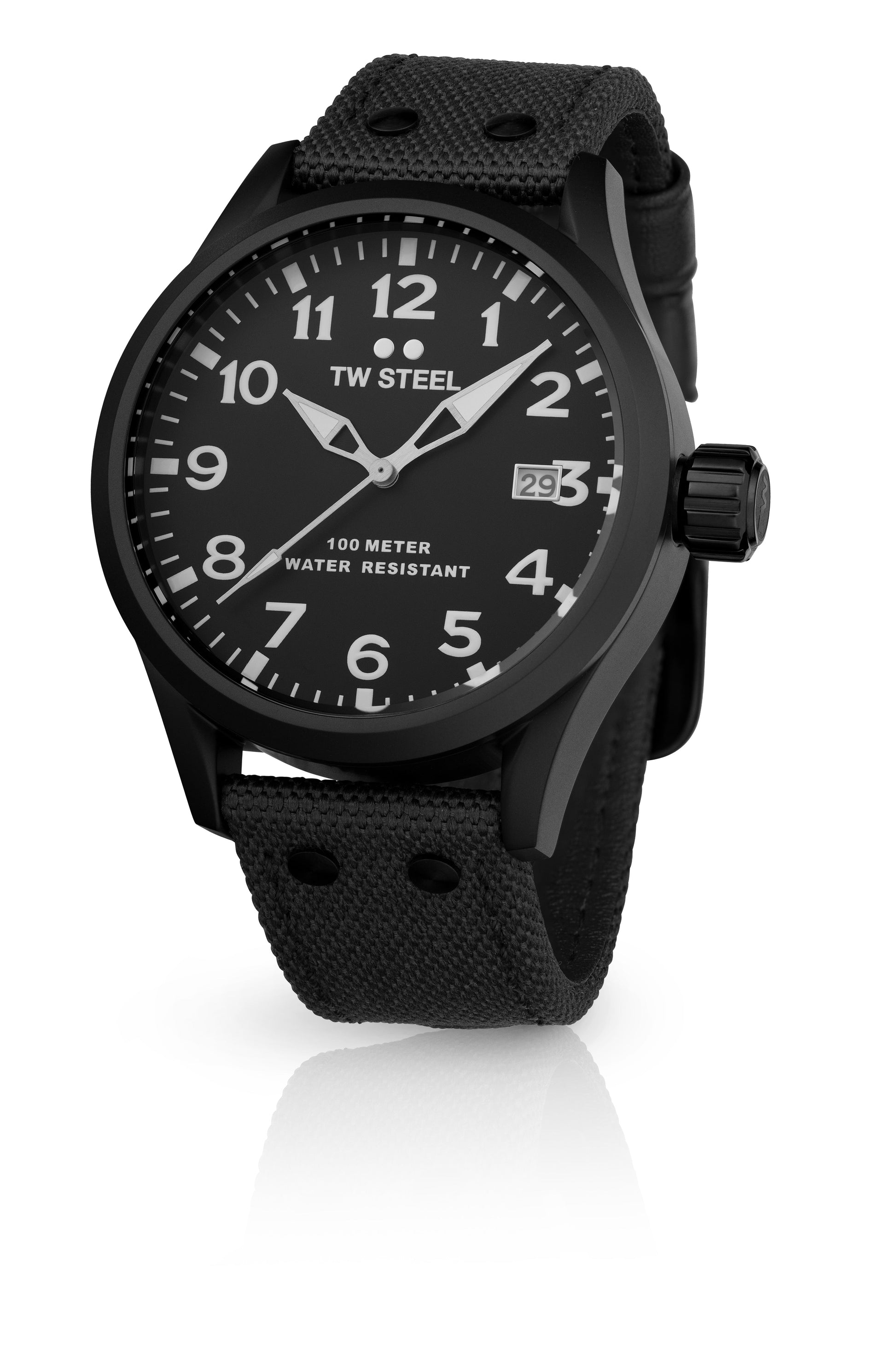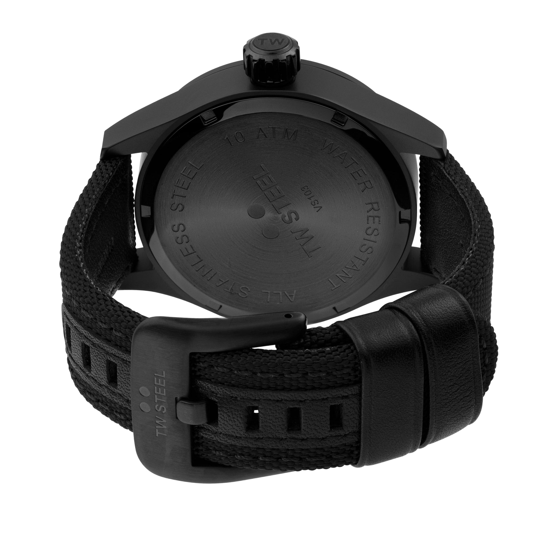 Black Canvas on Leather Strap With Matching Black Stitching and Black PVD Pin Buckle.
