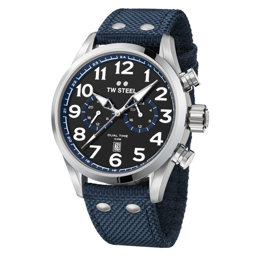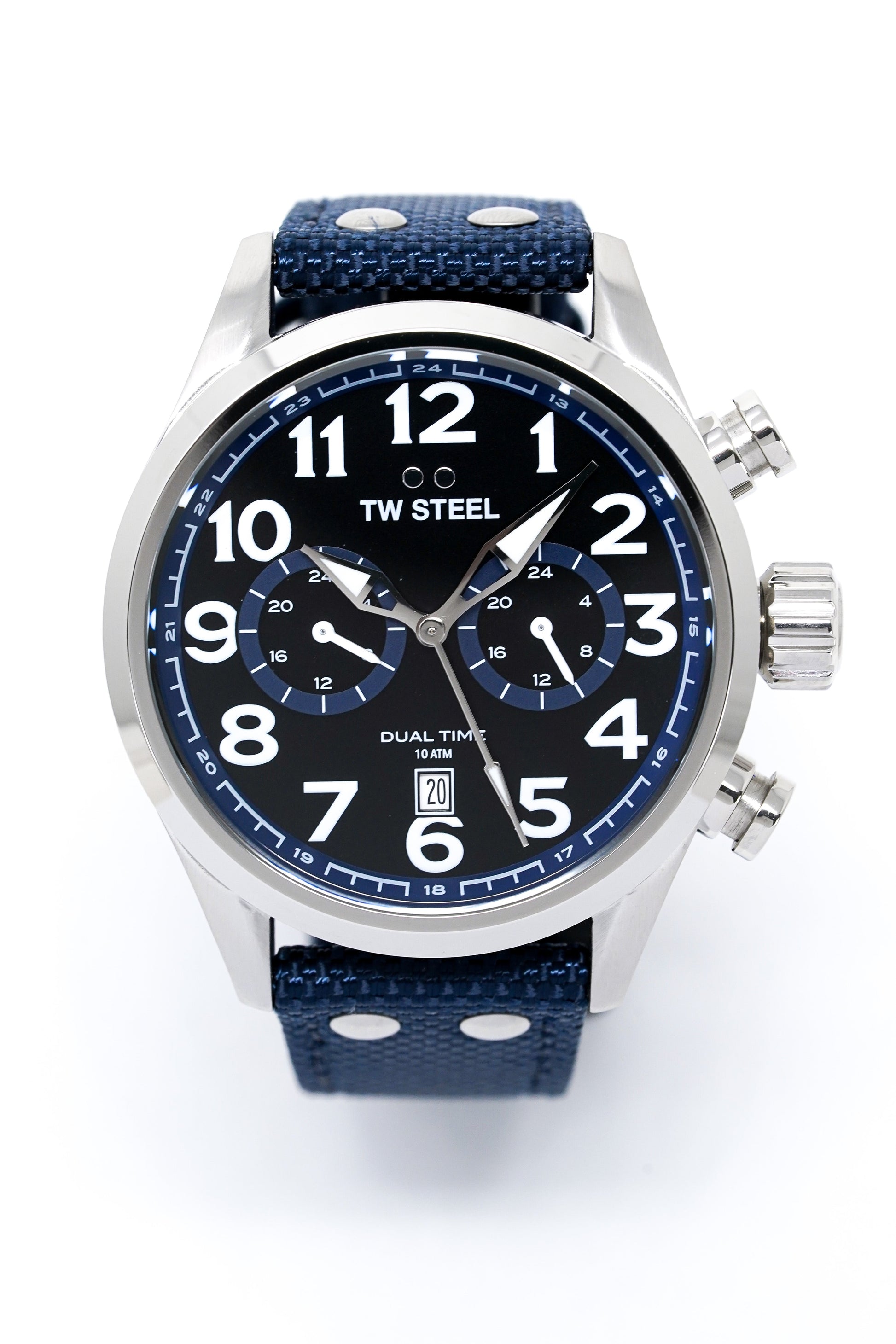 Black Dial with Blue Details. White and Steel Sword-Shaped Hands and Arabic Numeral Markers.
