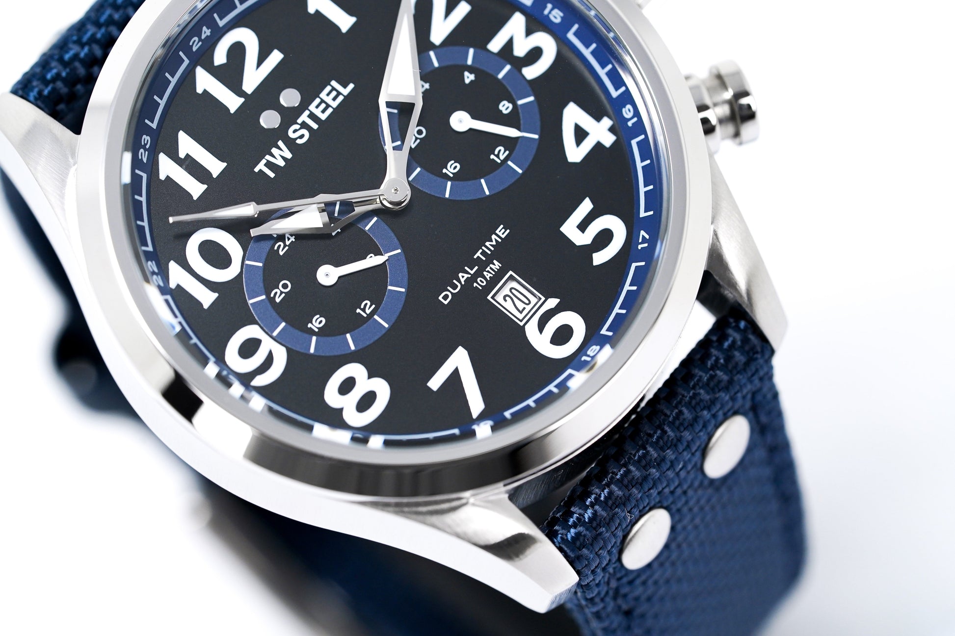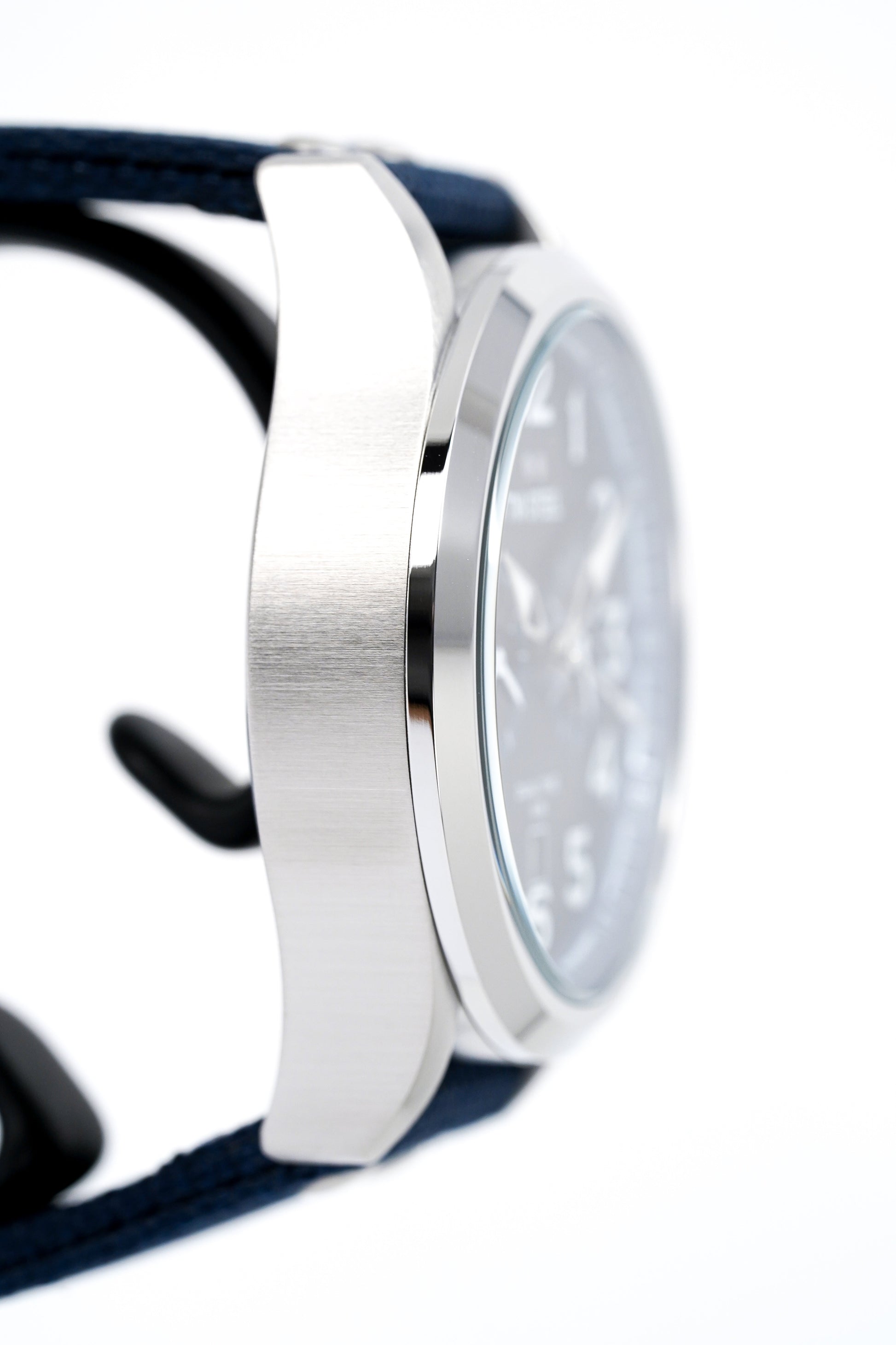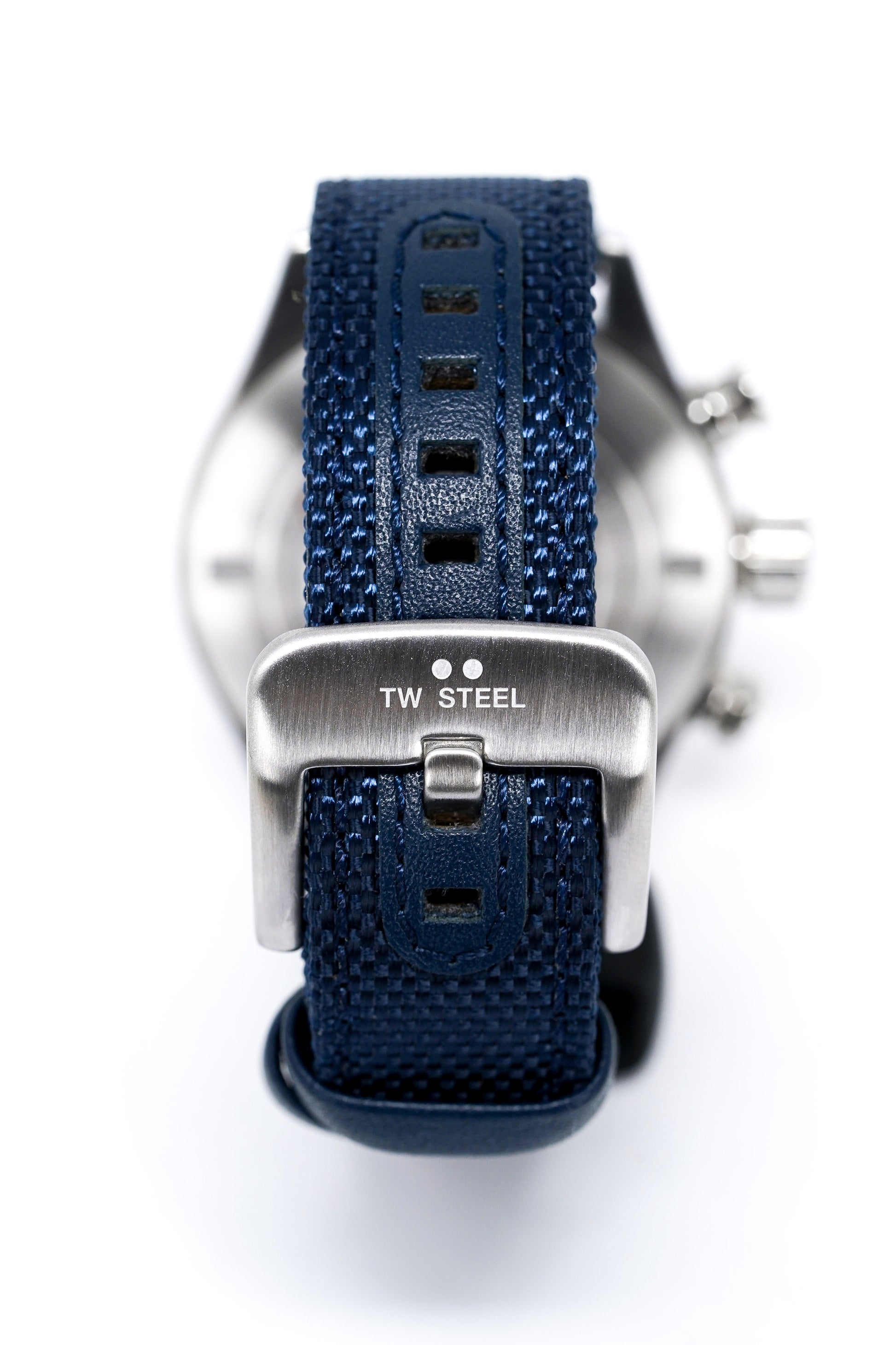 Dark Blue Textile Strap With Matching Stitching and Steel Pin Buckle.