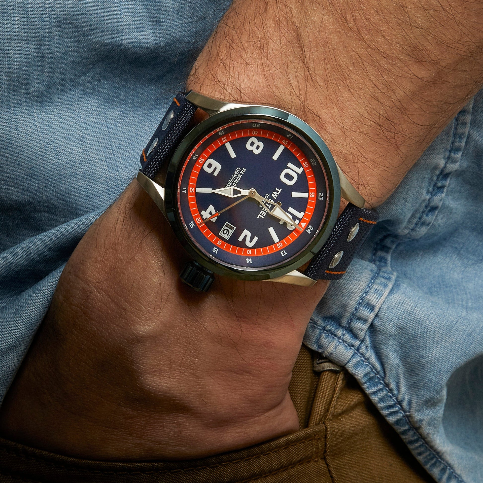 Blue Canvas on Leather Strap With Orange Contrast Stitching and Stainless Steel Pin Buckle.