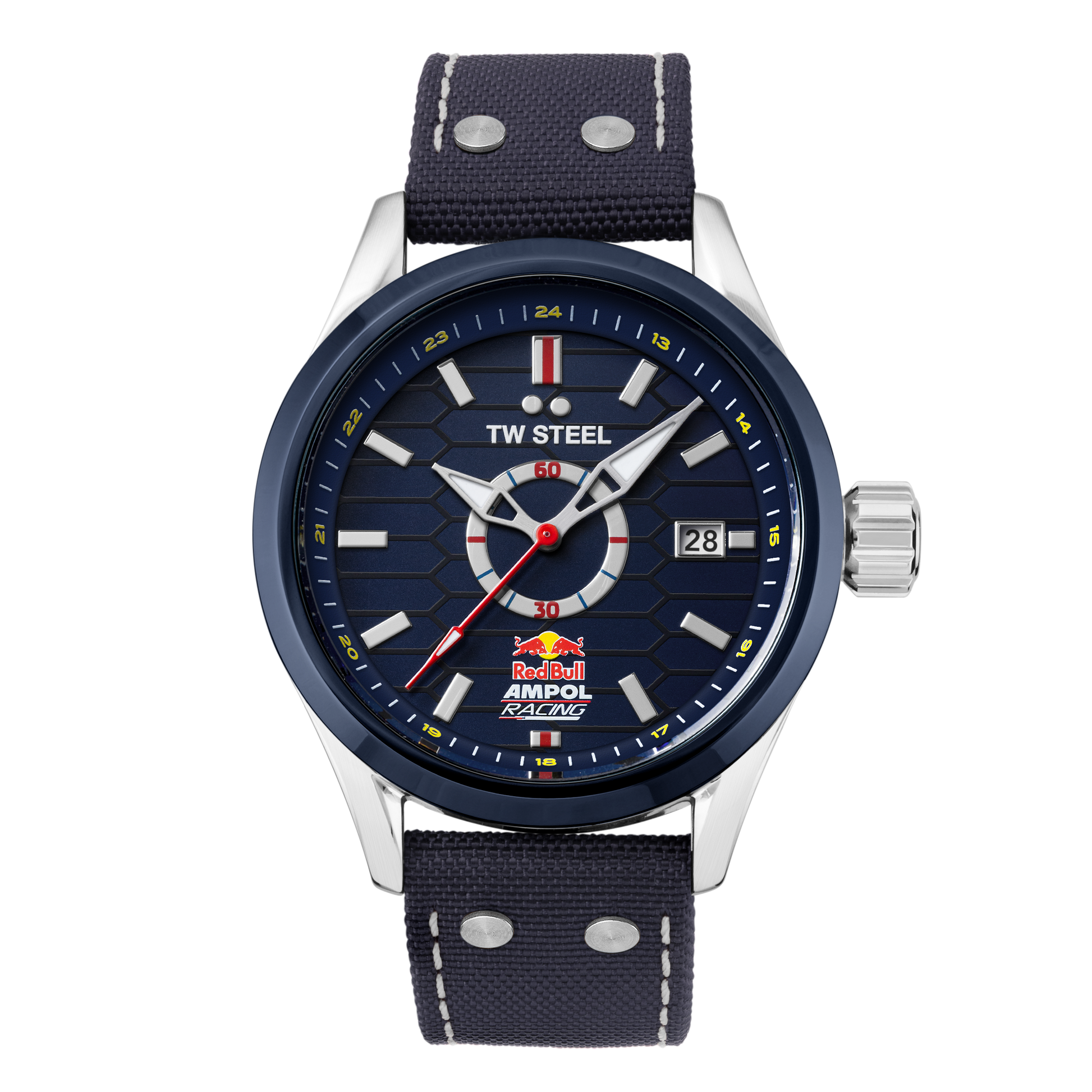 Blue Dial with Red and Silver Detail and Red Bull Ampol Racing Logo. White and Steel Sword-Shaped Hands with Baton Indices. Date Window at 3:00.