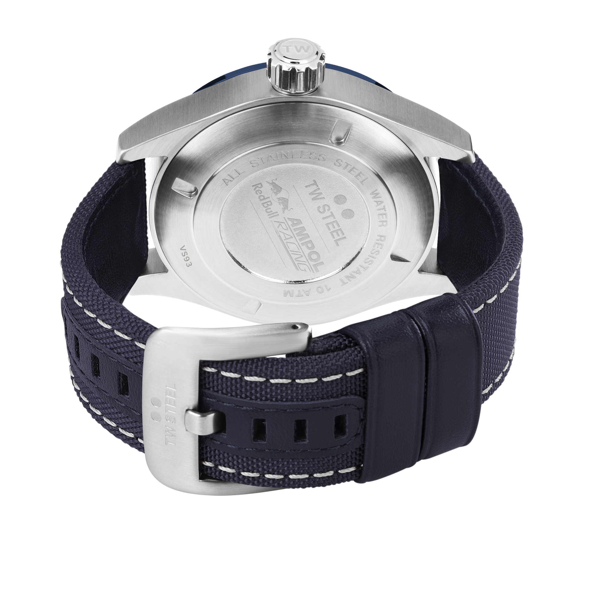 45mm 316L Brushed Stainless Steel Case With Polished Blue PVDBezel, Sapphire Coated Crystal and Red Bull Ampol Racing Engraved Caseback.