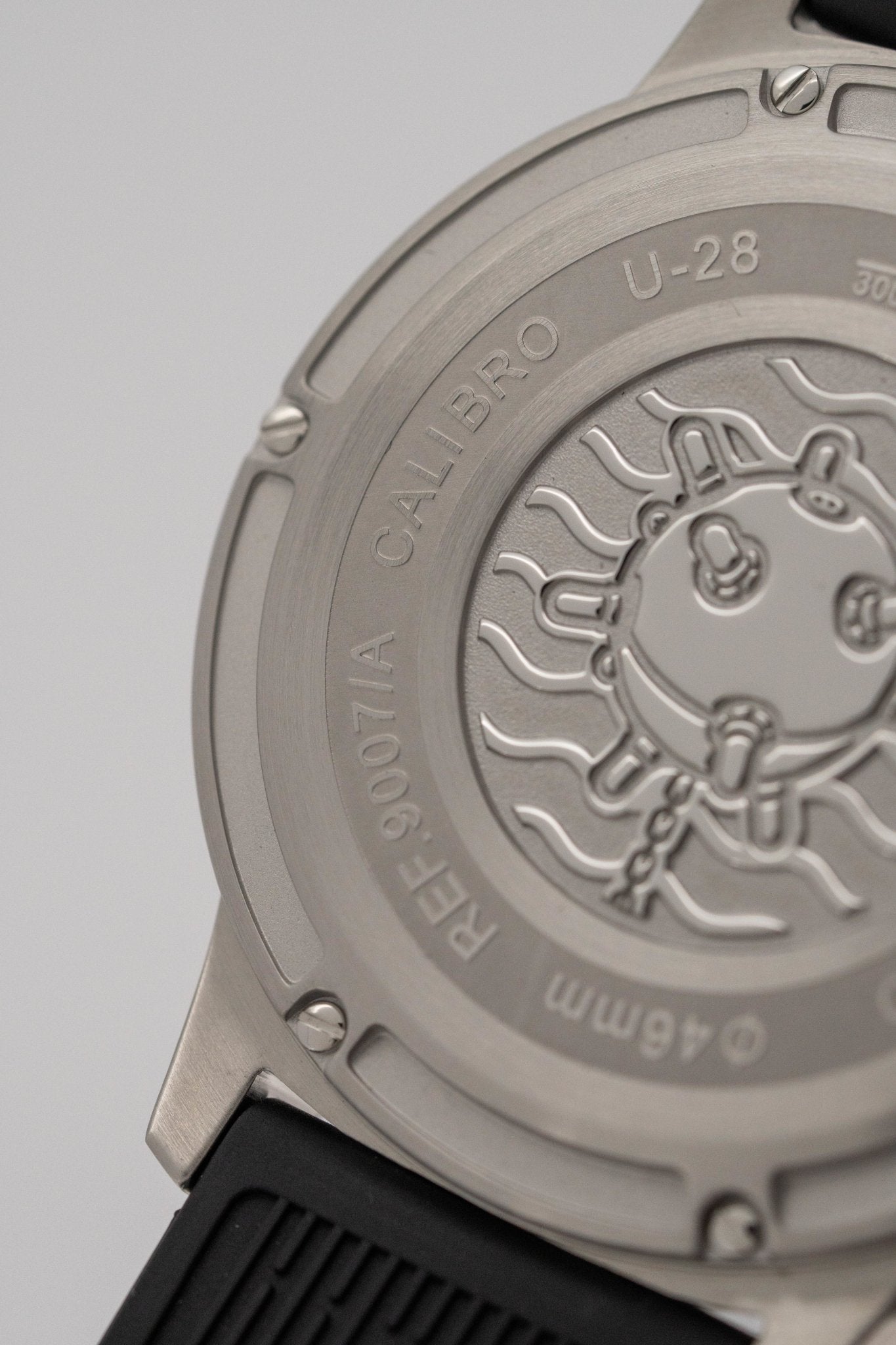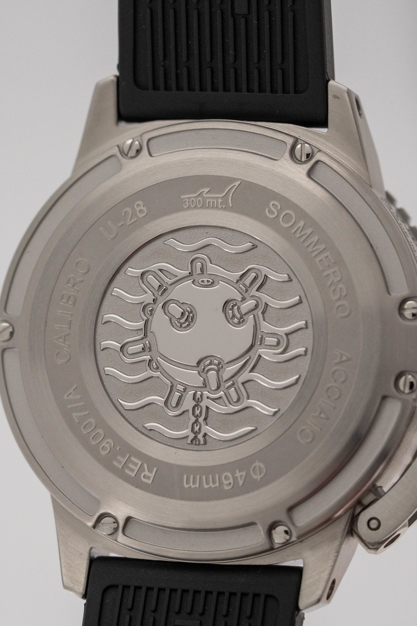 U-Boat U28 Swiss Made Automatic Movement with a Frequency of 28,800 vibrations per hour, 4 Hz. Power reserve of 38 hours - 26 Jewels. The movement is modified and personalised to U-BOAT specifications, with date display with cyclops. Stem position at 9 o’clock.