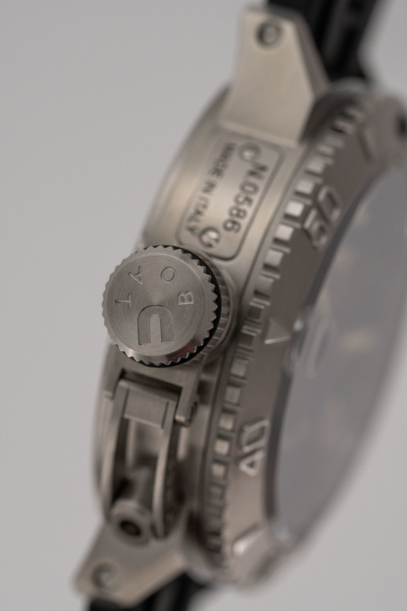 46mm x 16mm 316L Stainless Steel Case - Distinctive crown on left side with patented screw down protection device. Uni-Directional bezel. Serial number engraved on a small plate fixed to the side of the case. High Quality Sapphire Crystal Glass with Anti-Reflection Treatment