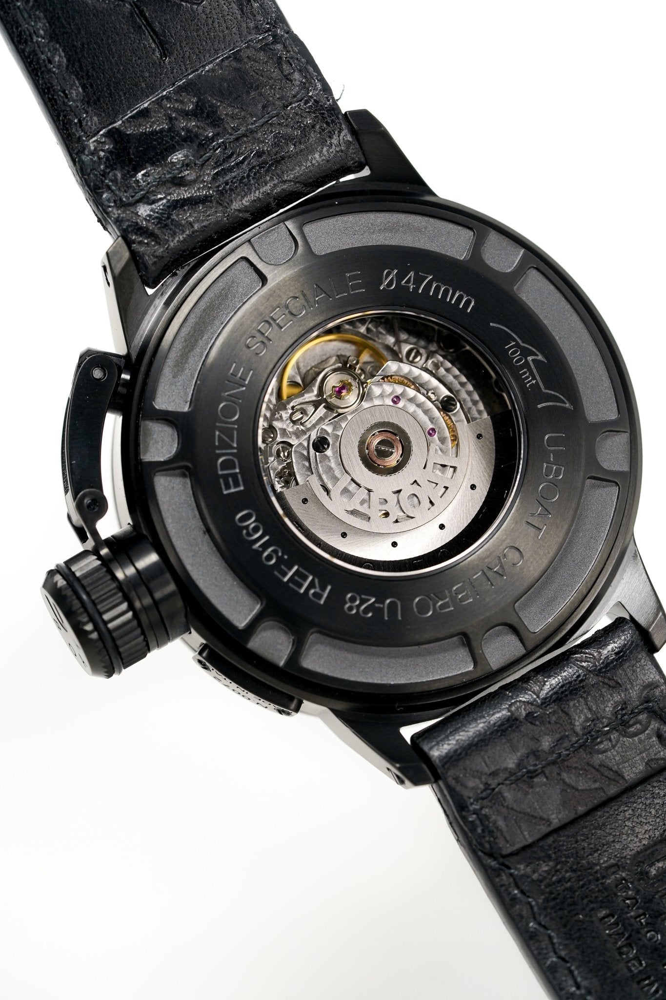 U-Boat U28 Swiss Made Automatic Movement with a Frequency of 28,800 vibrations per hour, 4 Hz. Power reserve of 38 hours - 25 Jewels. The movement is modified and personalised to U-BOAT specifications, with date display at 3 O'Clock.