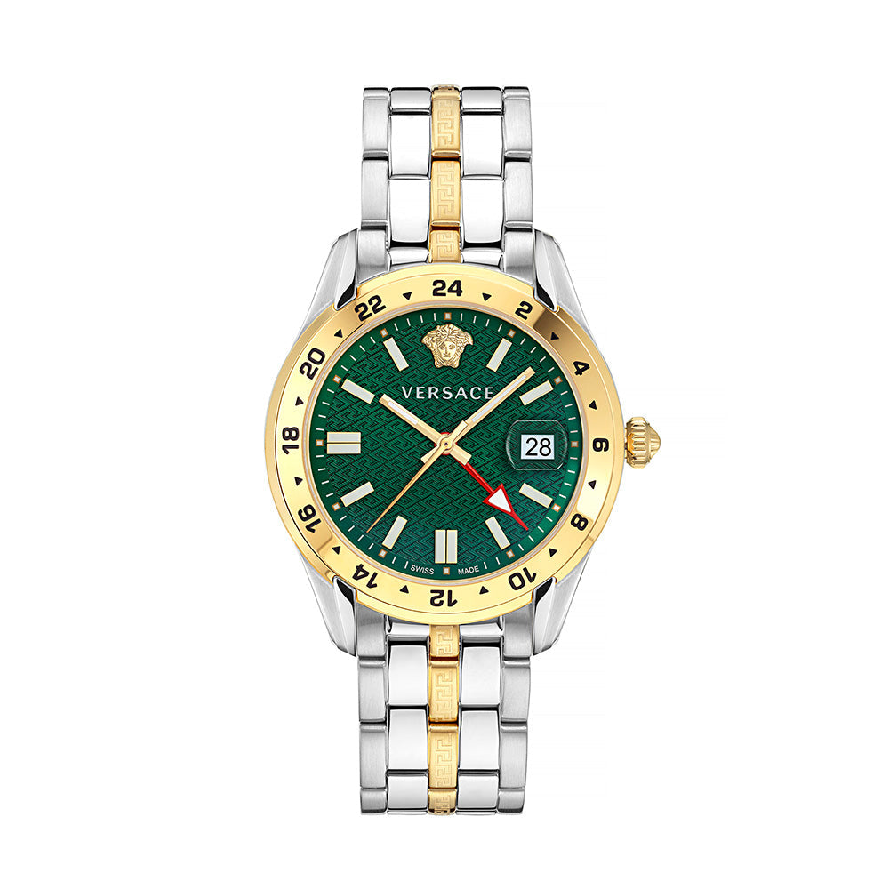 This timeless collection is back with the GMT movement. It features a sleek dial enriched with Versace la Greca pattern and a 3d Medusa at 12h. The 41mm case is enriched with a GMT movement and window date with magnificient glass at 3h. The leather strap version has the 3D Greca embossed to give an additional branding accent to the whole watch.