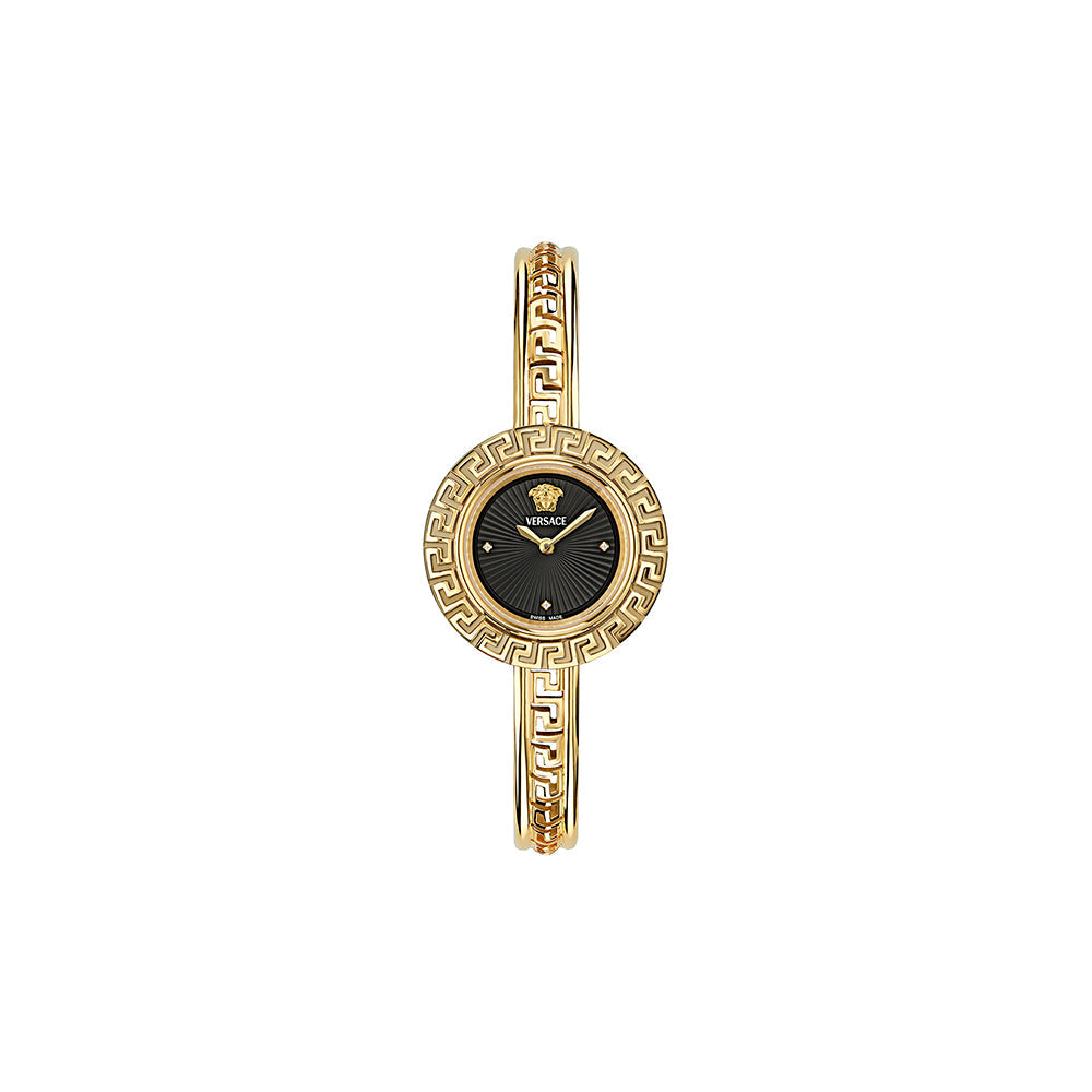This elegant and petite jewelry timepiece is characterized by a feminine 28mm case body. This unique petite timepiece is extremely rich in details: the case is shaped as an iconic tubular Greca , while the same motif enriches the Greca shaped jewelry bracelet.