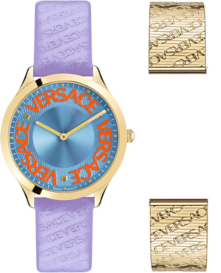 Dial: Blue Sunray Dial with Red Versace Halo Logo - Gold Plated Stainless Steel Luminous Hour and Minute Hands.