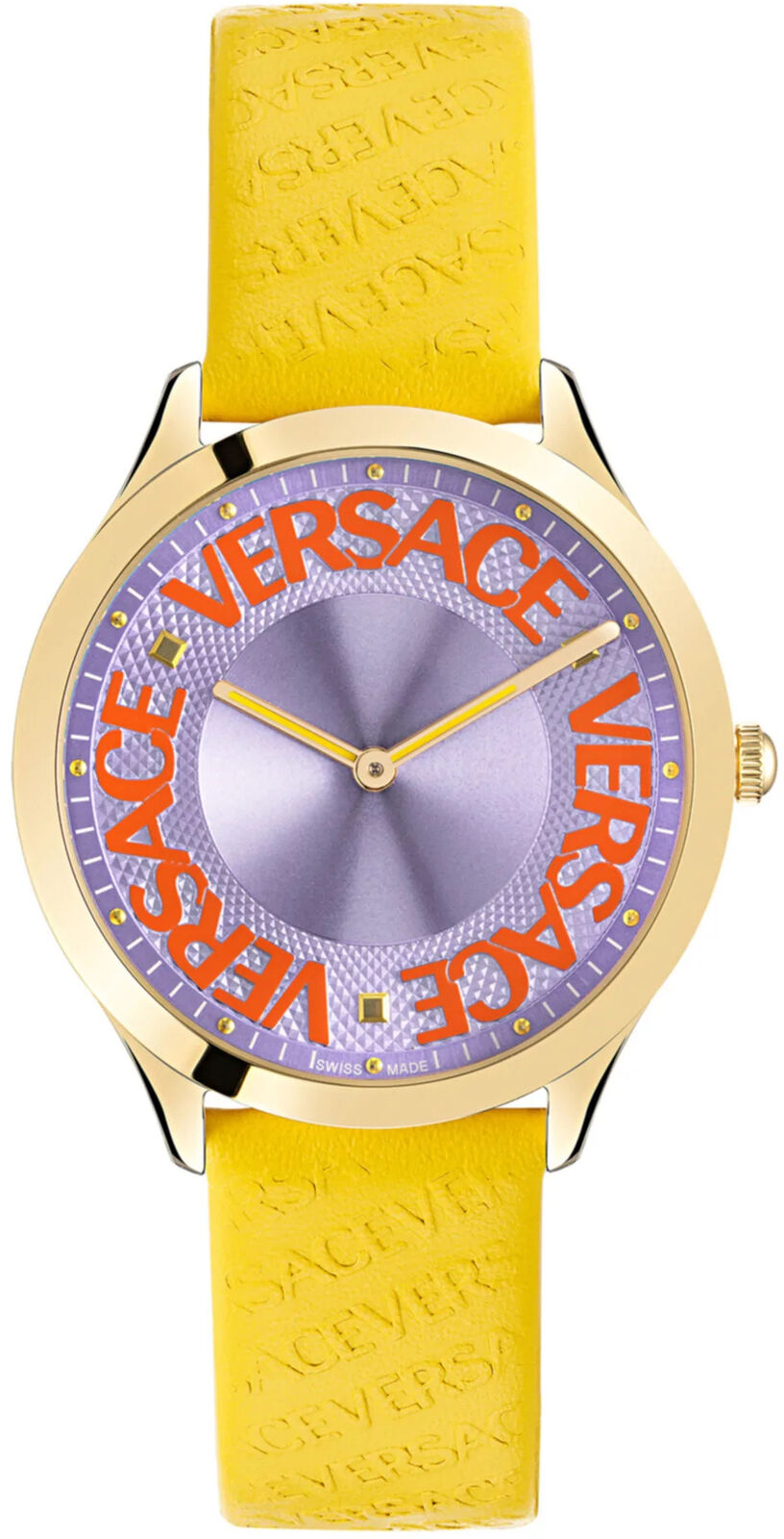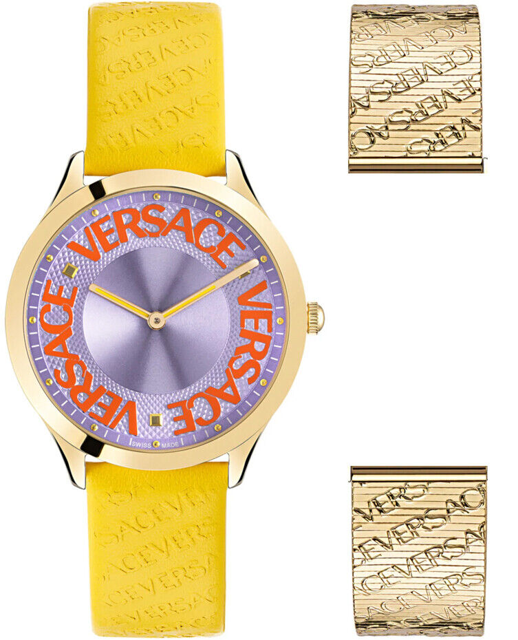 Dial: Lilac Sunray Dial with Red Versace Halo Logo - Gold Plated Stainless Steel Luminous Hour and Minute Hands.