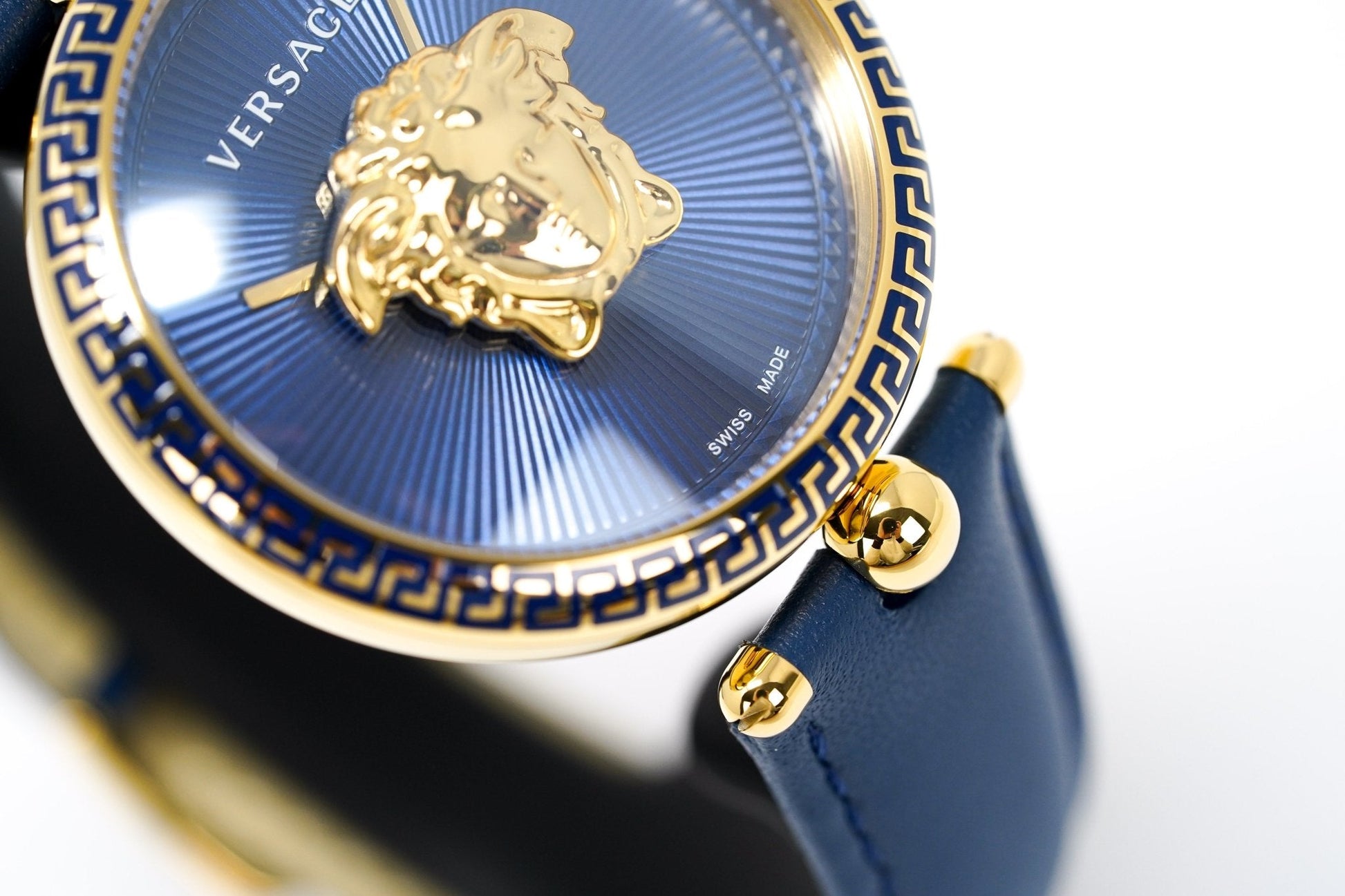 Case: 39mm x 12mm Polished Gold PVD 316L Stainless Steel Case with Versace Shape Blue Enamel Bezel - Solid 316L Stainless Steel Caseback with Medusa Head Engraving - Anti-Reflective Sapphire Crystal Glass - Push-Pull Crown.
