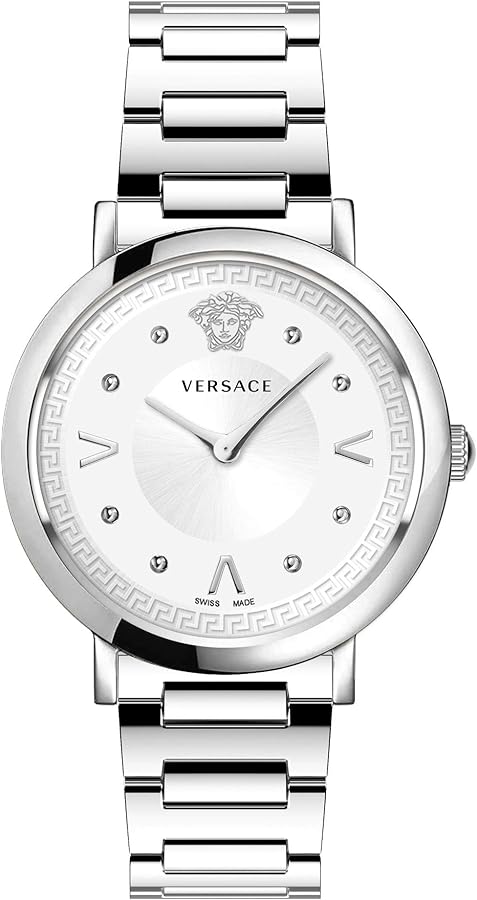 Case: 36mm x 8mm Polished 316L Stainless Steel Case - Solid Stainless Steel Caseback with Versace Engraving - Anti-Reflective Sapphire Crystal Glass - Push-Pull Crown.