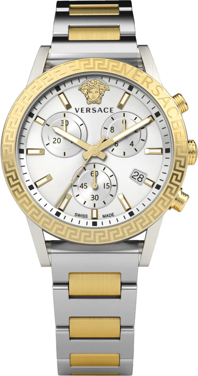 Case: 40mm x 12mm 316L Stainless Steel Case with IP Gold Pushers and Gold Plated Greca Patterned Bezel - Solid 316L Stainless Steel Caseback with Medusa Head Engraving - Anti-Reflective Sapphire Crystal Glass - Push-Pull Crown.