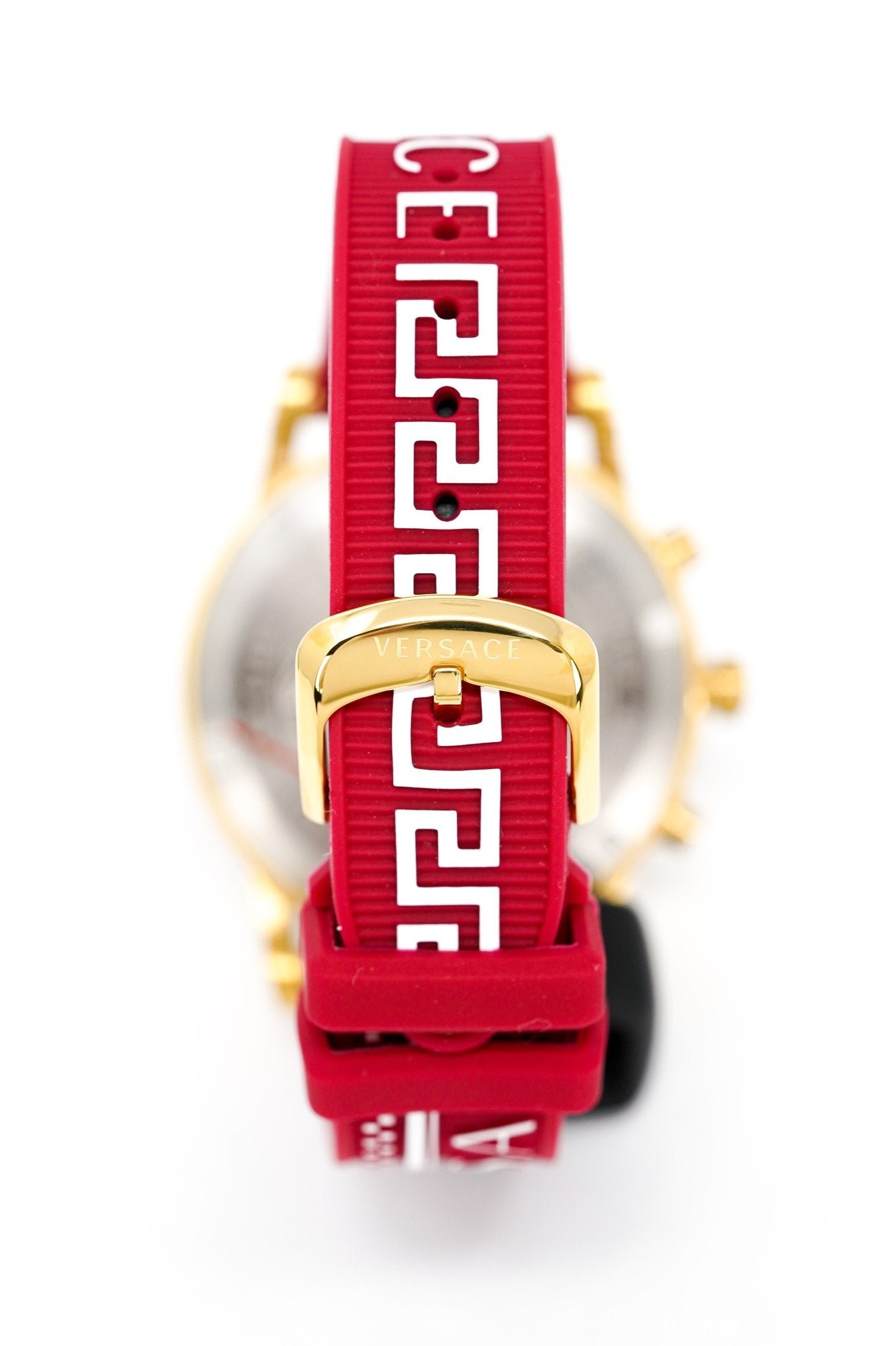 Strap / Bracelet: 19/15mm x 16cm Red Silicone Strap with White Versace Text and Greca Details - Gold PVD 316L Stainless Steel Pin Buckle.